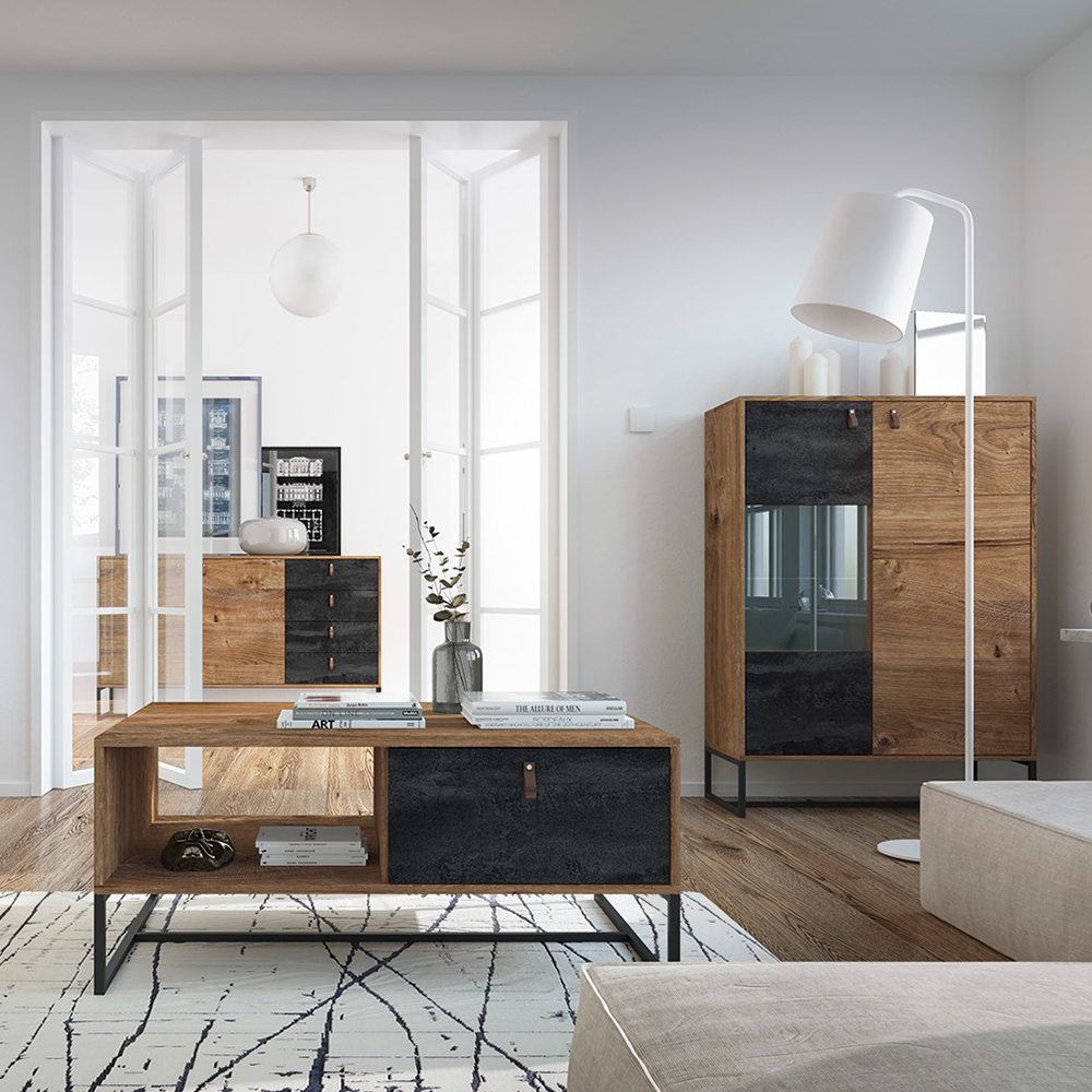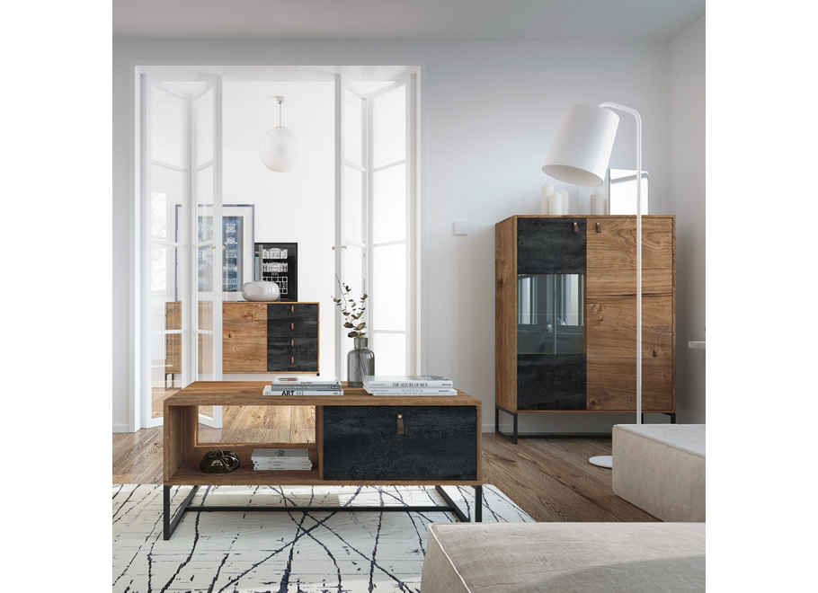 Nasza witryna doskonale łączy w sobie nowoczesny design z funkcjonalnością, idealnie komponując się w każdym salonie. Kontrastowe połączenie czarnej postawy z dwoma kolorami dekorów Dąb Ribbeck i czarny kamień. Całość formy dopełnia skórzany uchwyt z mosiężnym mocowaniem.