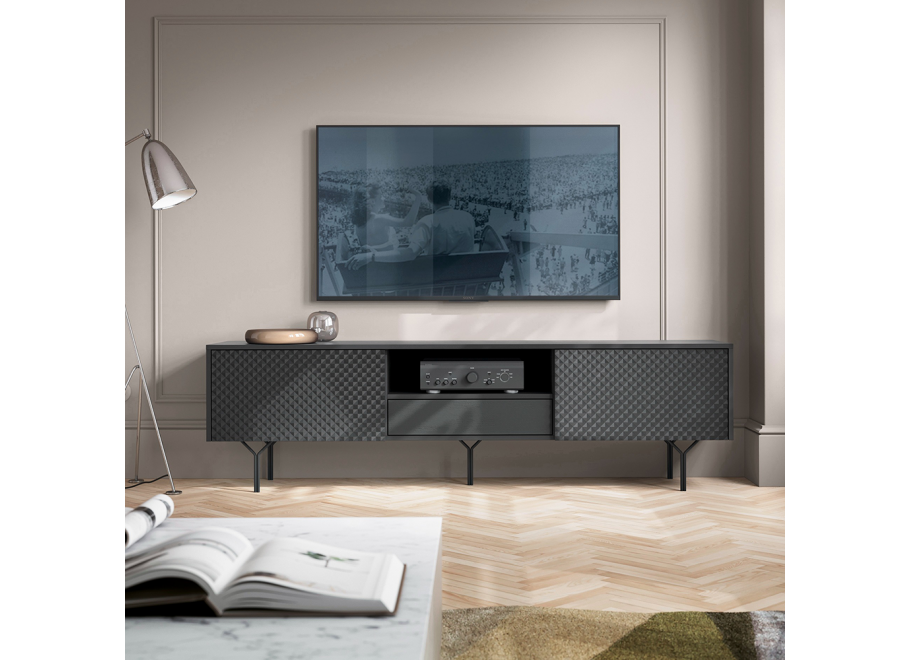 Fronty obu bocznych szafek posiadają wyraźną teksturę, składającą się z trójkątnych wzorów, które tworzą efekt 3D, nadając meblowi nowoczesny wygląd. Środkowa część stolika posiada otwartą półkę oraz szufladę poniżej, w tylnej części otwartej przestrzeni znajduje się okrągły otwór na kable, co pomaga w utrzymaniu porządku w przewodach.