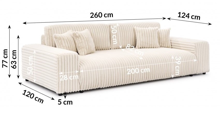 Dzięki kompaktowym rozmiarom świetnie sprawdzi się w mniejszych pomieszczeniach, takich jak salon czy sypialnia, zapewniając komfortowy wypoczynek dla trzech osób.