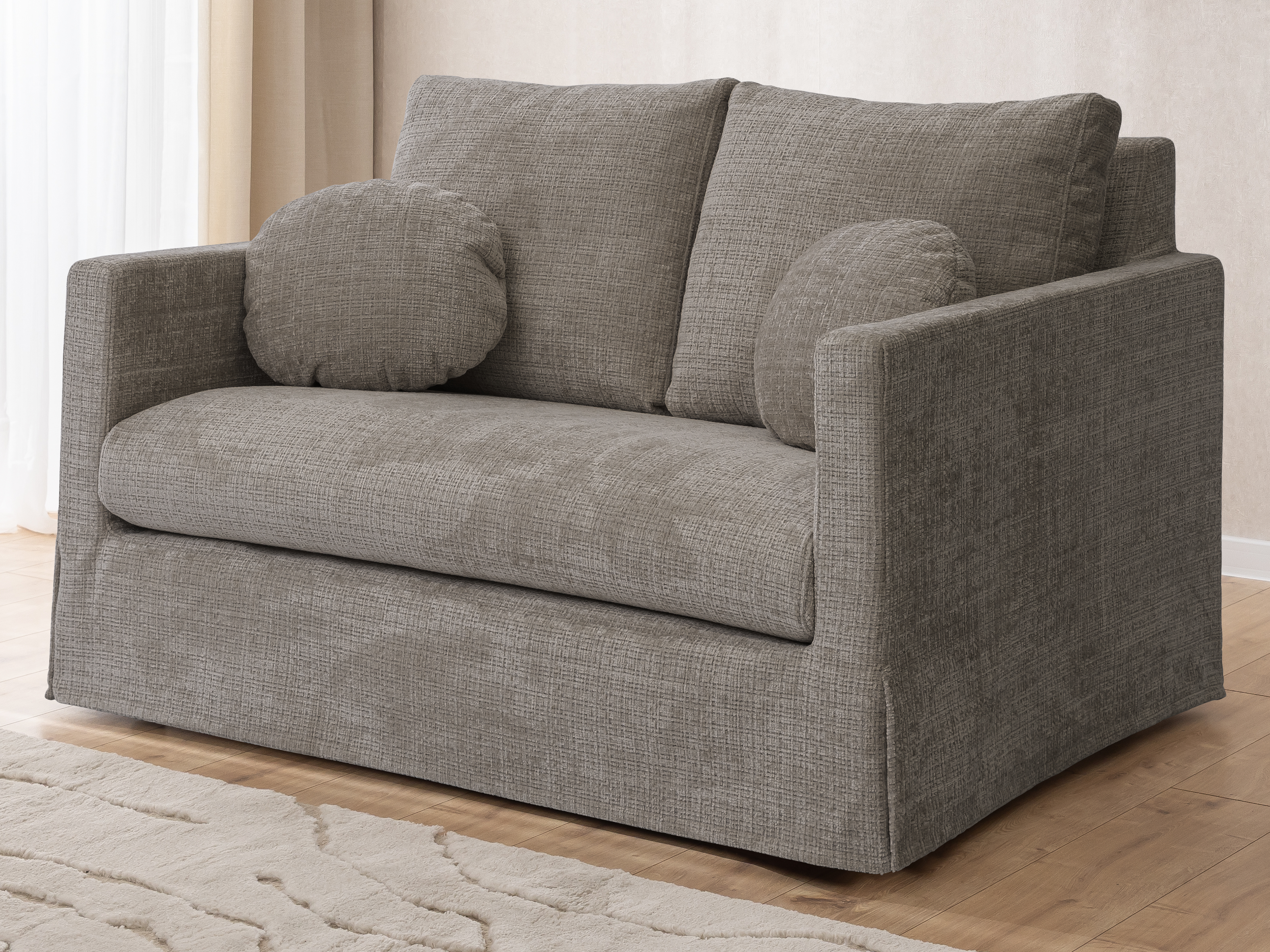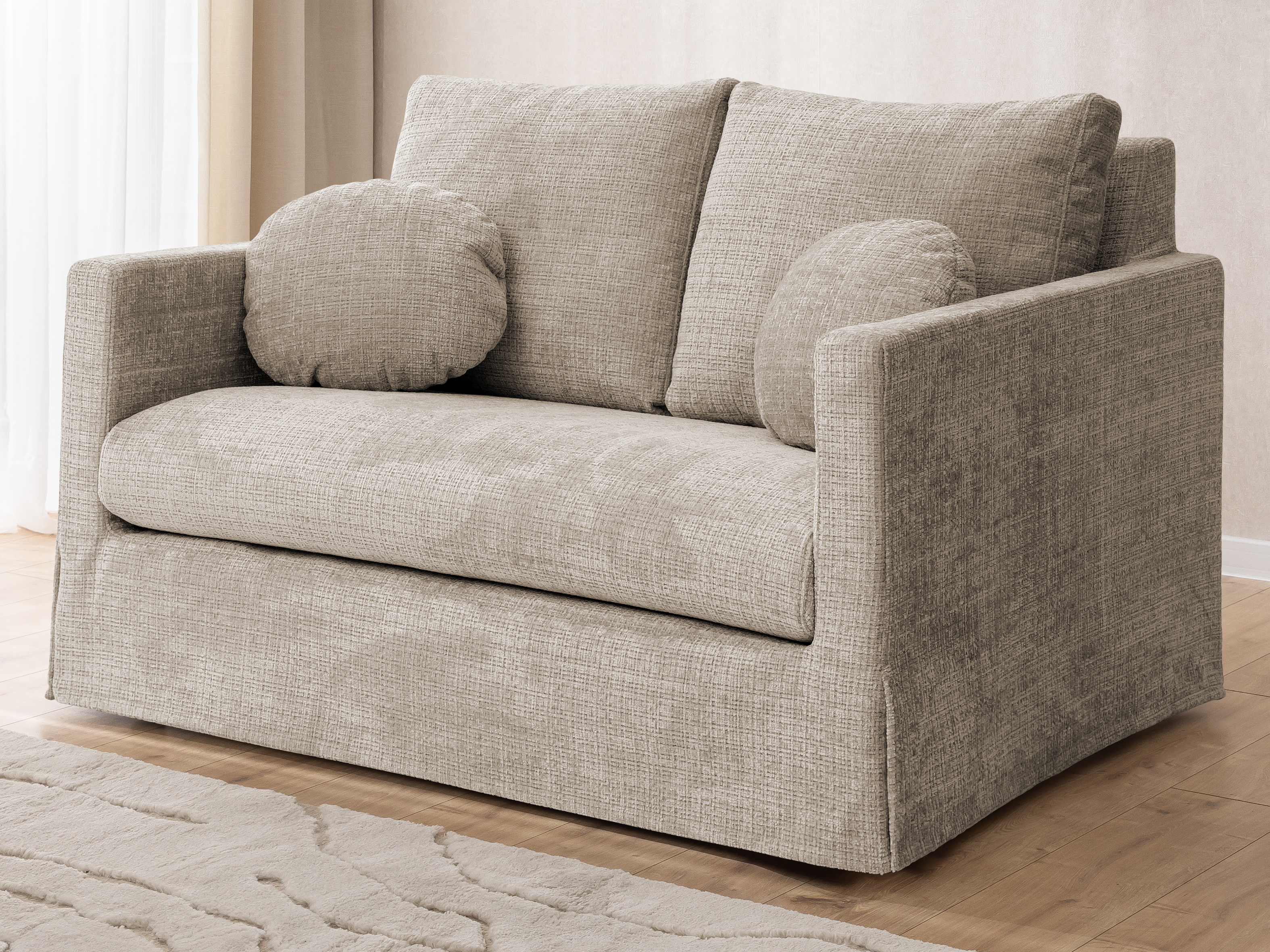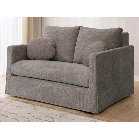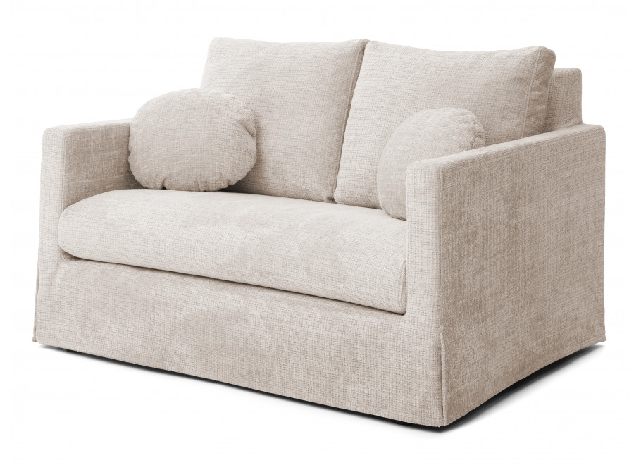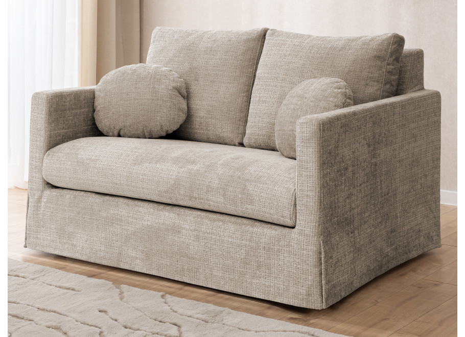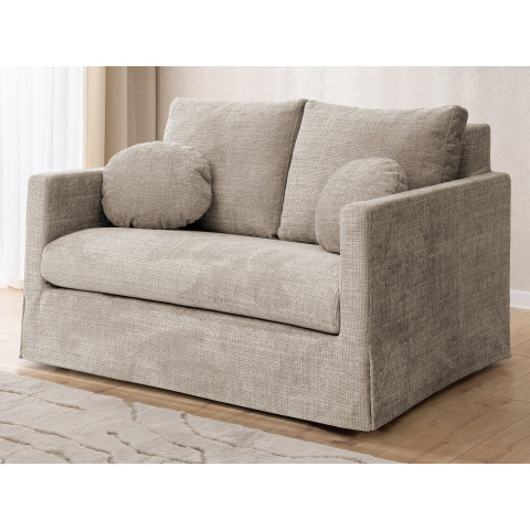 Dwuosobowa sofa prezentowana na zdjęciu to połączenie nowoczesnej formy, subtelnej elegancji i wyjątkowej wygody, które doskonale odnajdzie się w każdym wnętrzu – od minimalistycznych po bardziej klasyczne aranżacje. Proste, geometryczne linie i delikatna tapicerka w jasnym odcieniu nadają jej lekkości i przytulnego charakteru. Sofa została wyposażona w miękkie poduchy oparciowe oraz dwie ozdobne, okrągłe poduszki, które podkreślają jej estetyczny wygląd i zwiększają komfort użytkowania.