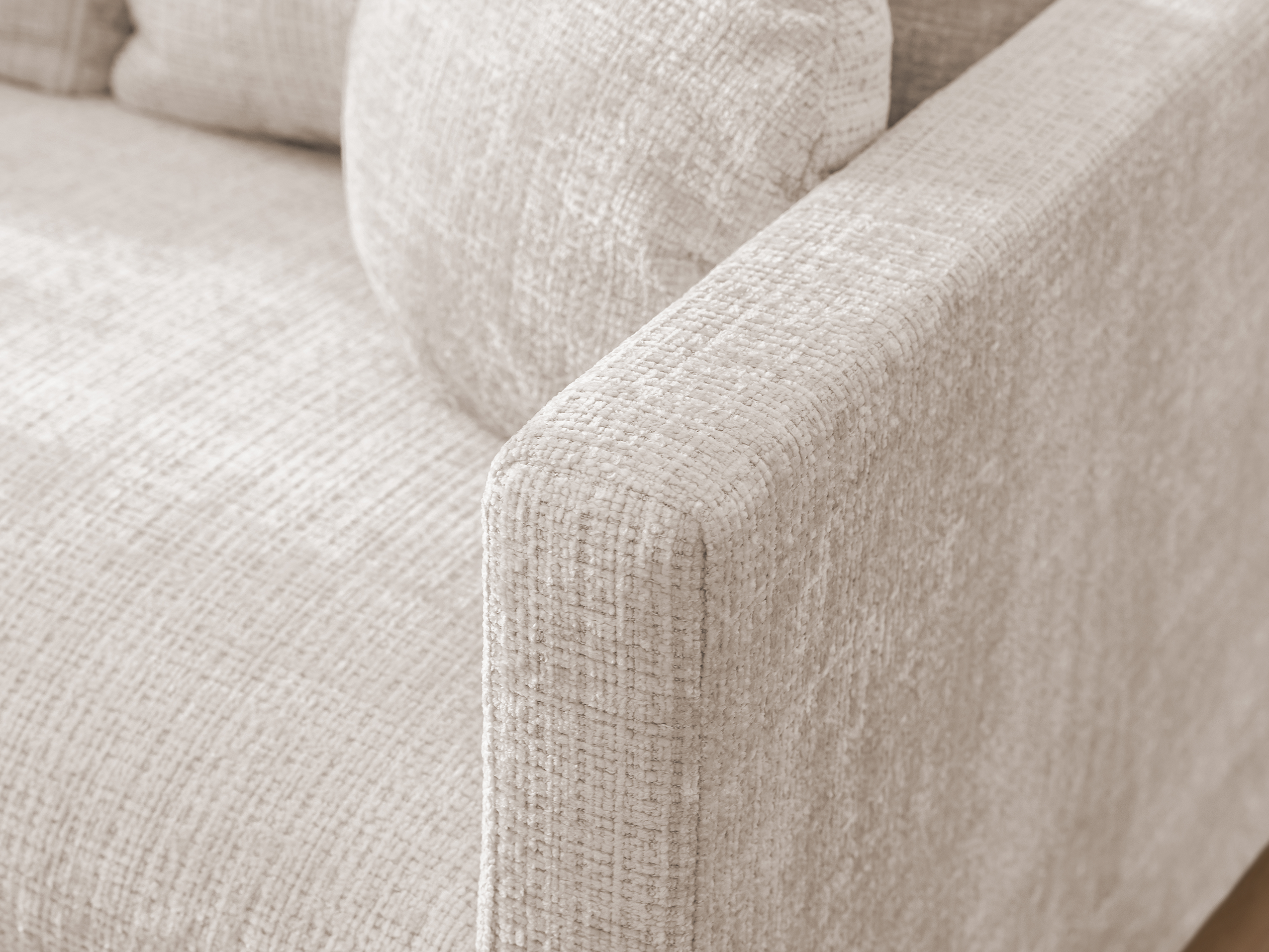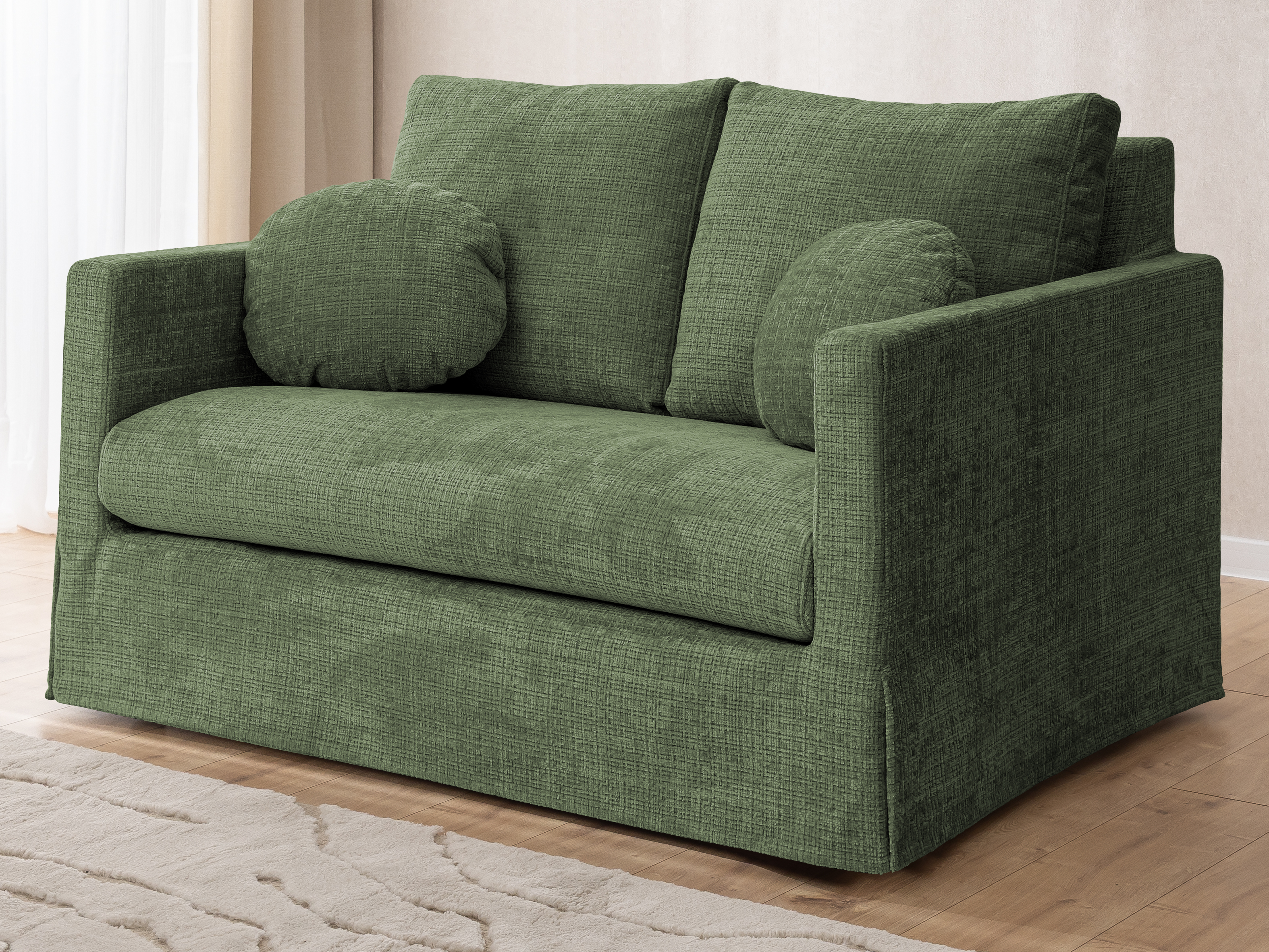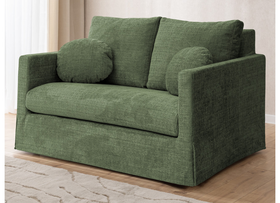 Dwuosobowa sofa prezentowana na zdjęciu to połączenie nowoczesnej formy, subtelnej elegancji i wyjątkowej wygody, które doskonale odnajdzie się w każdym wnętrzu – od minimalistycznych po bardziej klasyczne aranżacje. Proste, geometryczne linie i delikatna tapicerka w jasnym odcieniu nadają jej lekkości i przytulnego charakteru. Sofa została wyposażona w miękkie poduchy oparciowe oraz dwie ozdobne, okrągłe poduszki, które podkreślają jej estetyczny wygląd i zwiększają komfort użytkowania.