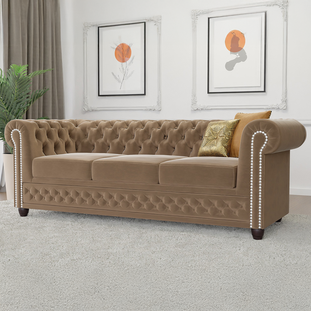 Ciepły beż w welurowym wydaniu podkreśla przytulny, a jednocześnie stylowy charakter sofy FELIX. To kolor, który doskonale komponuje się z drewnem, złotymi akcentami czy naturalnymi tkaninami.