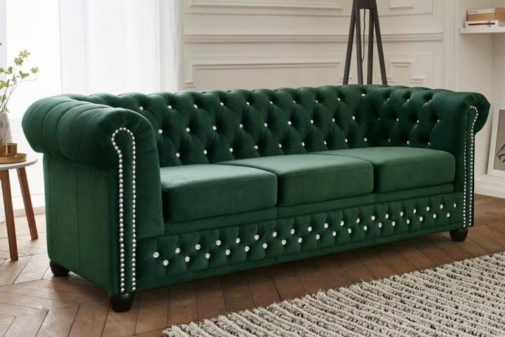 Wersja sofy FELIX w odcieniu butelkowej zieleni to propozycja, która łączy elegancję z modnym, głębokim kolorem. Srebrne kryształki umieszczone w pikowaniach dodają jej subtelnego blasku i oryginalności, nie zaburzając klasycznej formy Chesterfield.