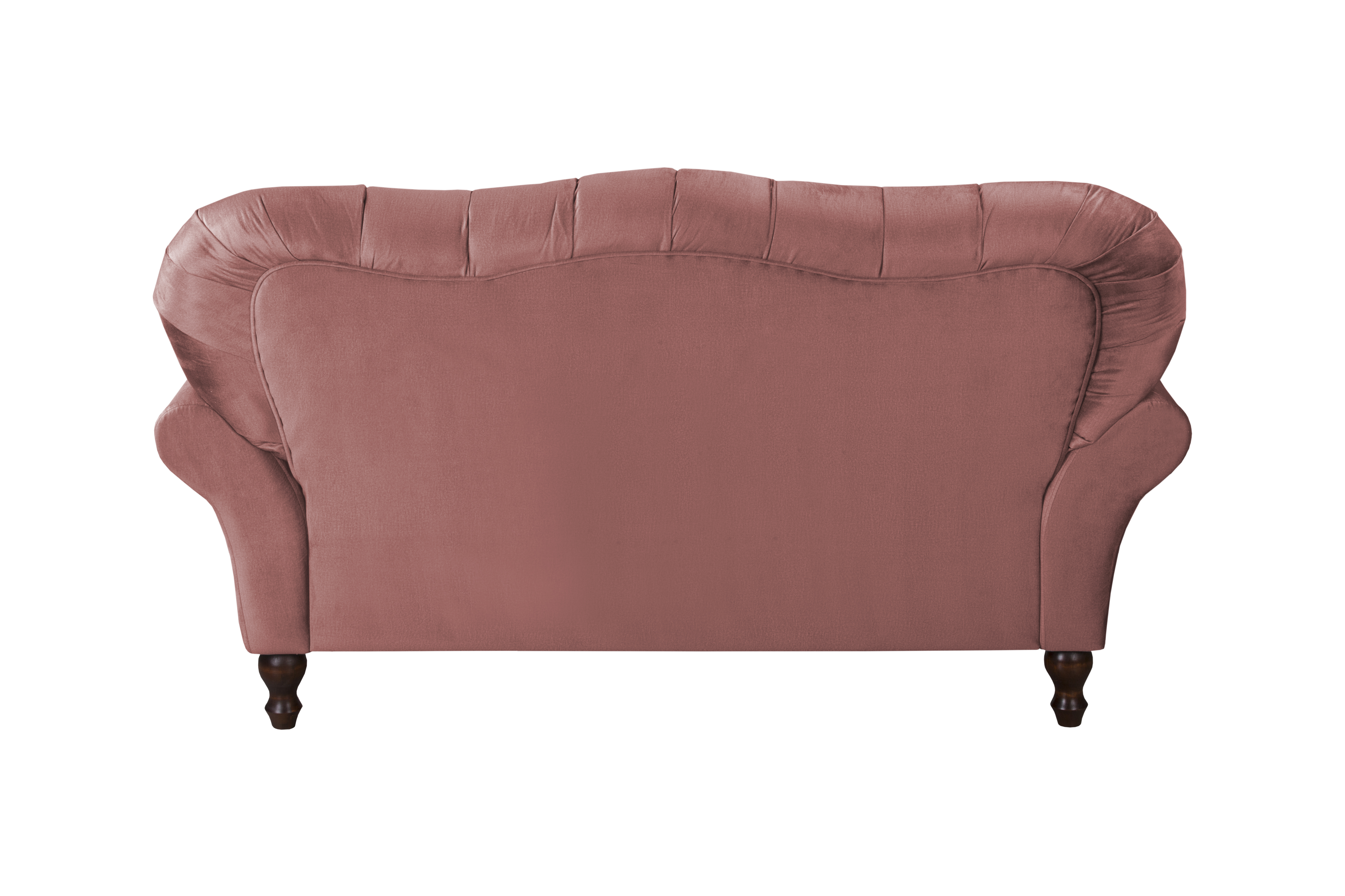 Wysokość oparcia (53 cm) i szerokie, 27-centymetrowe podłokietniki pozwalają na wygodne ułożenie się podczas odpoczynku. Sofa stoi na drewnianych nóżkach o wysokości 15 cm – ich naturalny odcień świetnie współgra z pudrowym różem, podkreślając klasyczną elegancję mebla.