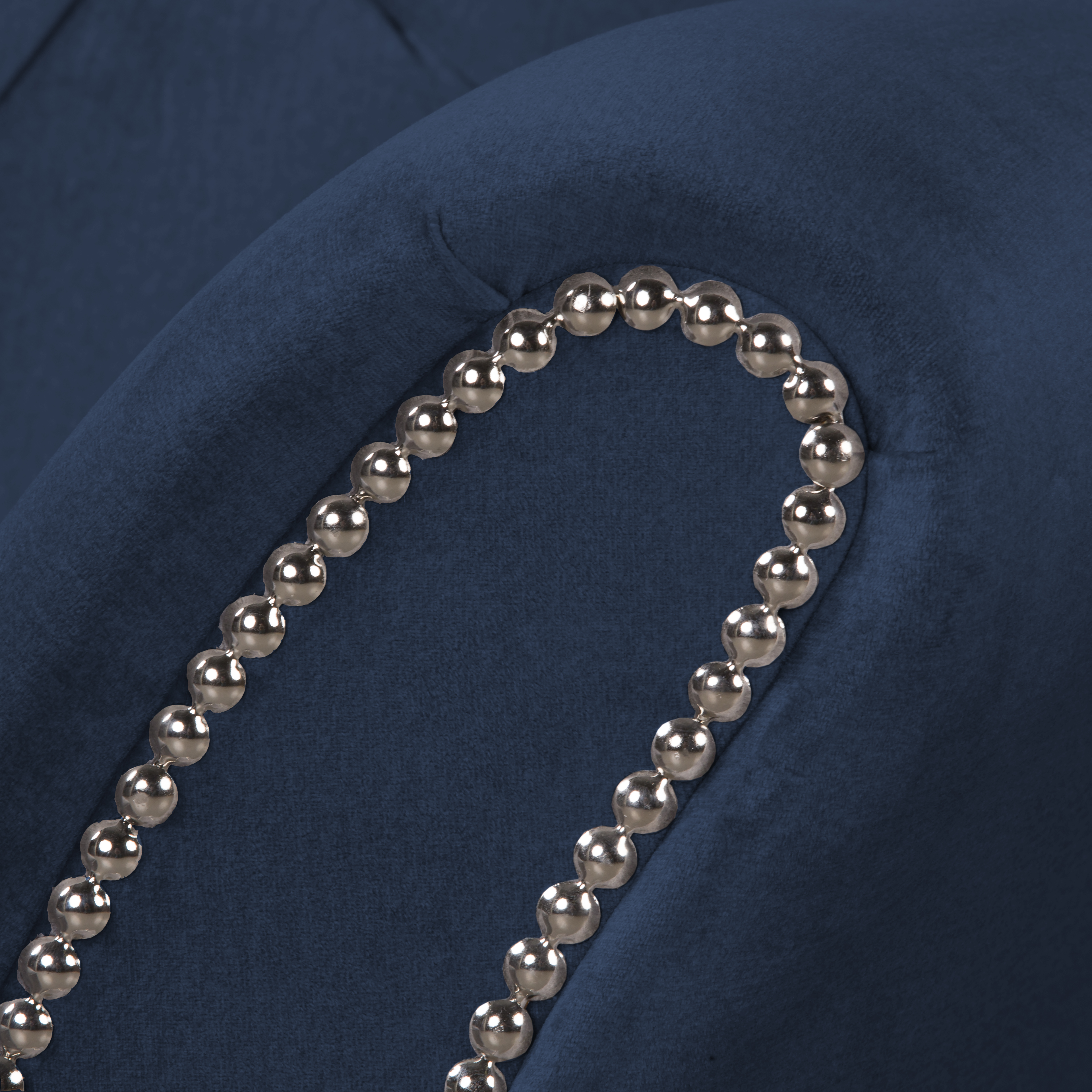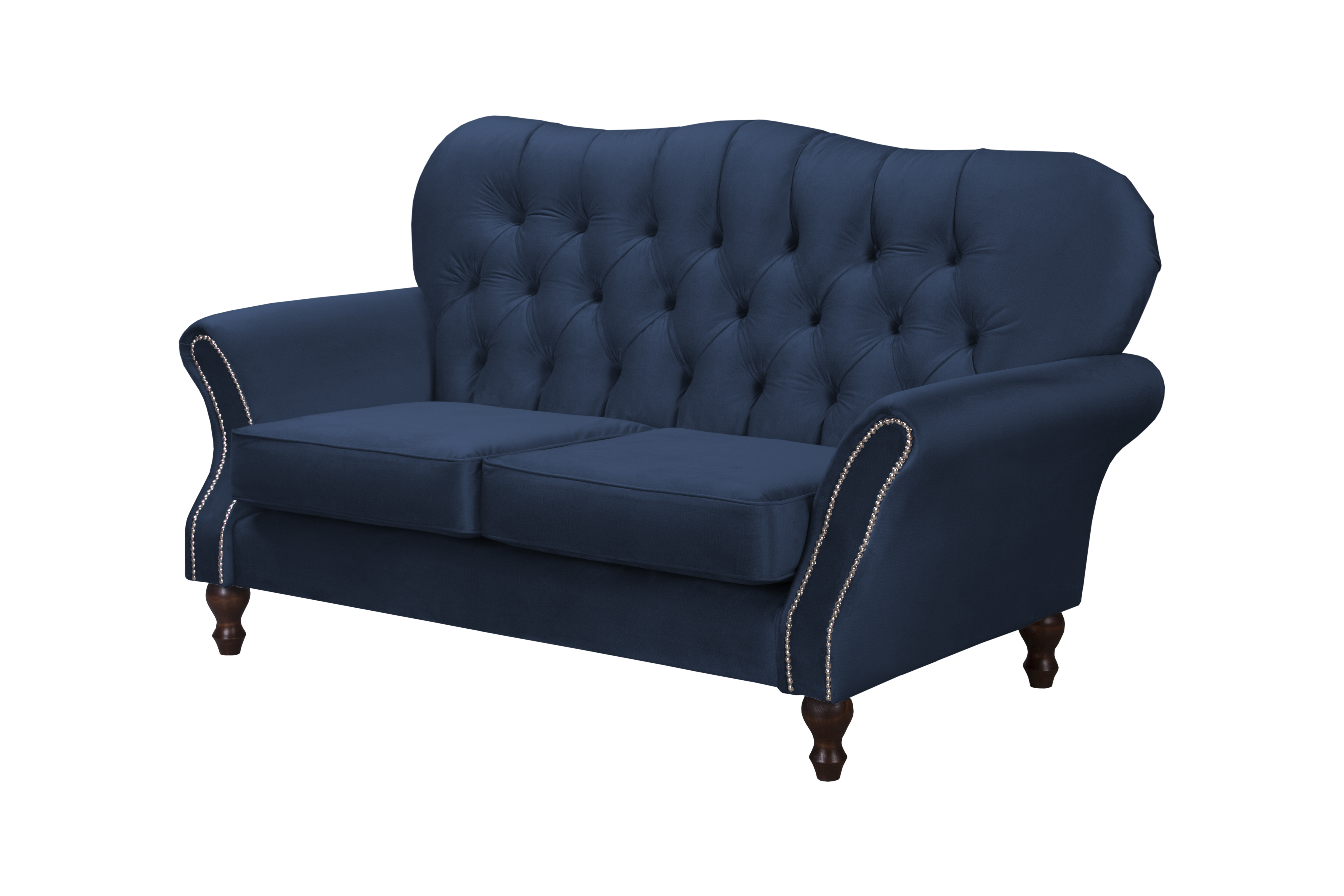 Tył mebla został wykończony tą samą tkaniną co całość, co pozwala na ustawienie sofy w dowolnym miejscu – nie tylko przy ścianie. Wysokość oparcia wynosi 53 cm, a szerokie podłokietniki zapewniają wygodne wsparcie dla ramion. Drewniane nóżki o wysokości 15 cm dodają meblowi wizualnej lekkości, a ich naturalny kolor świetnie kontrastuje z granatowym obiciem.