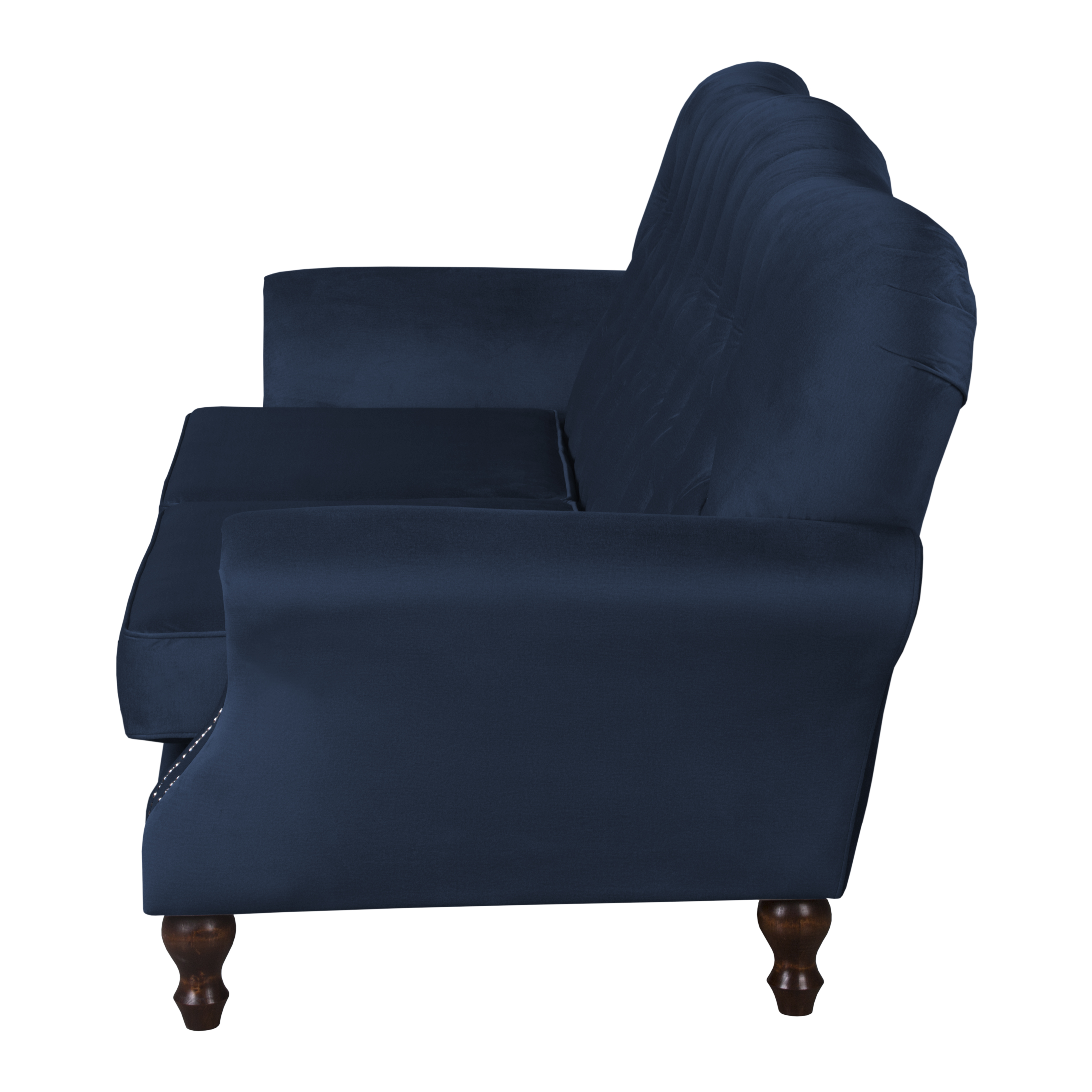 Tapicerowana tkaniną z każdej strony sofa prezentuje się elegancko również jako mebel wolnostojący. Kolor granatowy wnosi do wnętrza głębię i elegancję, czyniąc z niej nie tylko wygodne miejsce do odpoczynku, ale też dekoracyjny punkt salonu.