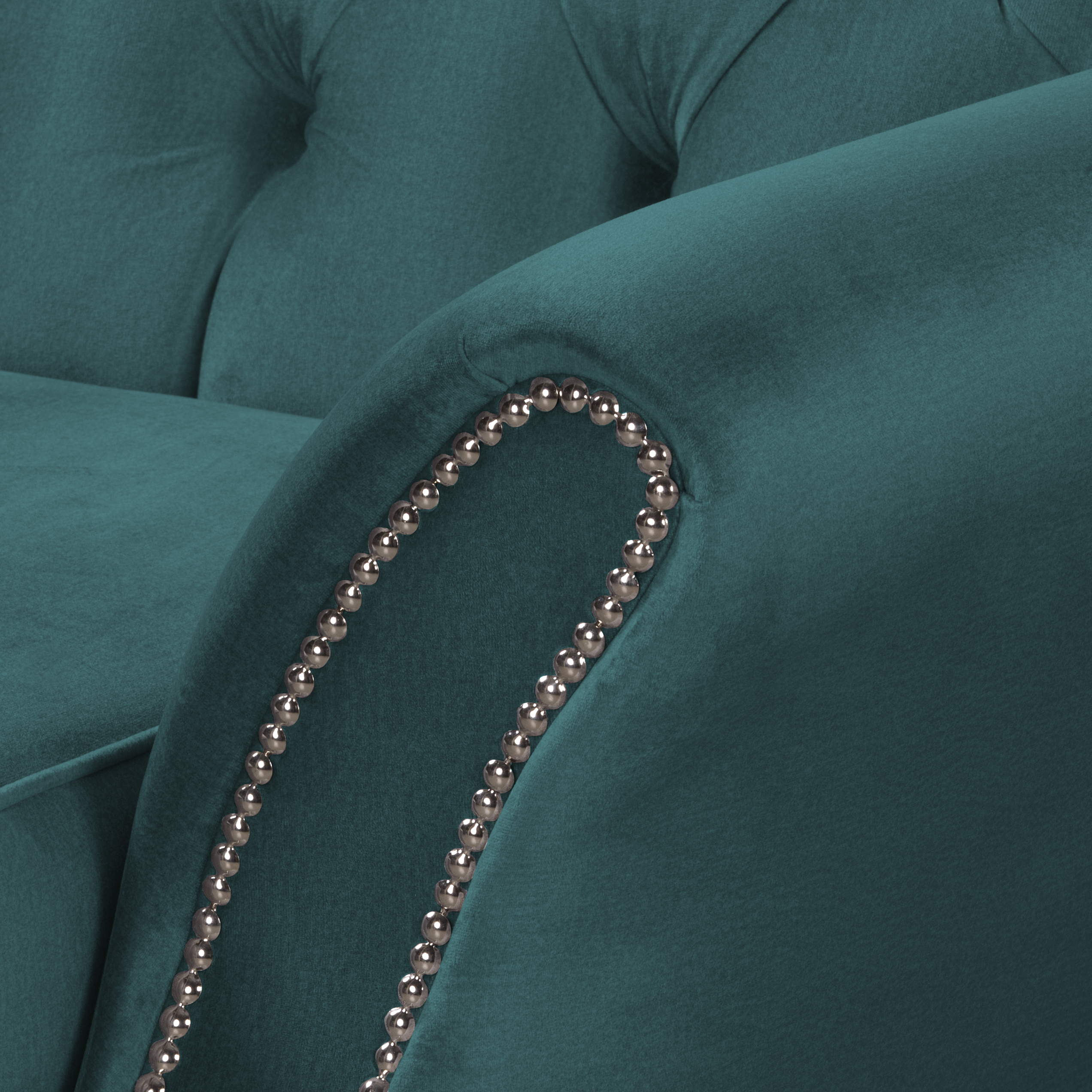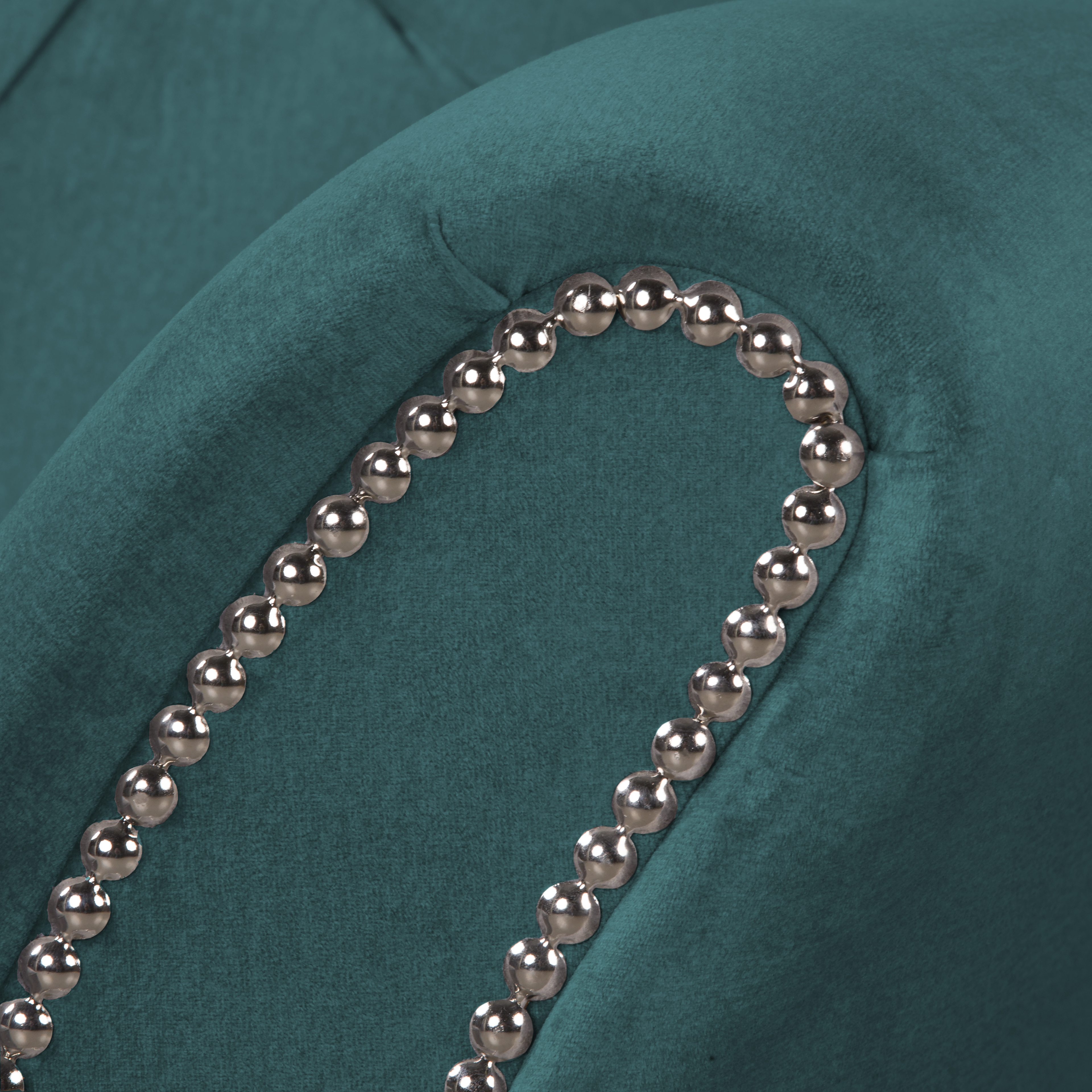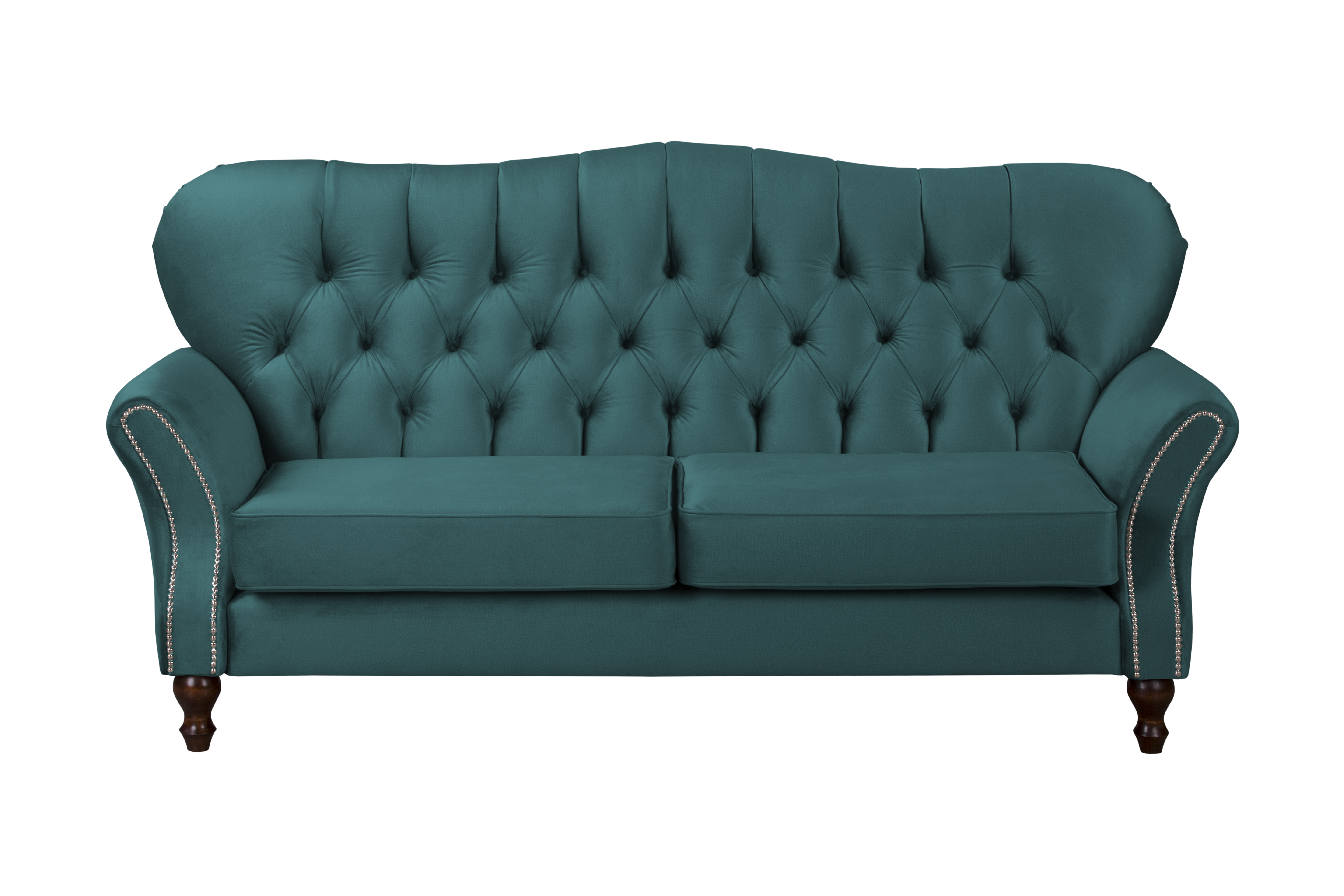 Zielona tapicerka w połączeniu z klasyczną formą świetnie odnajdzie się w salonie jako mebel wolnostojący. Dzięki pełnemu obiciu wygląda równie dobrze z tyłu, jak i z przodu.