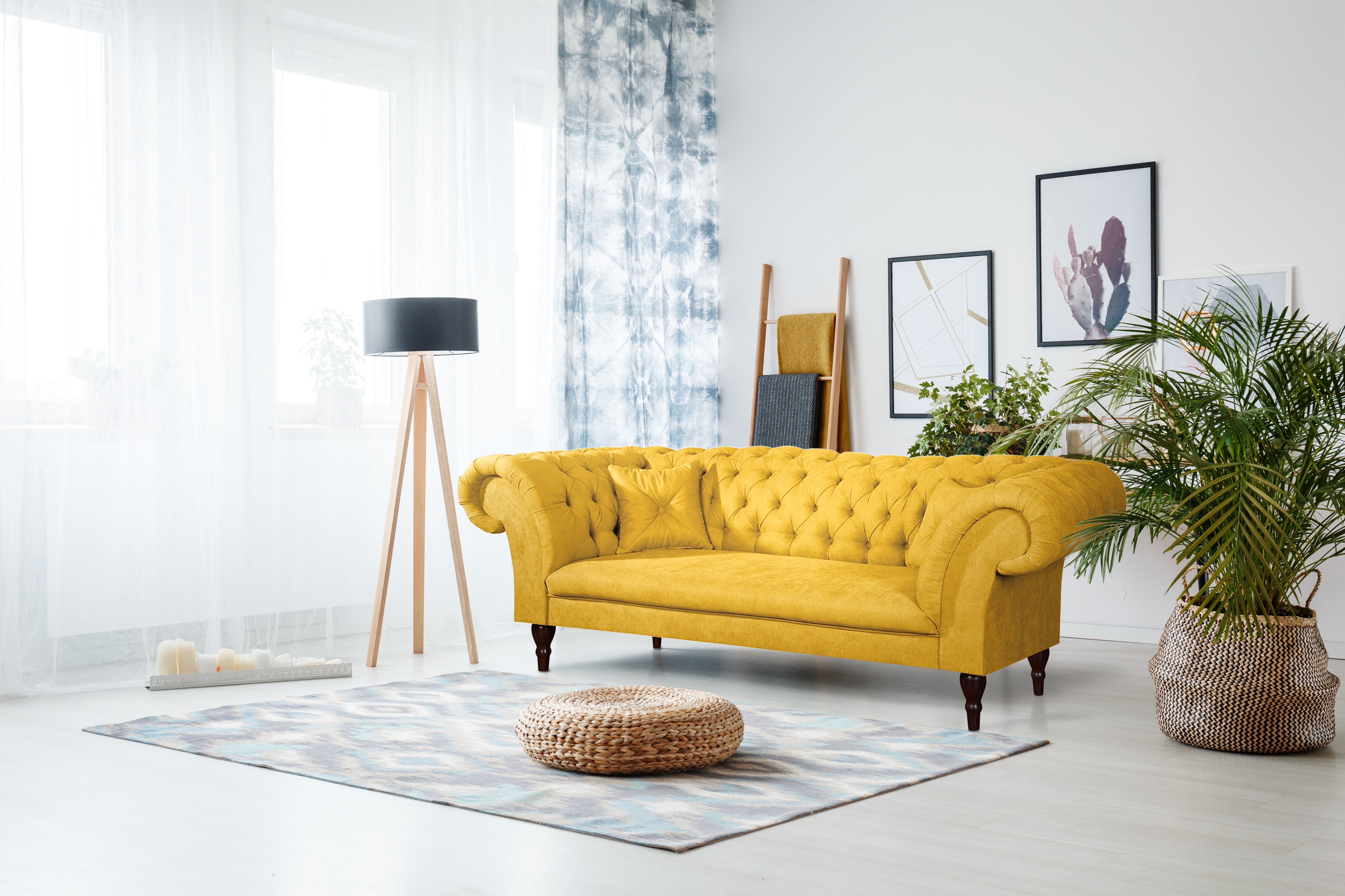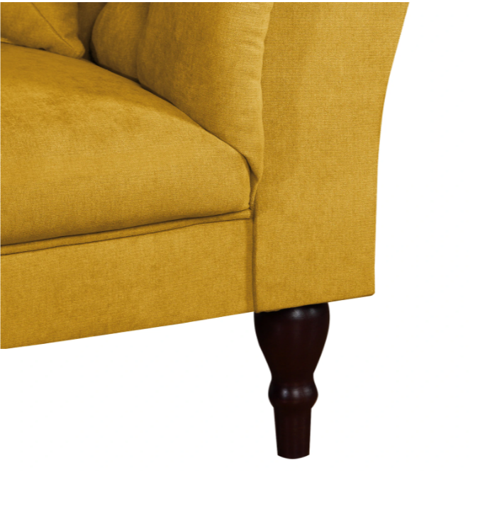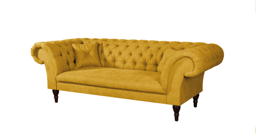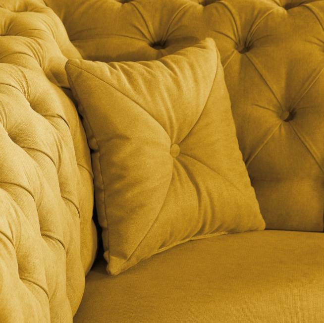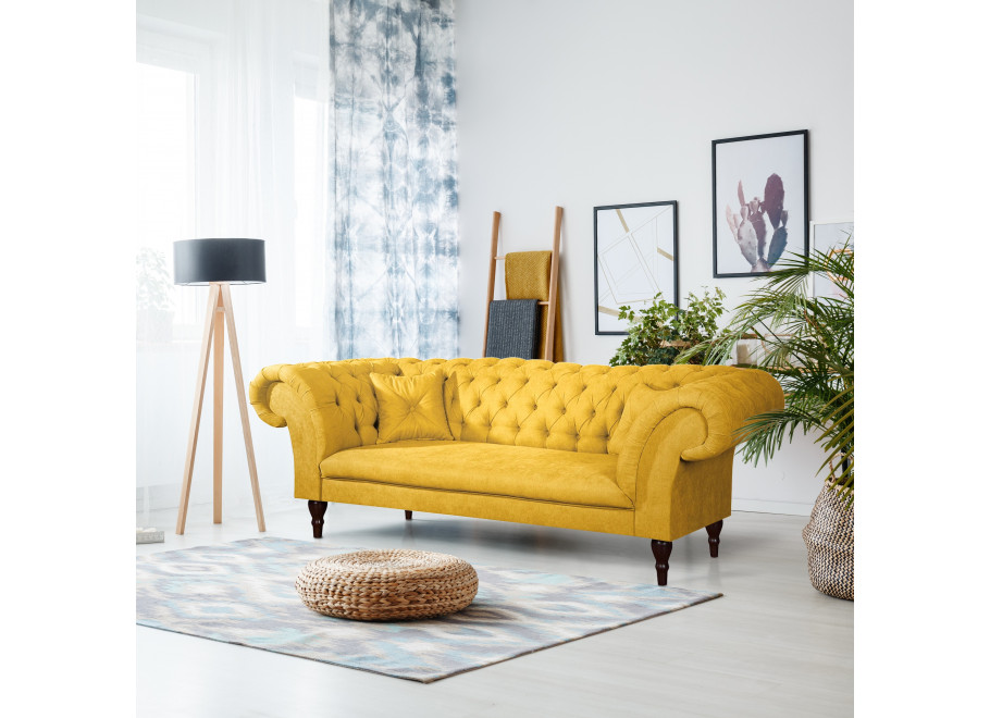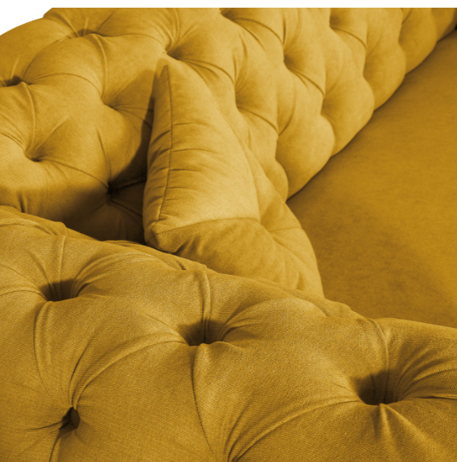 Żółta sofa Chesterfield PORTO to propozycja dla tych, którzy chcą dodać do wnętrza odrobinę energii i oryginalności, nie rezygnując z klasycznej formy. Nasycony, ale elegancki odcień ożywia przestrzeń i świetnie kontrastuje z pikowanym wykończeniem.