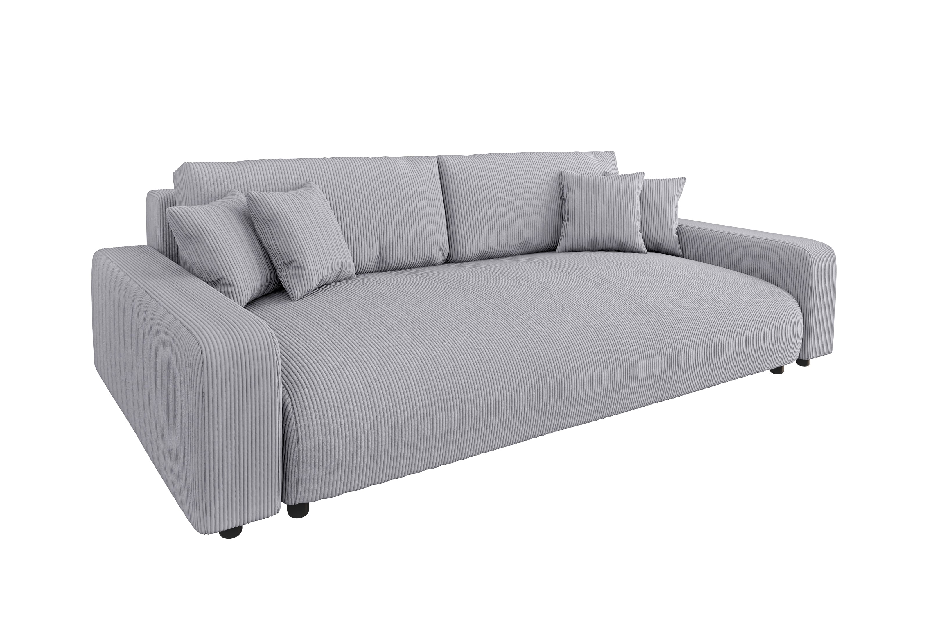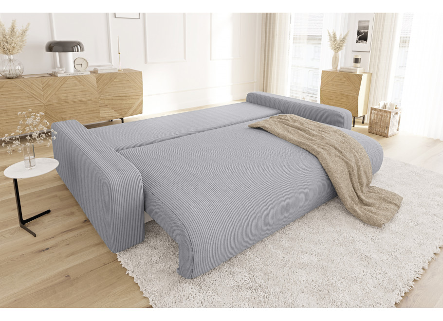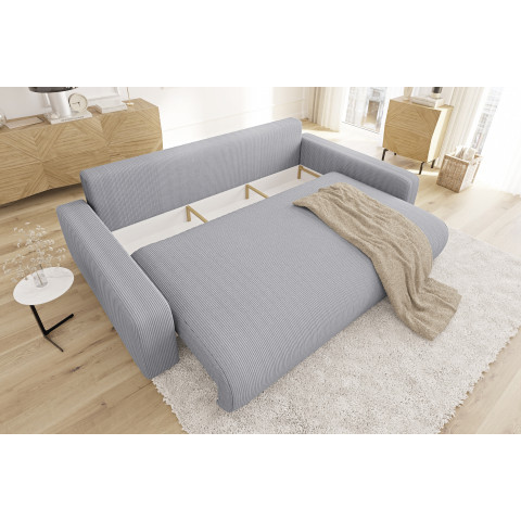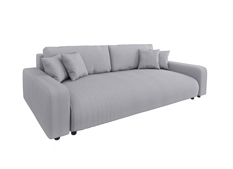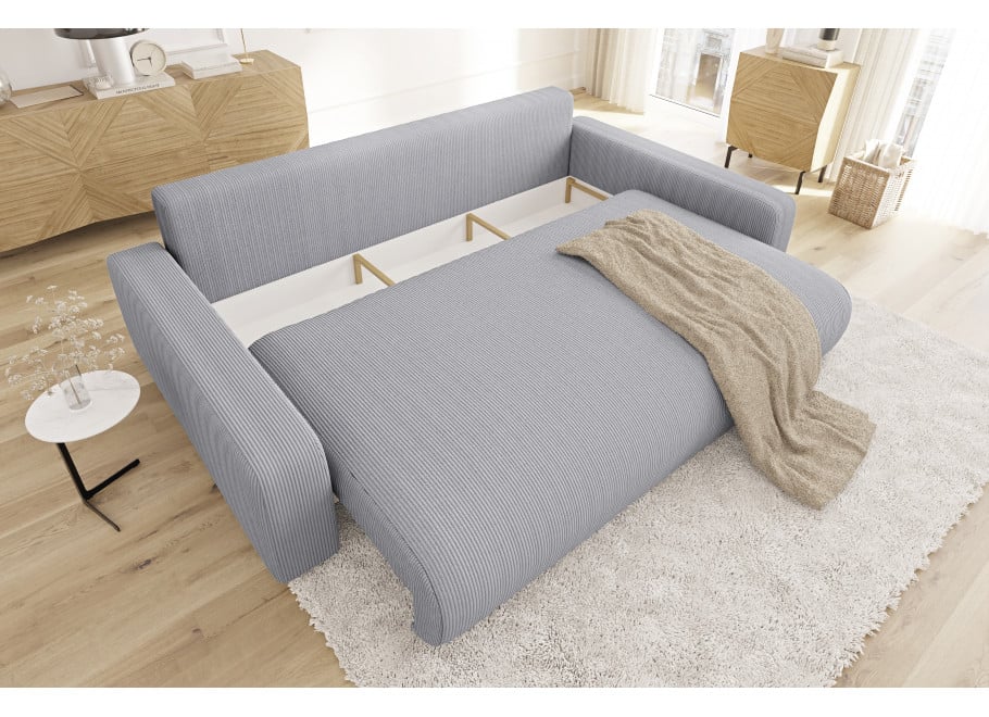 Komfort użytkowania zapewniają miękkie siedzisko, głębokie oparcie oraz dołączone poduszki gwarantujące idealne podparcie pleców. Funkcja spania umożliwia łatwe zamienienie sofy w wygodne łóżko dla gości, a dodatkowy schowek na pościel o wymiarach 190 x 93,5 x 15,5 cm zwiększa praktyczność mebla.