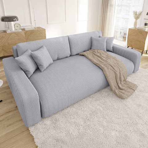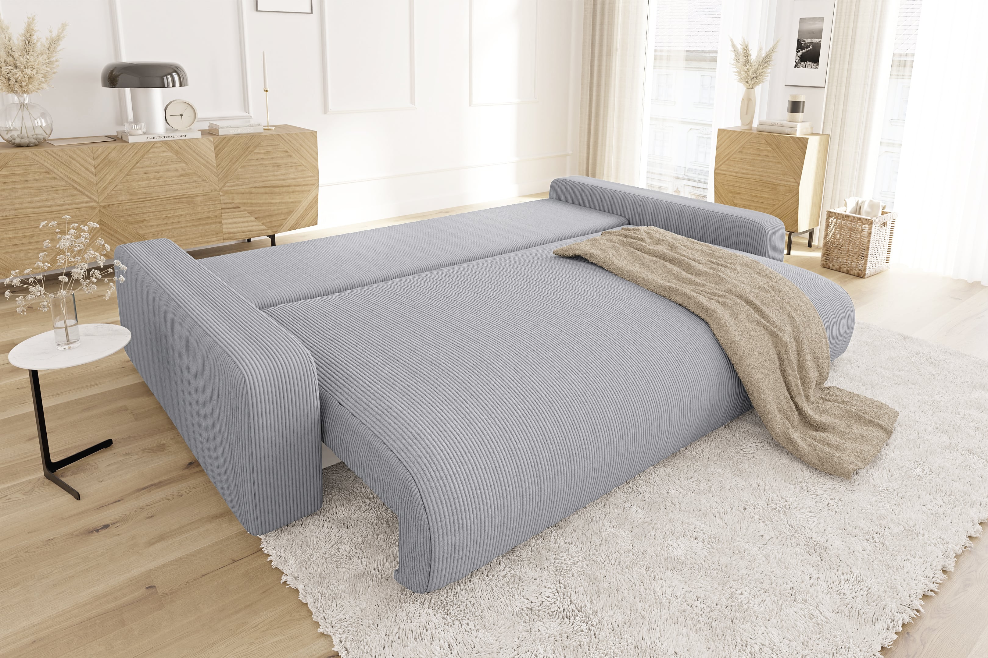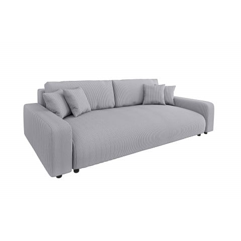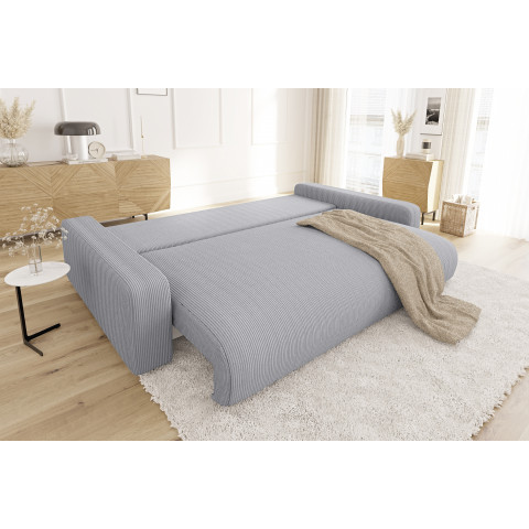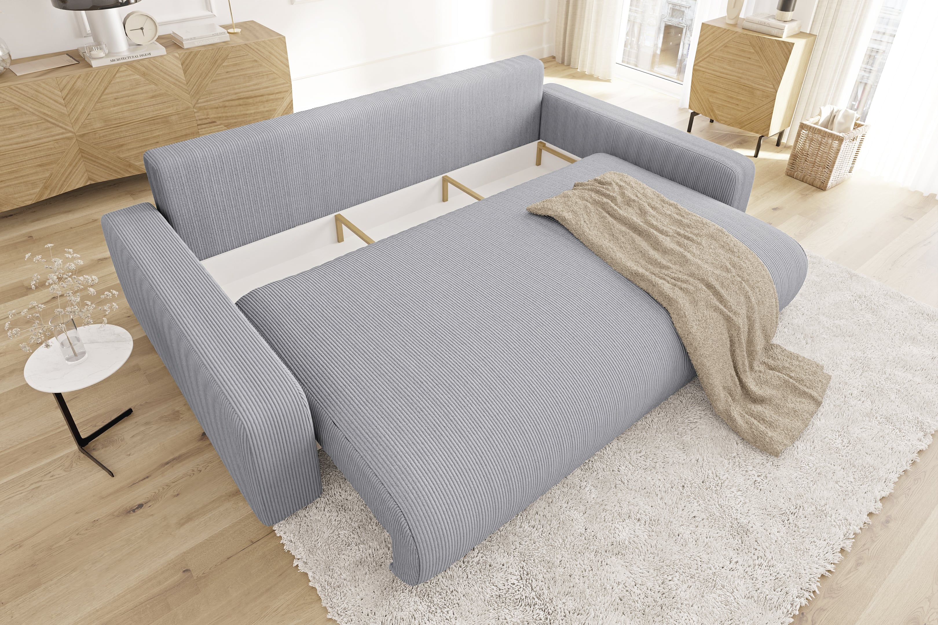 Komfort użytkowania zapewniają miękkie siedzisko, głębokie oparcie oraz dołączone poduszki gwarantujące idealne podparcie pleców. Funkcja spania umożliwia łatwe zamienienie sofy w wygodne łóżko dla gości, a dodatkowy schowek na pościel o wymiarach 190 x 93,5 x 15,5 cm zwiększa praktyczność mebla.