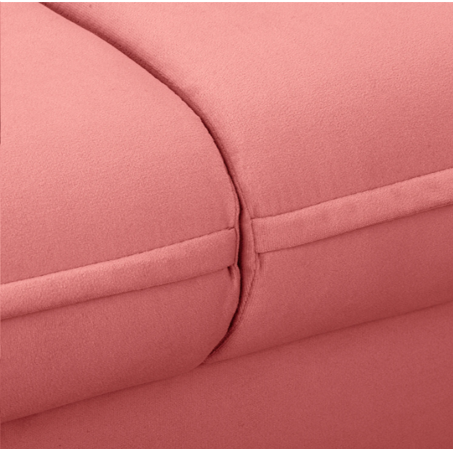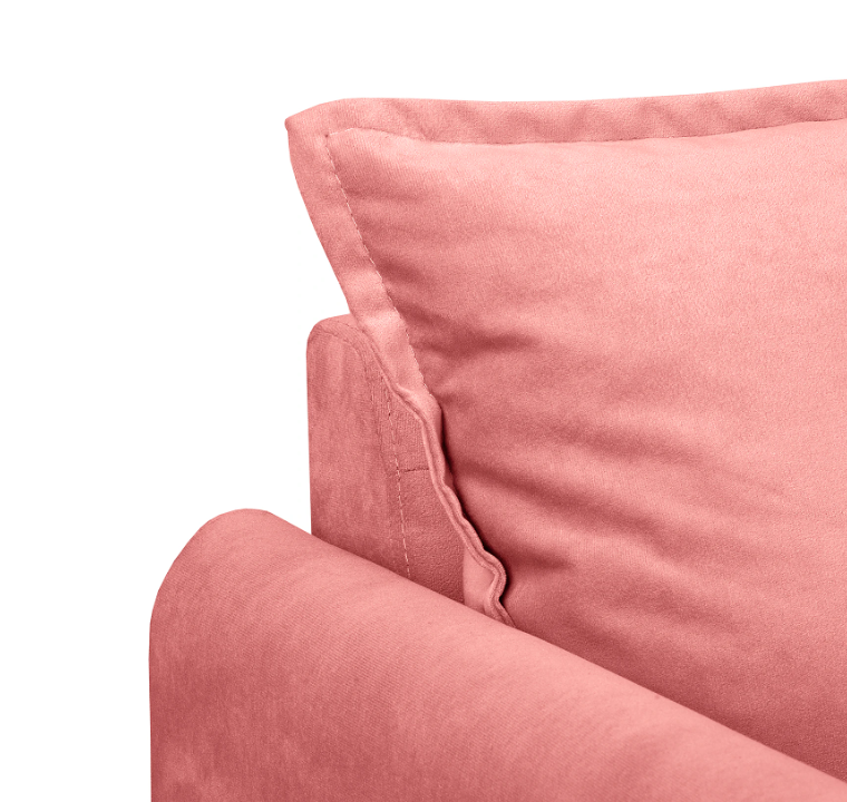 Tapicerka to wysokogatunkowa tkanina w kolorze różowym, która pokrywa cały mebel, również tylną część, dzięki czemu sofa prezentuje się atrakcyjnie niezależnie od ustawienia – zarówno na środku, jak i przy ścianie.