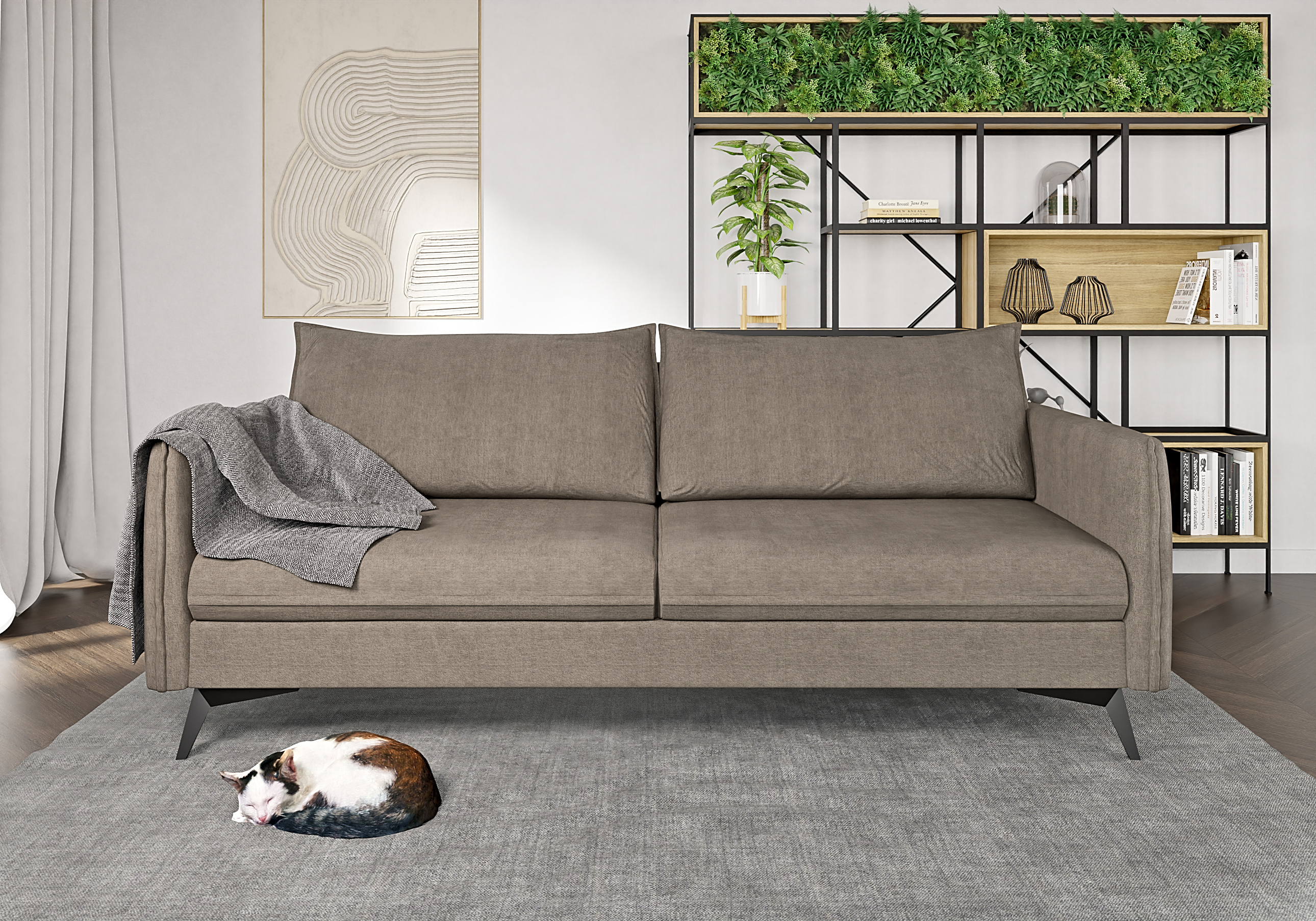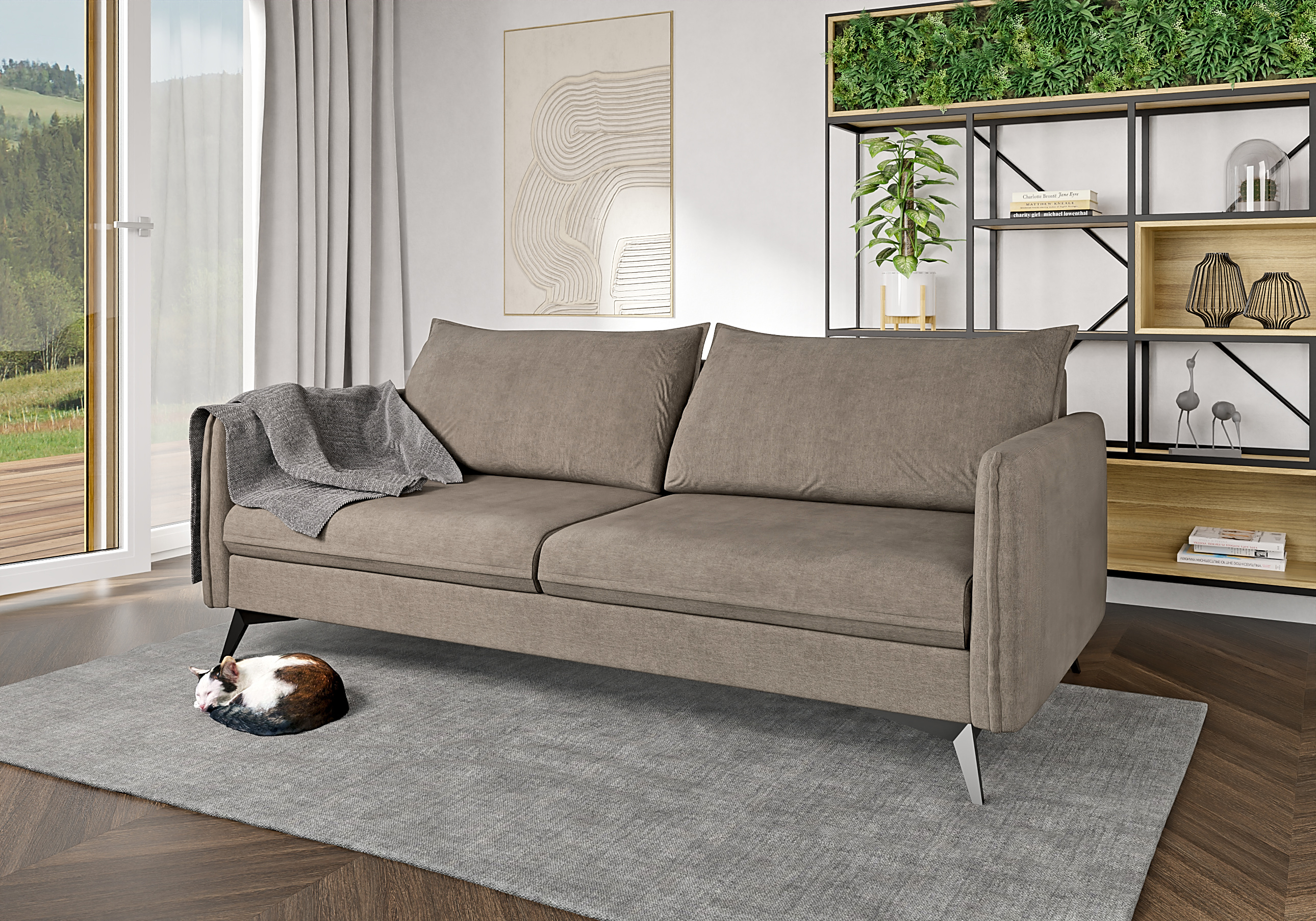 Tkanina obiciowa w odcieniu szarobeżowym pokrywa również tylną część mebla, dzięki czemu sofa prezentuje się świetnie z każdej strony. Do kompletu można dobrać fotel lub sofę dwuosobową z tej samej kolekcji i stworzyć komfortową strefę relaksu w swoim salonie.