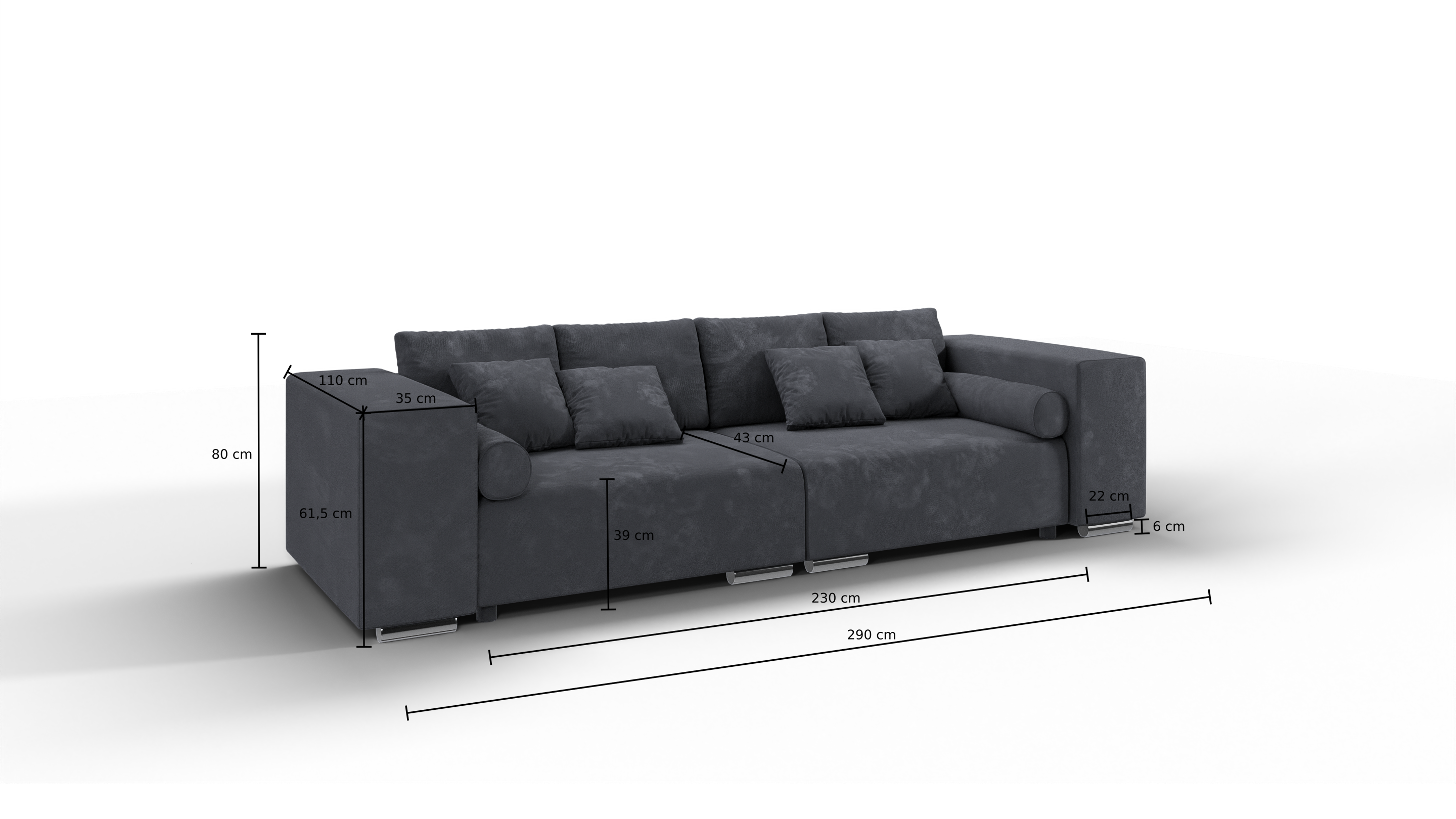 Grafitowa tkanina obiciowa wysokiej jakości jest przyjemna w dotyku i pokrywa również tył oparcia, dzięki czemu mebel świetnie wygląda z każdej strony. Sofa może być ustawiona przy ścianie lub w centrum pokoju – w zależności od potrzeb aranżacyjnych.