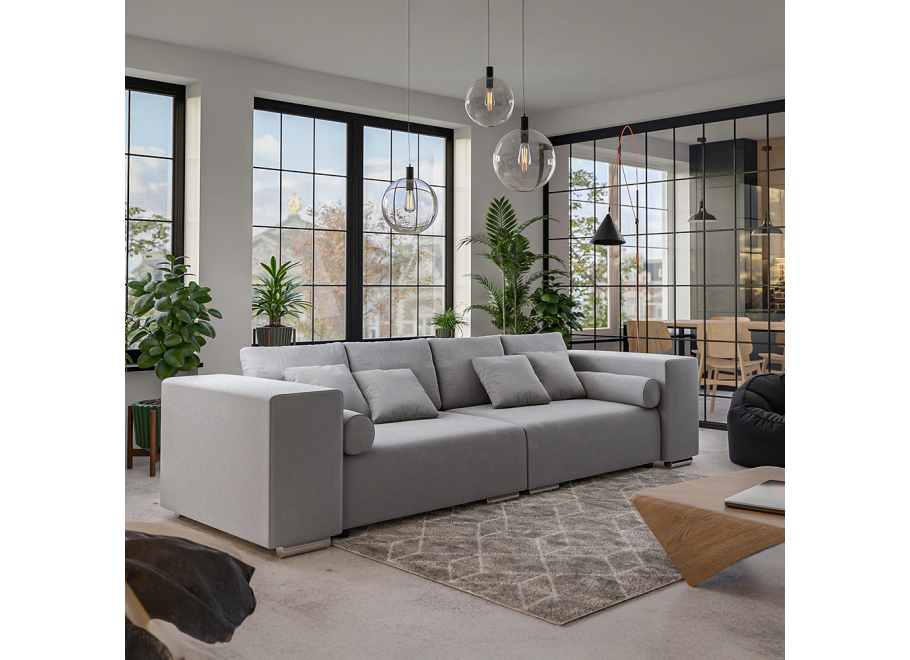 Dołączony zestaw poduszek w różnych rozmiarach podkreśla charakter mebla, a jednocześnie poprawia komfort codziennego użytkowania. Subtelne, chromowane nóżki dodają sofie lekkości i wpisują się w nowoczesną estetykę.