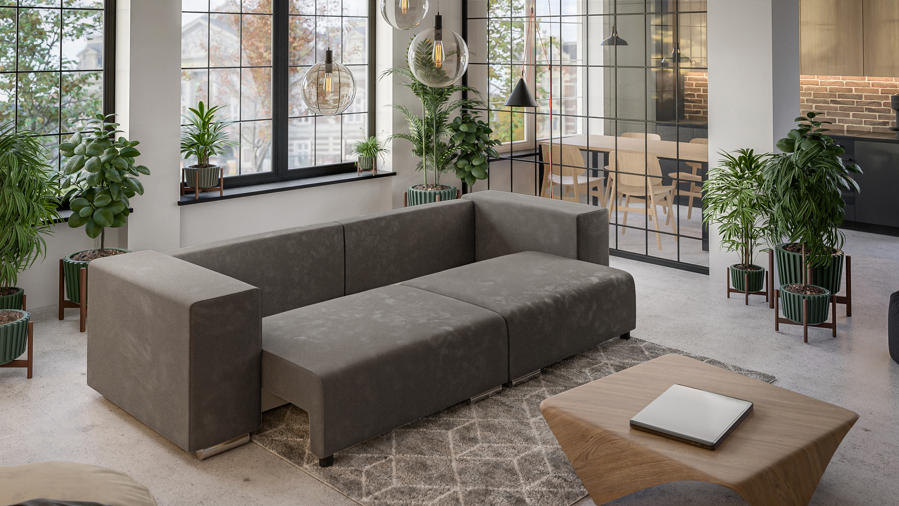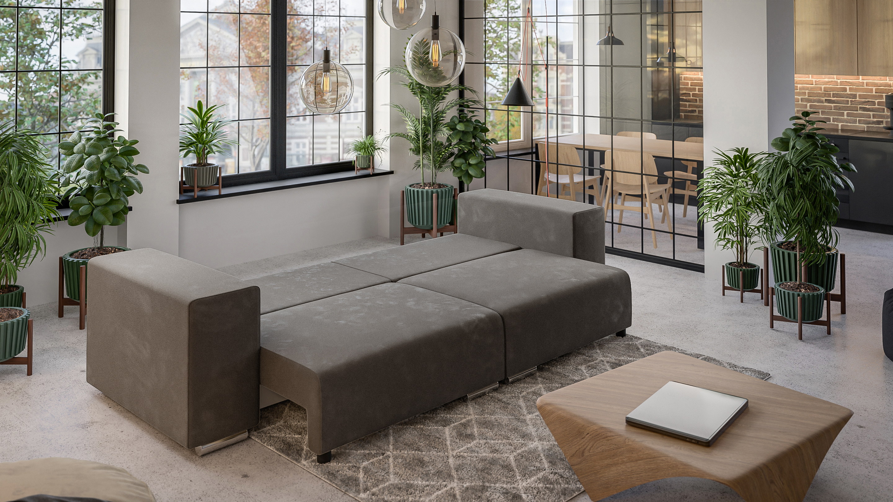 Funkcja spania pozwala w prosty sposób zmienić sofę w łóżko dla gości – bez utraty na estetyce. Konstrukcja mebla opiera się na solidnych materiałach, takich jak lite drewno, sklejka oraz płyty HDF, MDF i wiórowe, co zapewnia jego trwałość.