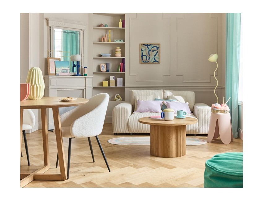 Candi to sofa dwuosobowa, która łączy wygodę i nowoczesną estetykę – w tej wersji pokryta została tkaniną sztruksową w ciepłym beżowym odcieniu, co dodaje wnętrzu przytulności i teksturalnego charakteru. Jej obłe kształty świetnie wpisują się zarówno w modernistyczne, jak i bardziej klasyczne aranżacje.