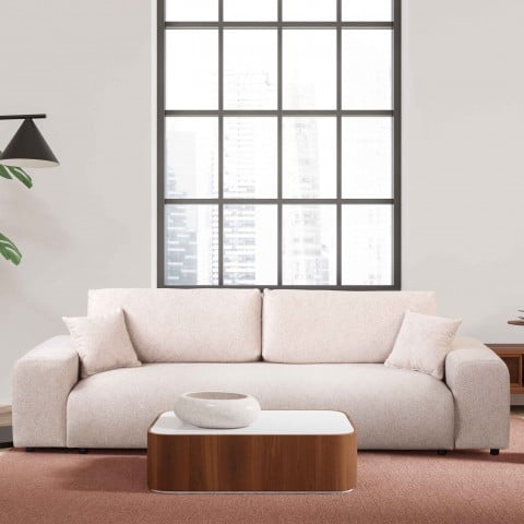 Wysokiej jakości konstrukcja, oparta na drewnie i płytach drewnopochodnych, gwarantuje stabilność i trwałość mebla przez długie lata. Beżowa tapicerka jest przyjemna w dotyku, a sofa została w pełni obita także z tyłu, więc świetnie prezentuje się w każdej części pokoju.