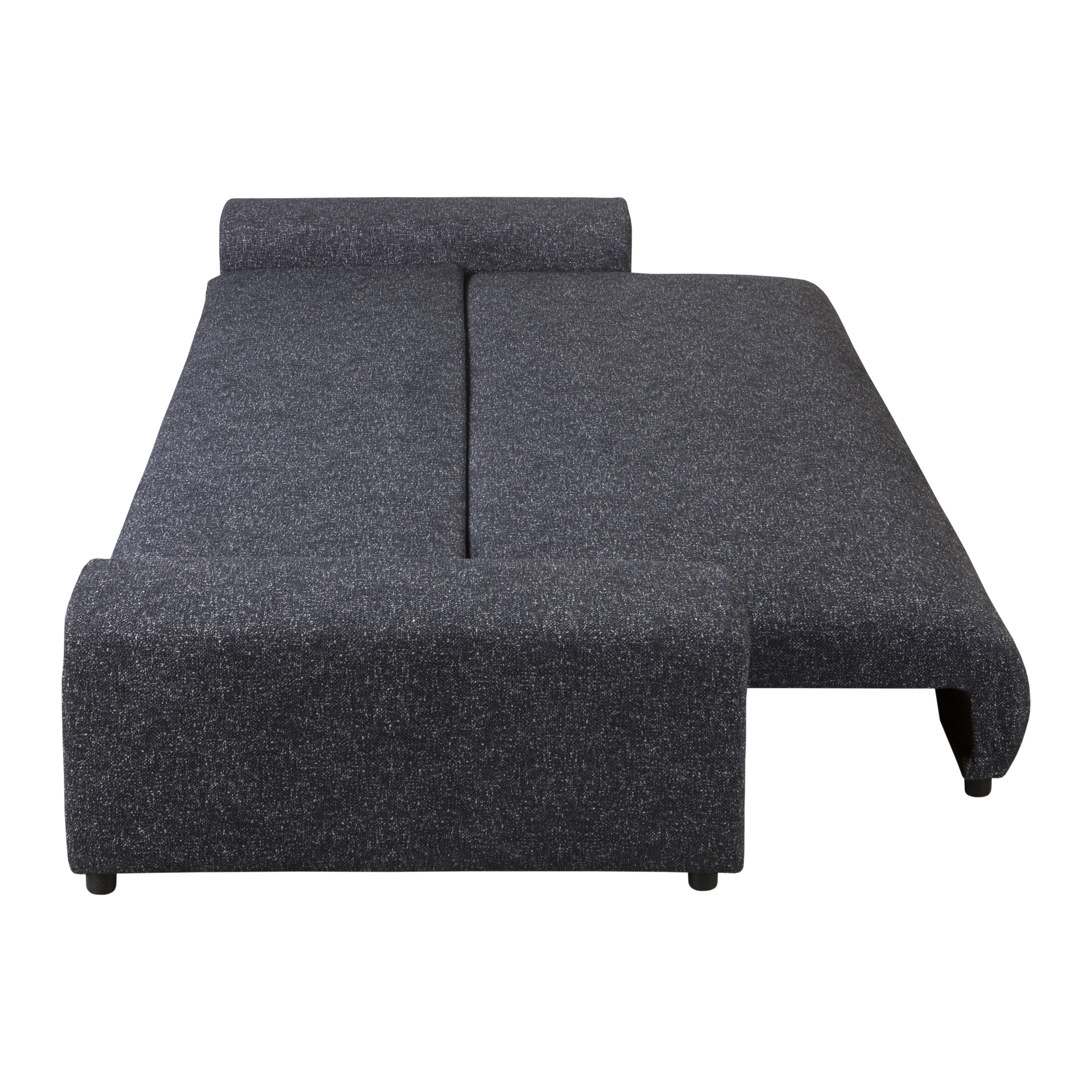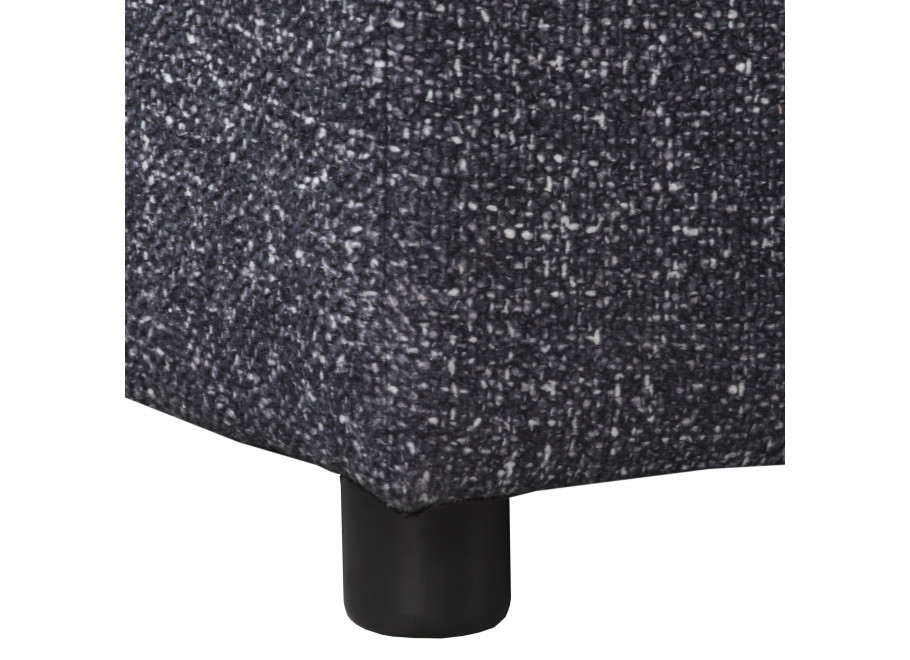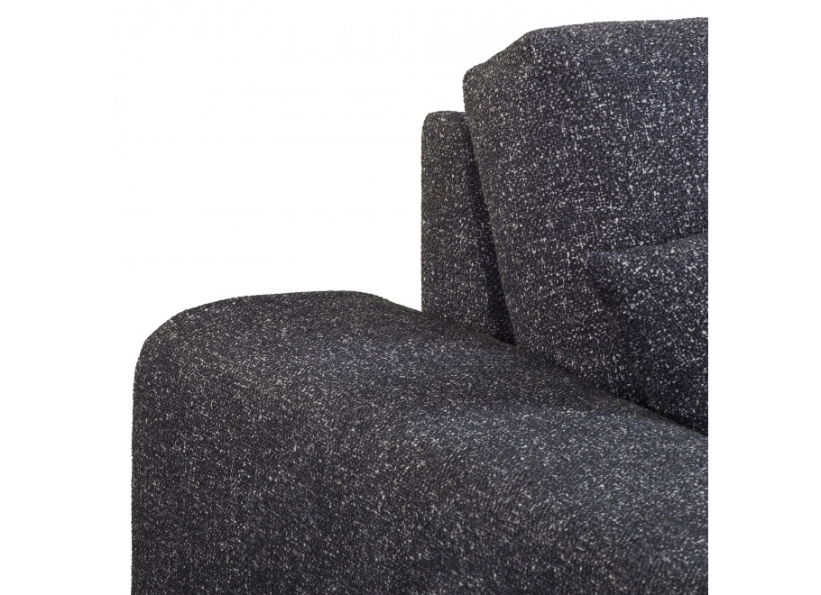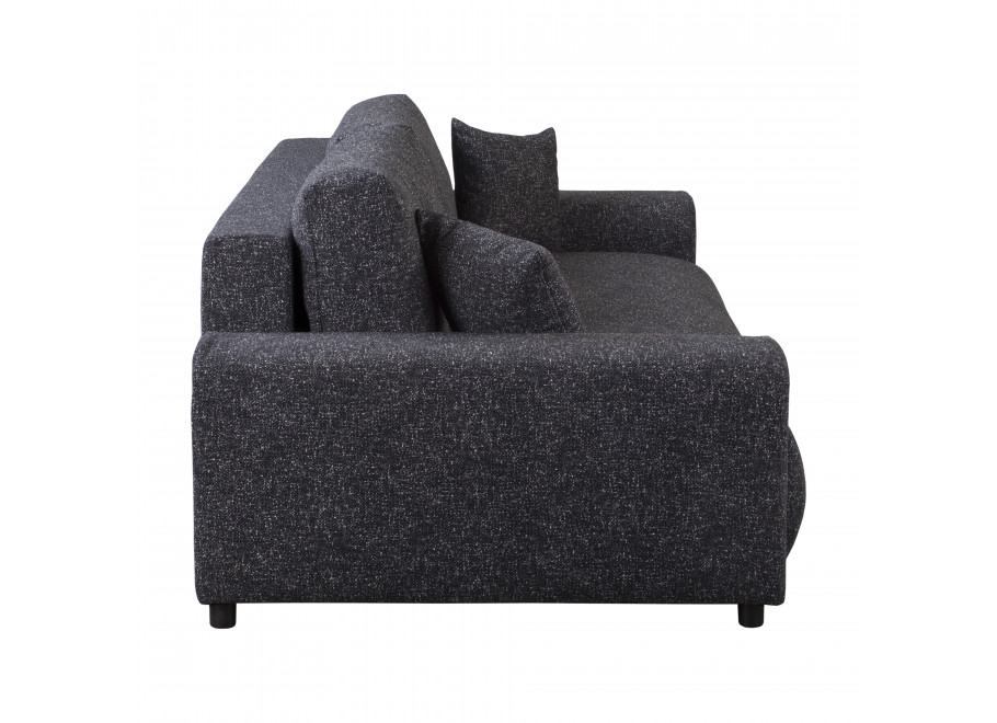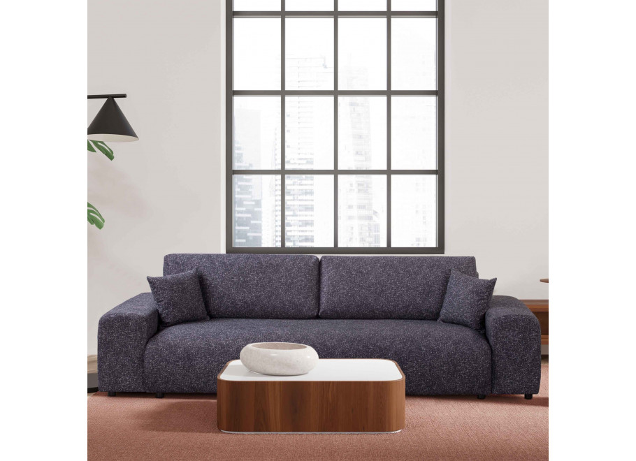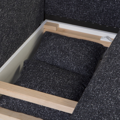 Solidny stelaż z litego drewna, MDF, HDF i sklejki zapewnia trwałość i stabilność. Grafitowa tapicerka z wysokogatunkowej tkaniny obejmuje cały mebel, co pozwala swobodnie ustawić go w centrum pomieszczenia.