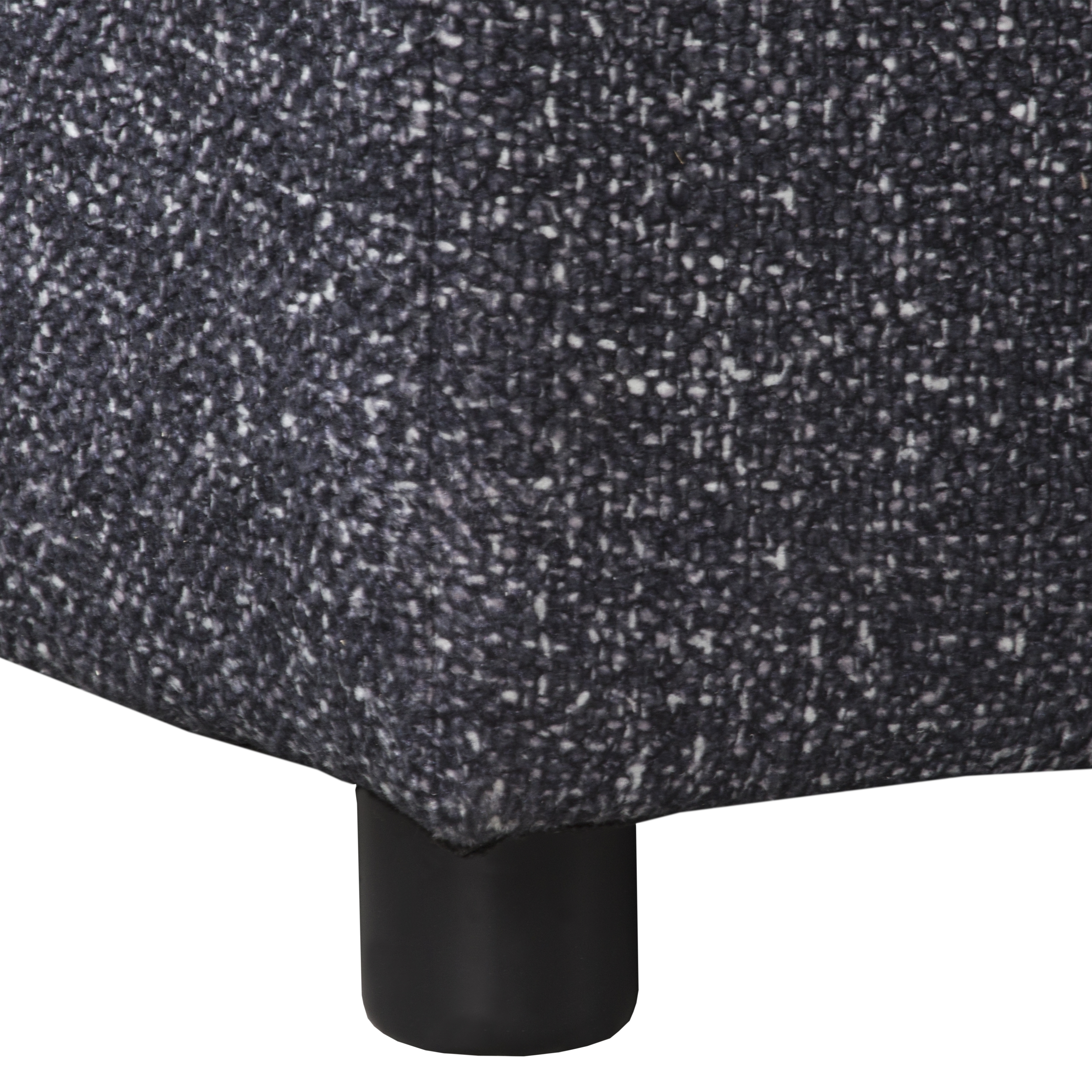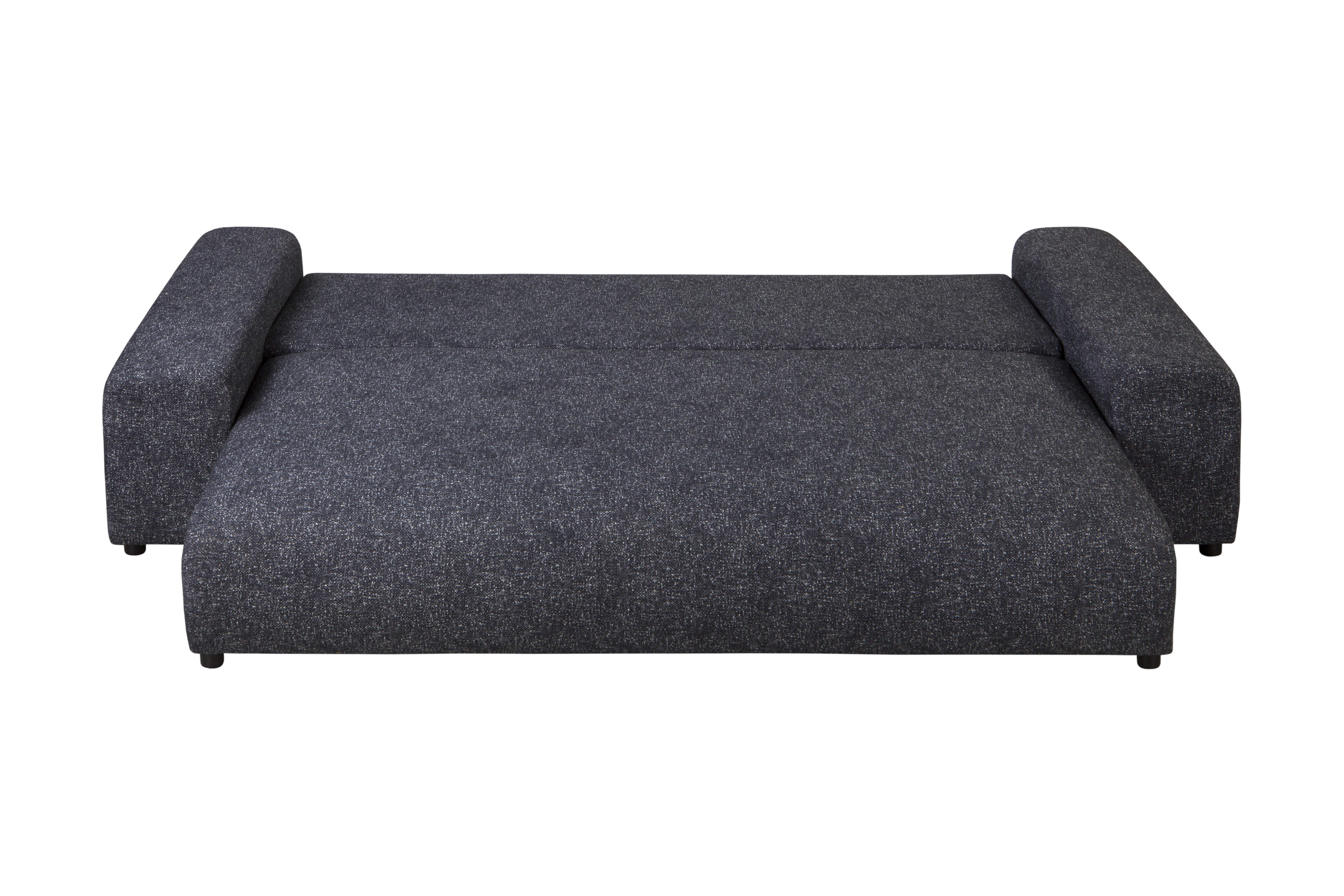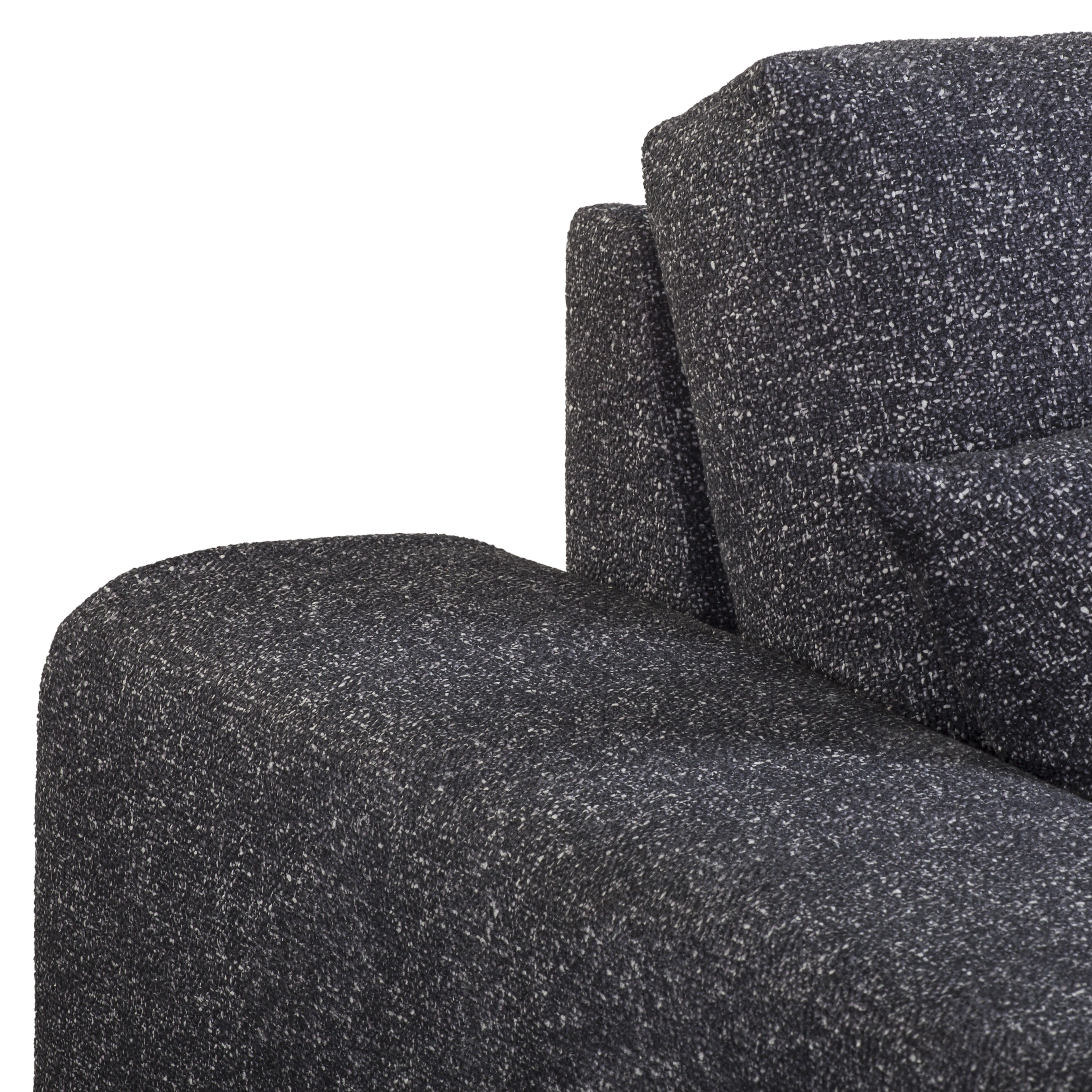 Solidny stelaż z litego drewna, MDF, HDF i sklejki zapewnia trwałość i stabilność. Grafitowa tapicerka z wysokogatunkowej tkaniny obejmuje cały mebel, co pozwala swobodnie ustawić go w centrum pomieszczenia.