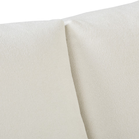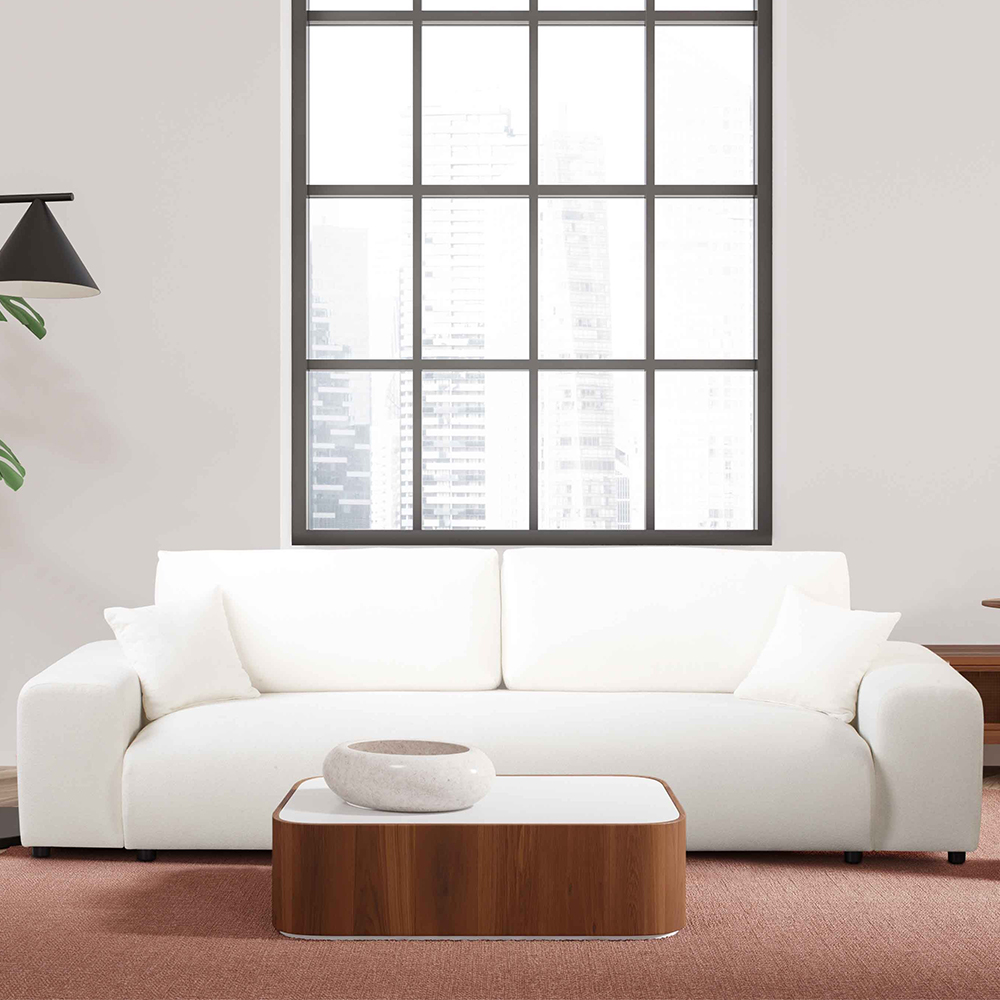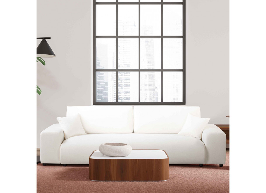 Konstrukcja mebla została wykonana z trwałych materiałów: litego drewna, sklejki oraz płyt MDF, HDF i wiórowych, co zapewnia stabilność i długowieczność użytkowania. Śmietankowa tapicerka z przyjemnej tkaniny obejmuje również tył mebla, dzięki czemu sofa świetnie wygląda ustawiona w centralnym miejscu.