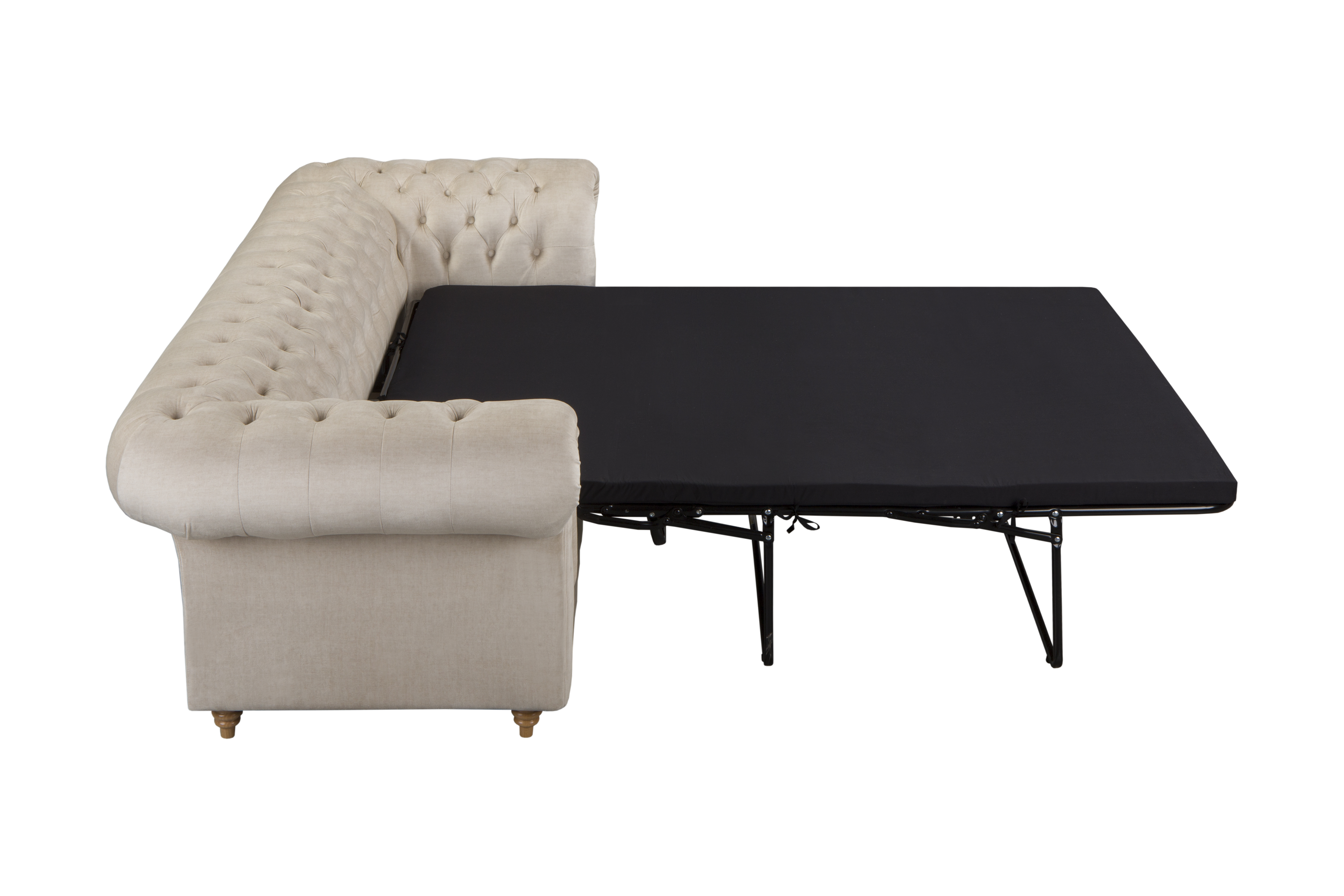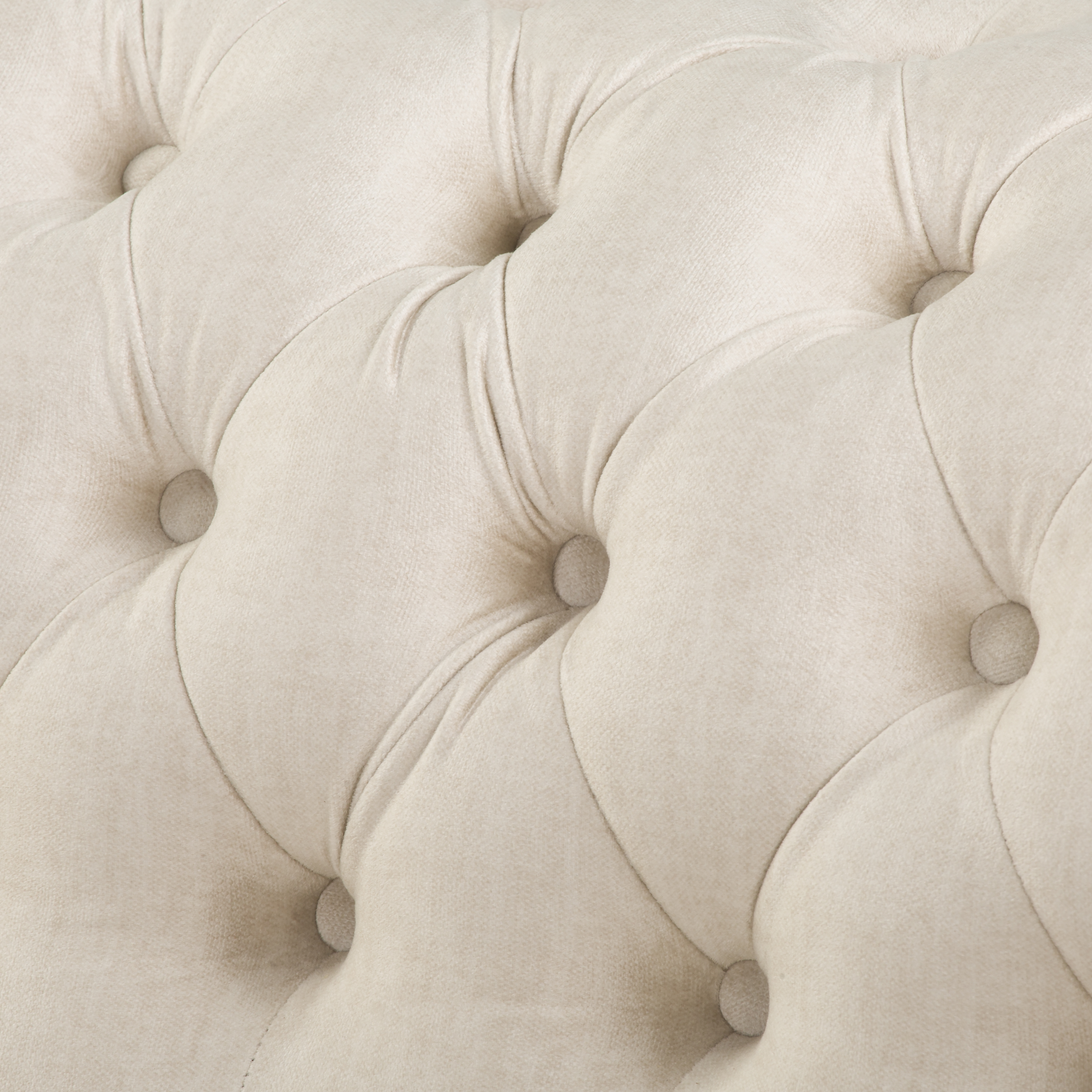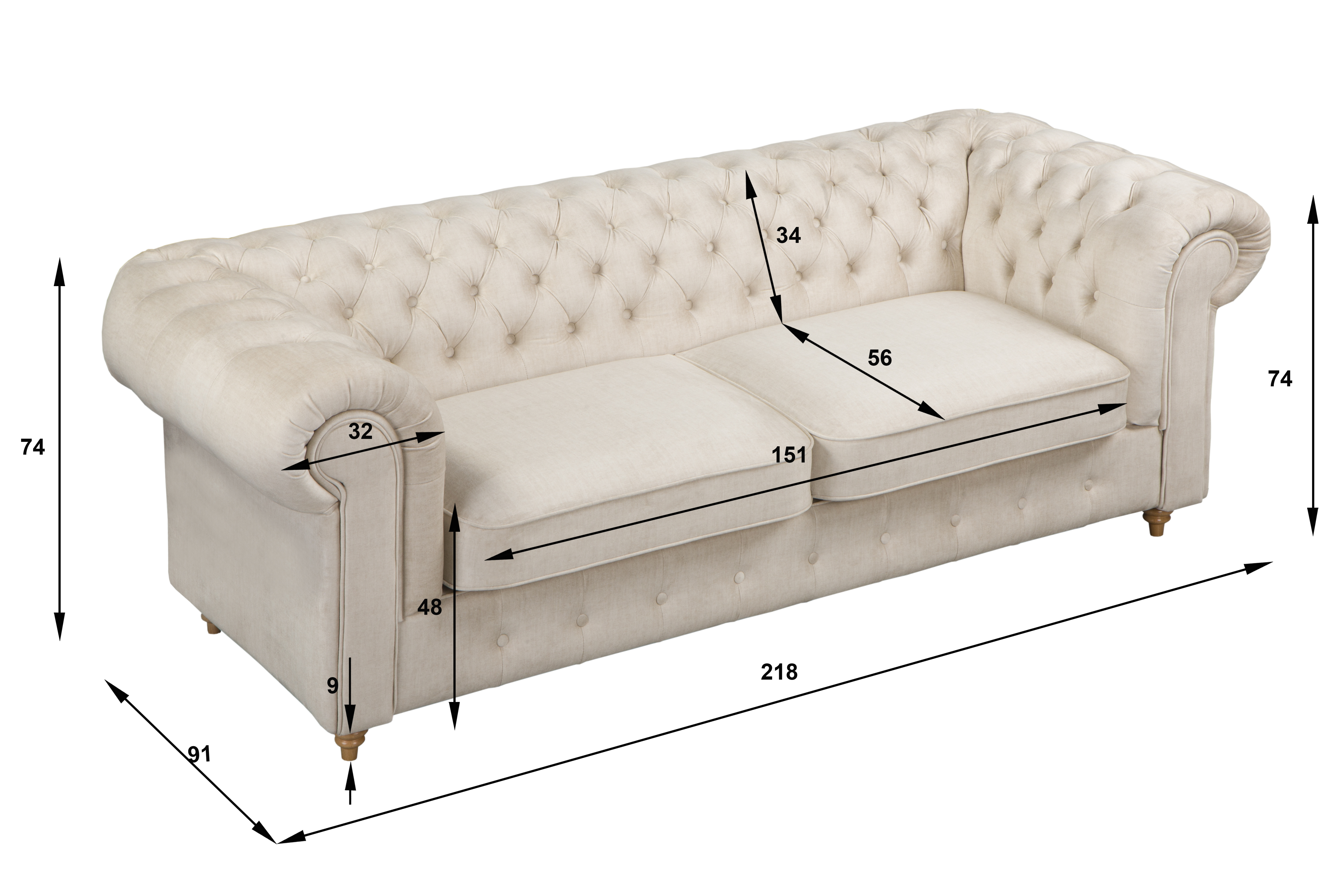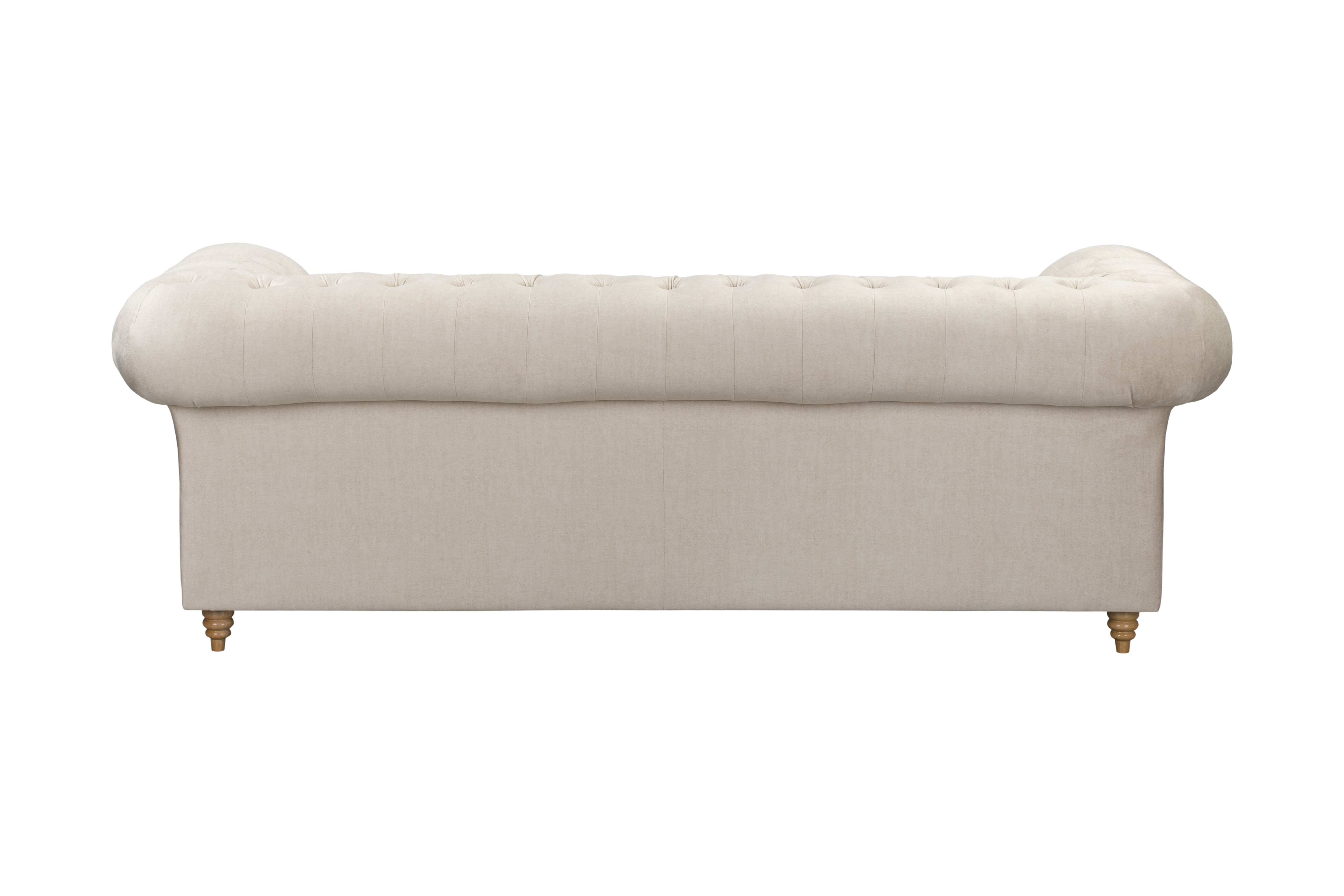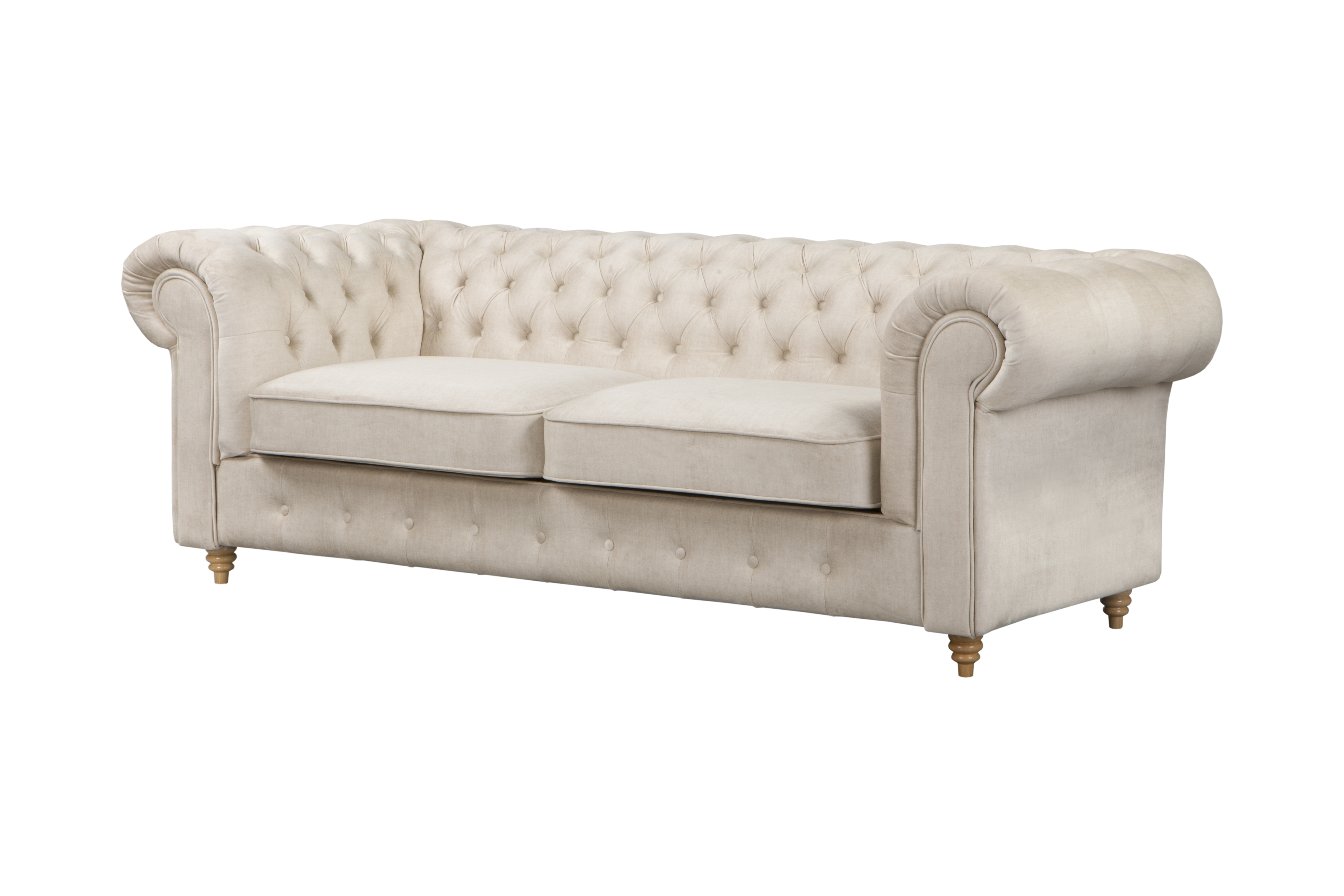 Beżowa wersja kolorystyczna sofy wprowadza do wnętrza ciepło i delikatność, a przy tym łatwo dopasowuje się do różnych palet barw. Jej dopełnieniem są elegancko toczone drewniane nóżki w naturalnym, lakierowanym odcieniu, które subtelnie podnoszą całą bryłę, dodając jej wizualnej lekkości.