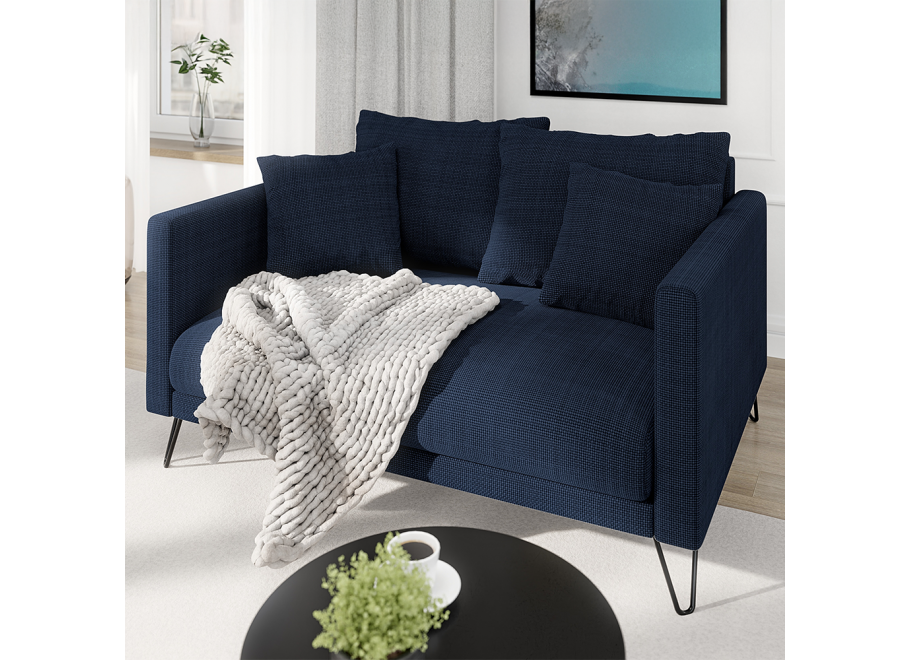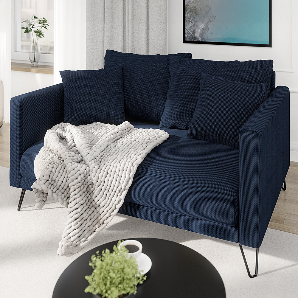Granatowa tapicerka wyróżnia się eleganckim wykończeniem i dobrze współgra z wnętrzami urządzonymi zarówno klasycznie, jak i w duchu loftowym czy eklektycznym. Mimo wyrazistego koloru sofa nie przytłacza pomieszczenia, a dzięki lekkiej formie pomaga je optycznie otworzyć.