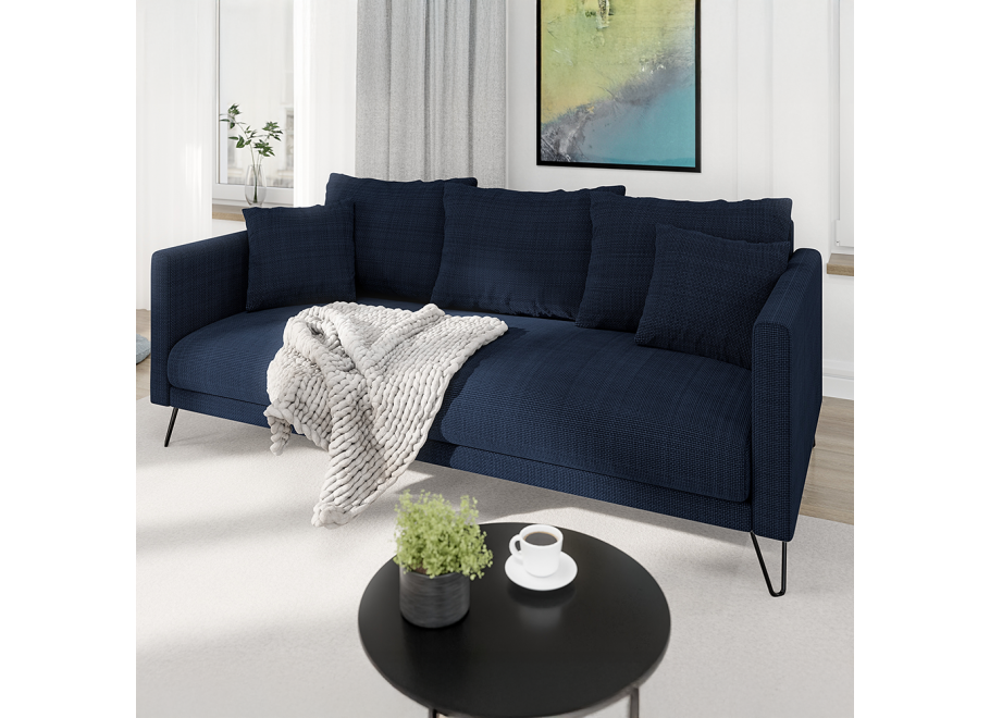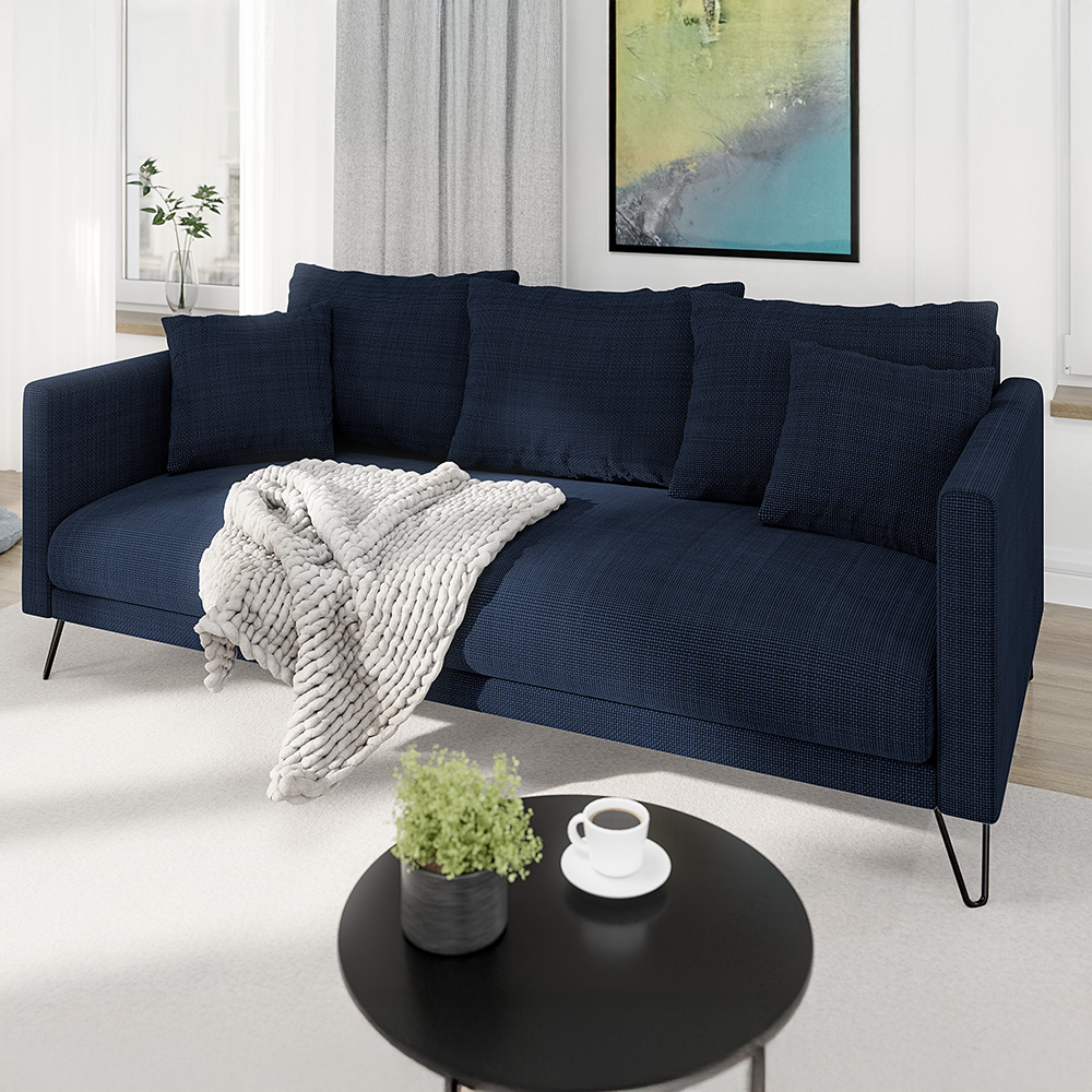 Granatowa wersja sofy Ovi przyciąga wzrok swoją głębią koloru i eleganckim wykończeniem, idealnie wpisując się w charakter nowoczesnych i klasycznych aranżacji. To mebel, który sprawdzi się zarówno w przestronnym salonie, jak i w stylowym biurze. Czarny odcień metalowych nóg dodaje jej lekkości, a jednocześnie podkreśla nowoczesną sylwetkę bryły.
