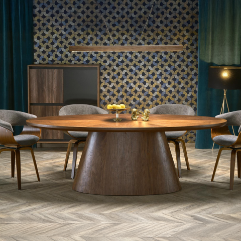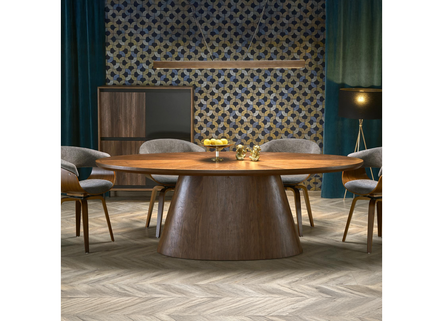 Stół VARELTO to niezwykle dopracowany mebel, który łączy w sobie kunszt wykonania, szlachetne materiały i wyrazistą formę. Jego rzeźbiarska podstawa o zwężającej się linii oraz gruby, eliptyczny blat w naturalnym odcieniu orzecha tworzą spójną, efektowną całość, która zachwyca już od pierwszego spojrzenia.