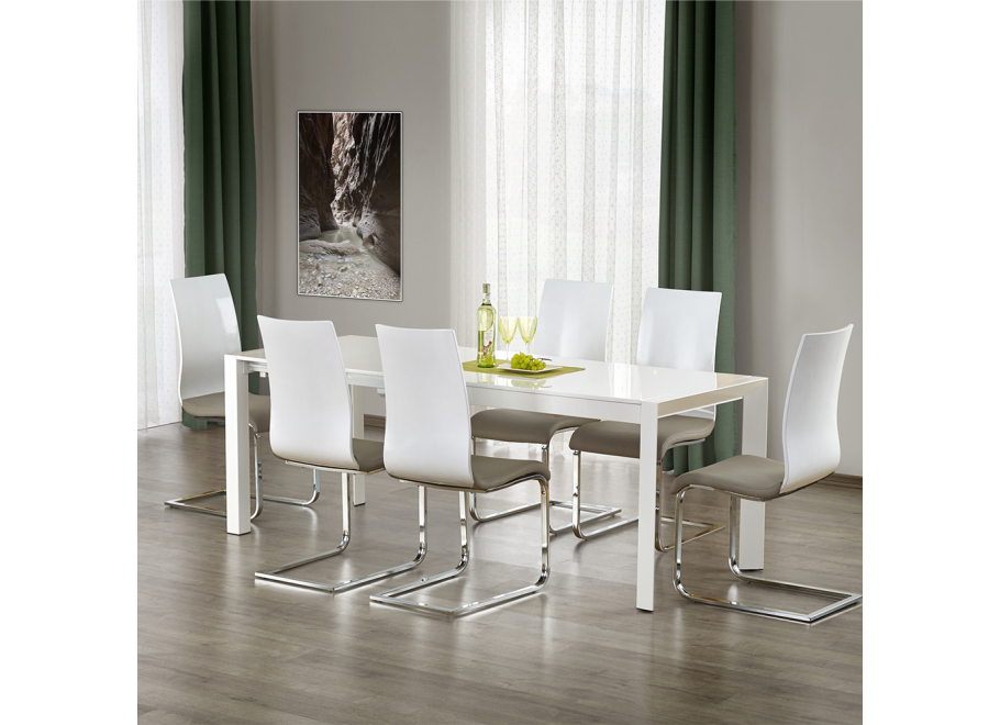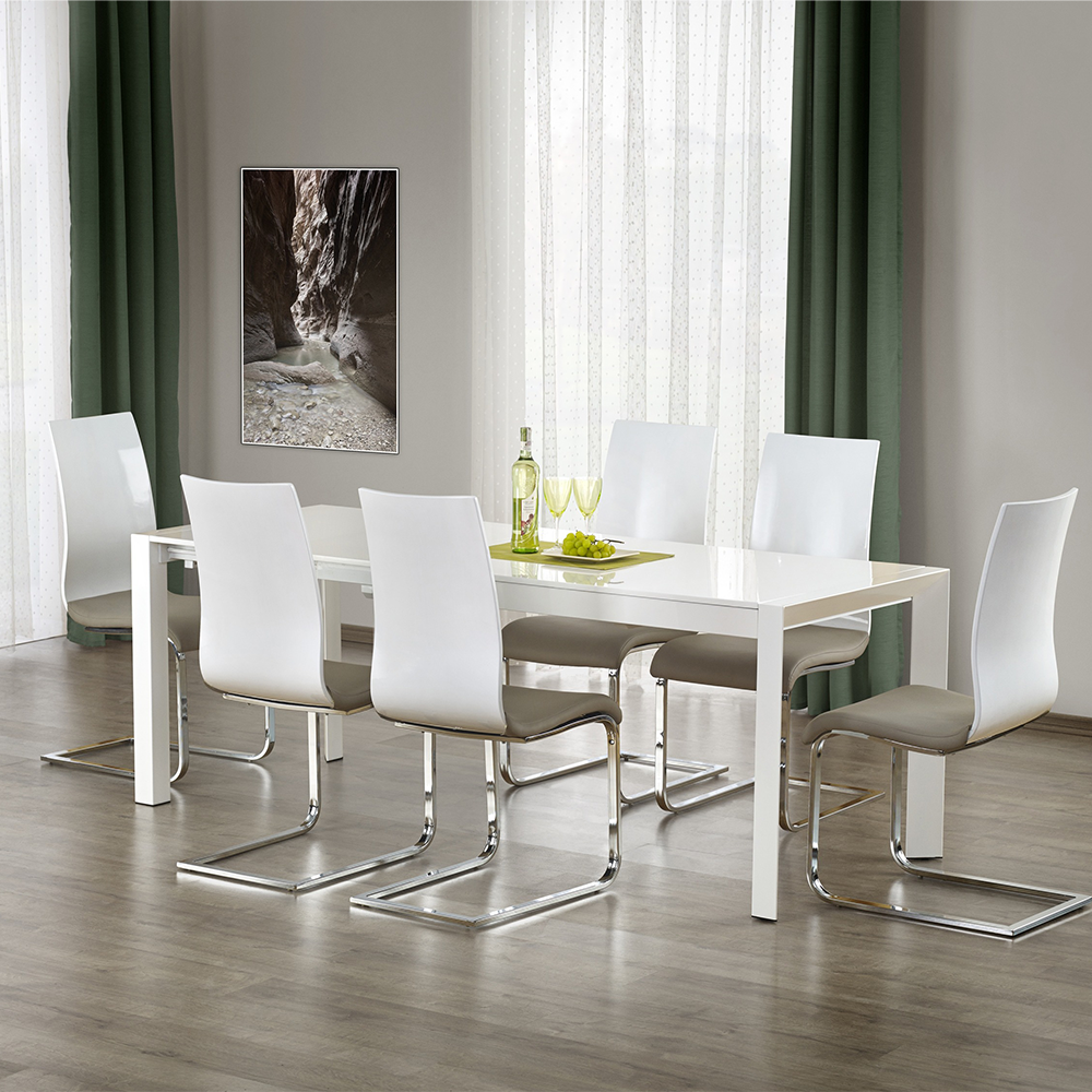 Stół STAN zachwyca prostą, minimalistyczną formą. Biały blat w wysokim połysku nadaje wnętrzu elegancji i lekkości, a stalowe nogi dodają mu nowoczesnego charakteru. Ten model świetnie odnajdzie się zarówno w przestrzeniach skandynawskich, loftowych, jak i klasycznych.