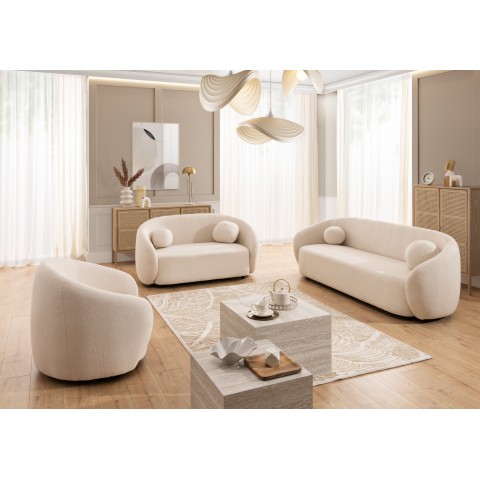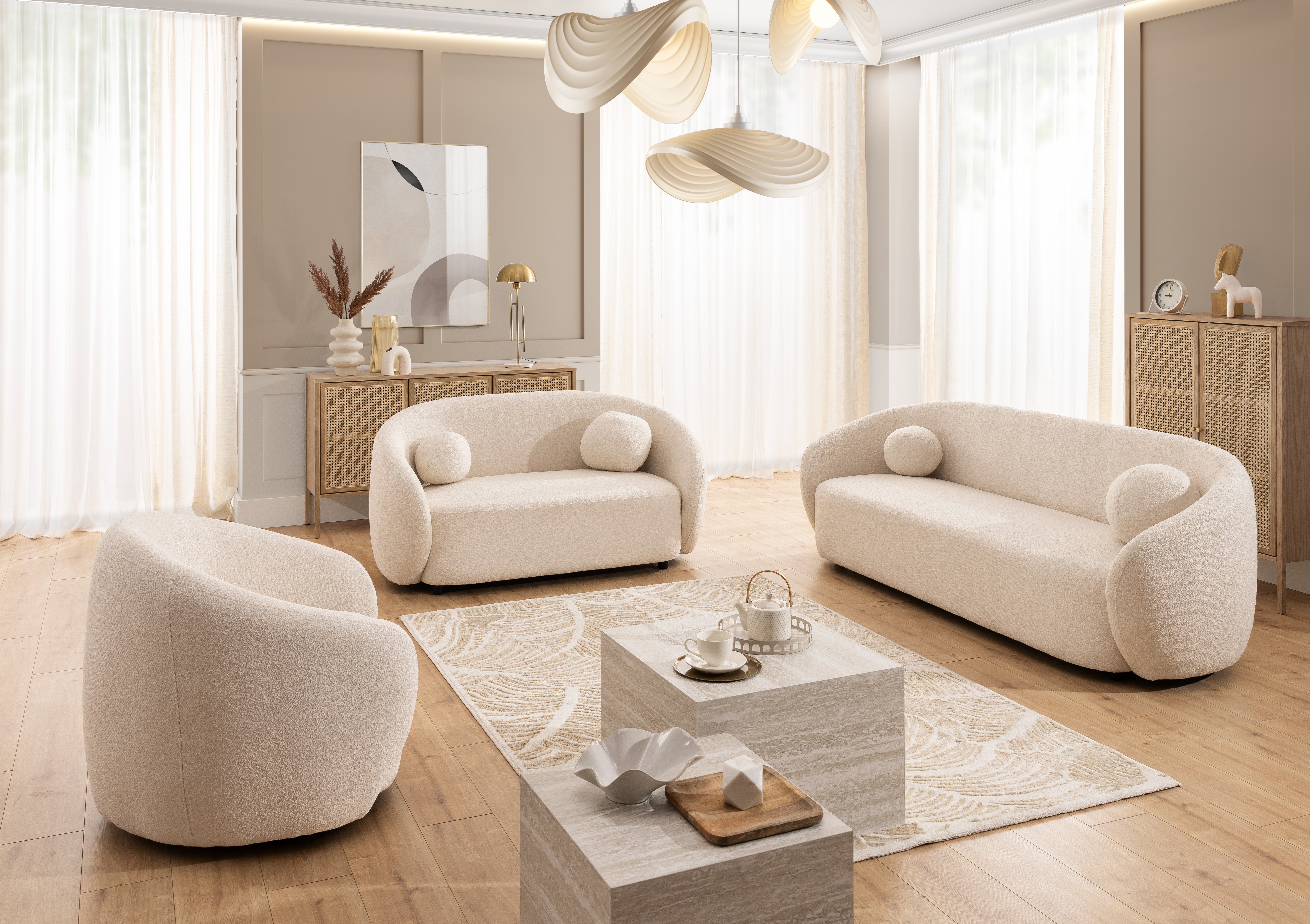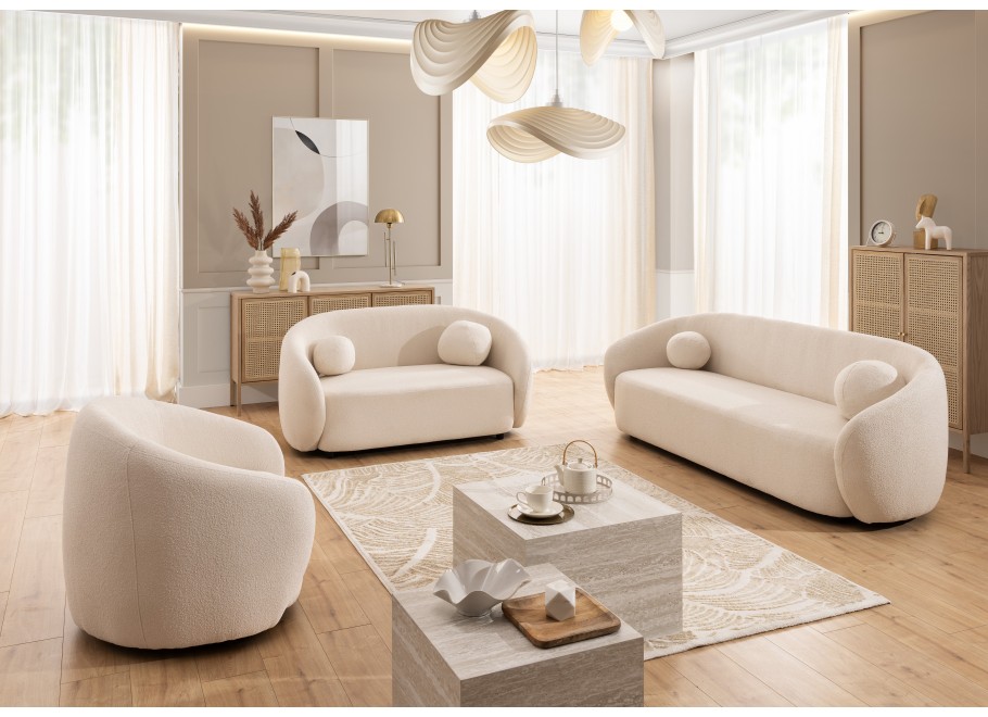 Sofa Cloudi w kolorze ecru świetnie prezentuje się solo, ale w zestawie z fotelem lub wersją dwuosobową tworzy spójną i komfortową strefę wypoczynkową, idealną do domowego relaksu.