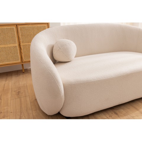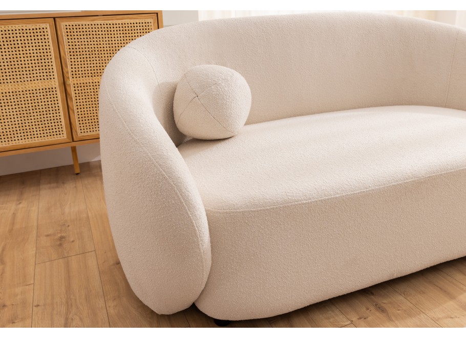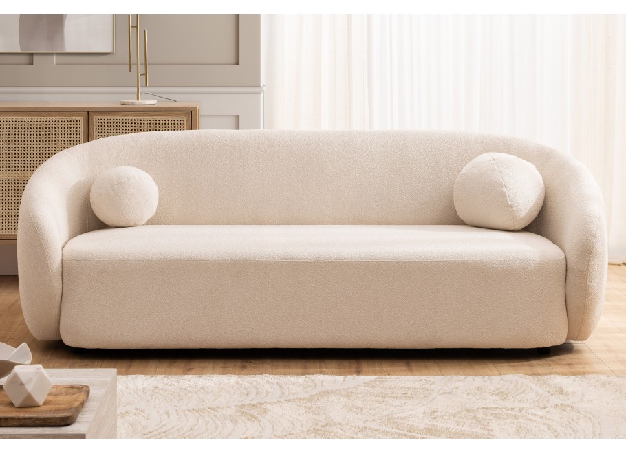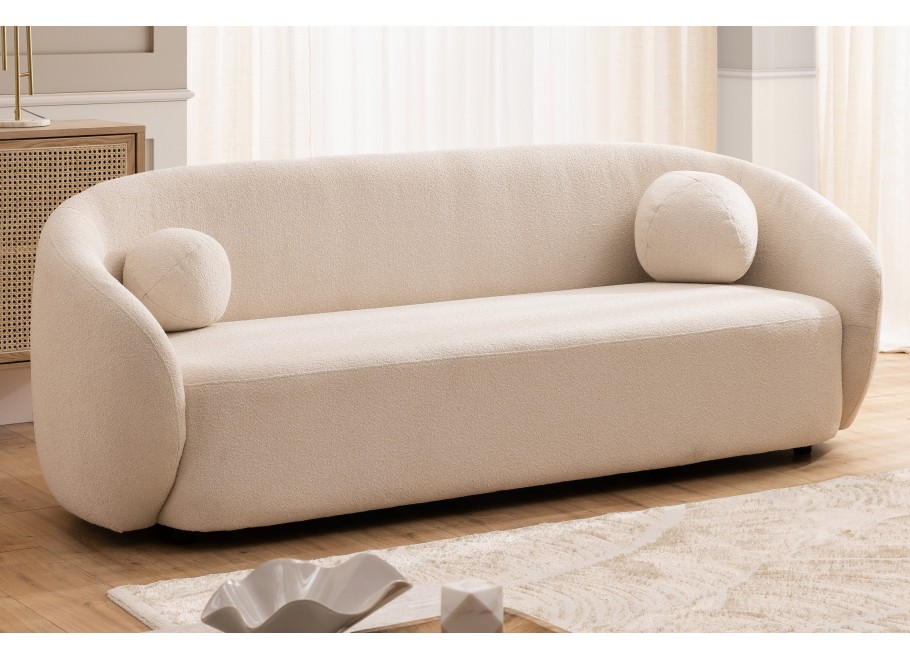 Sofa została zaprojektowana z myślą o estetyce i komforcie – zaokrąglone podłokietniki, płynne przejścia między oparciem a siedziskiem oraz delikatne linie boczne tworzą spójną, przytulną formę, która świetnie wygląda z każdej perspektywy. Charakterystyczne, dekoracyjne poduszki o okrągłym kształcie nie tylko dodają uroku, ale również zwiększają komfort podczas codziennego odpoczynku.