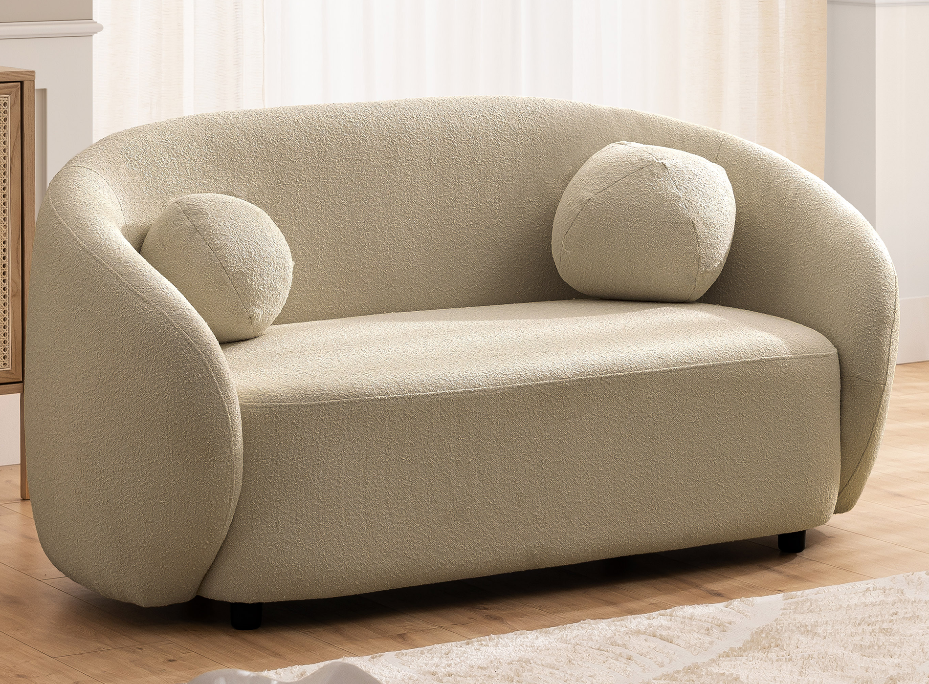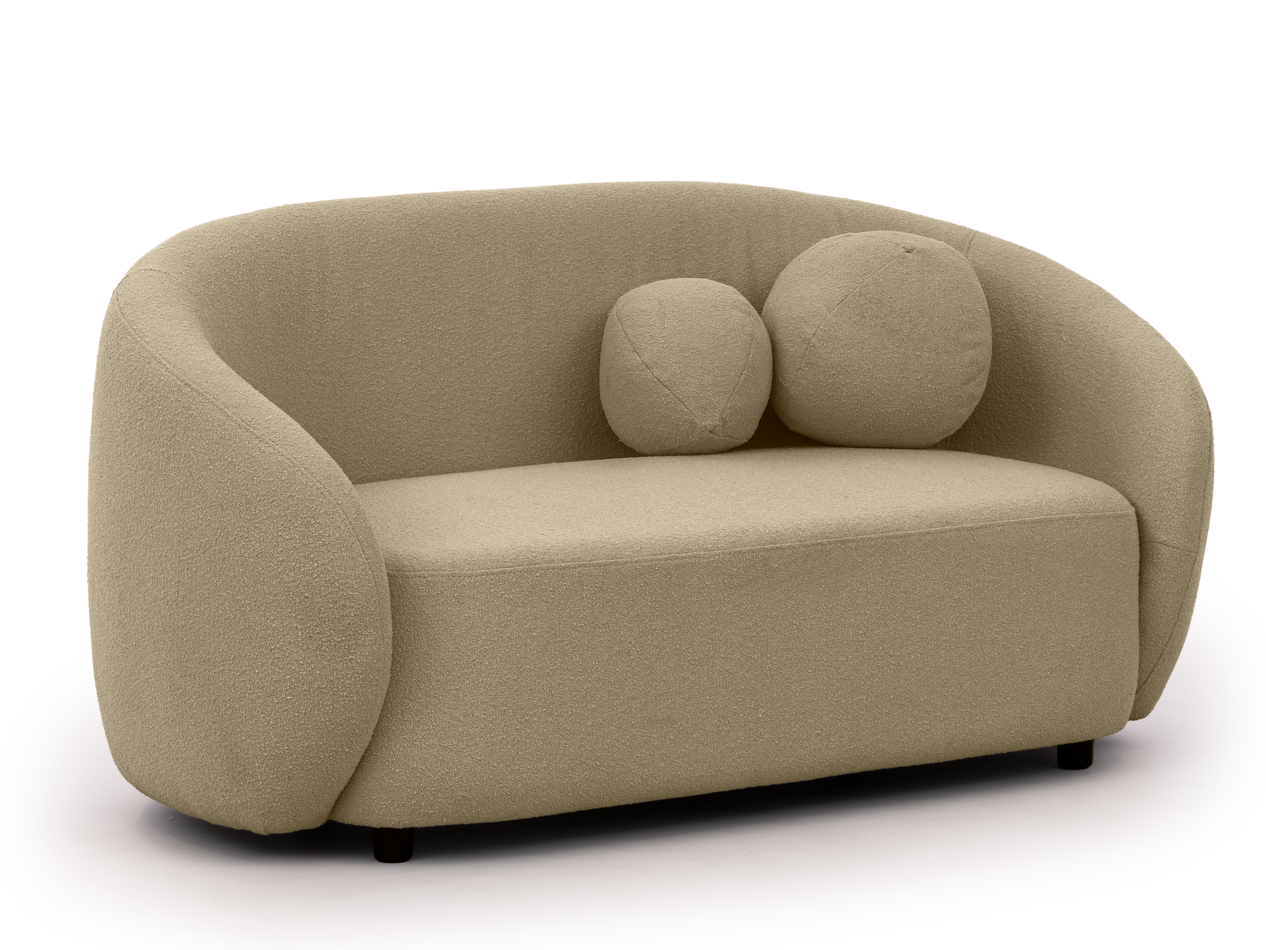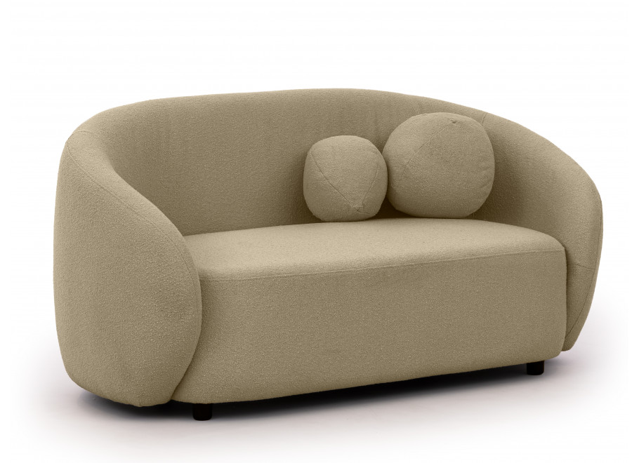 Dzięki płynnym przejściom między elementami siedziska, oparcia i boków sofa prezentuje się niezwykle lekko i spójnie. Okrągłe poduszki, charakterystyczne dla całej kolekcji, nie tylko podnoszą estetykę mebla, ale także zwiększają komfort odpoczynku. Ich forma i umiejscowienie dopełniają harmonijny wygląd całości.