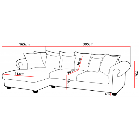 Ozdobne pikowania i przeszycia na oparciu i podłokietnikach podkreślają styl glamour, a zaokrąglone linie nadają meblowi przyjazny wygląd. Duże siedzisko (305 × 165 cm) i głębokość 58 cm zapewniają przestrzeń dla czterech osób, a wypełnienie z pianki poliuretanowej gwarantuje wygodę i sprężystość.