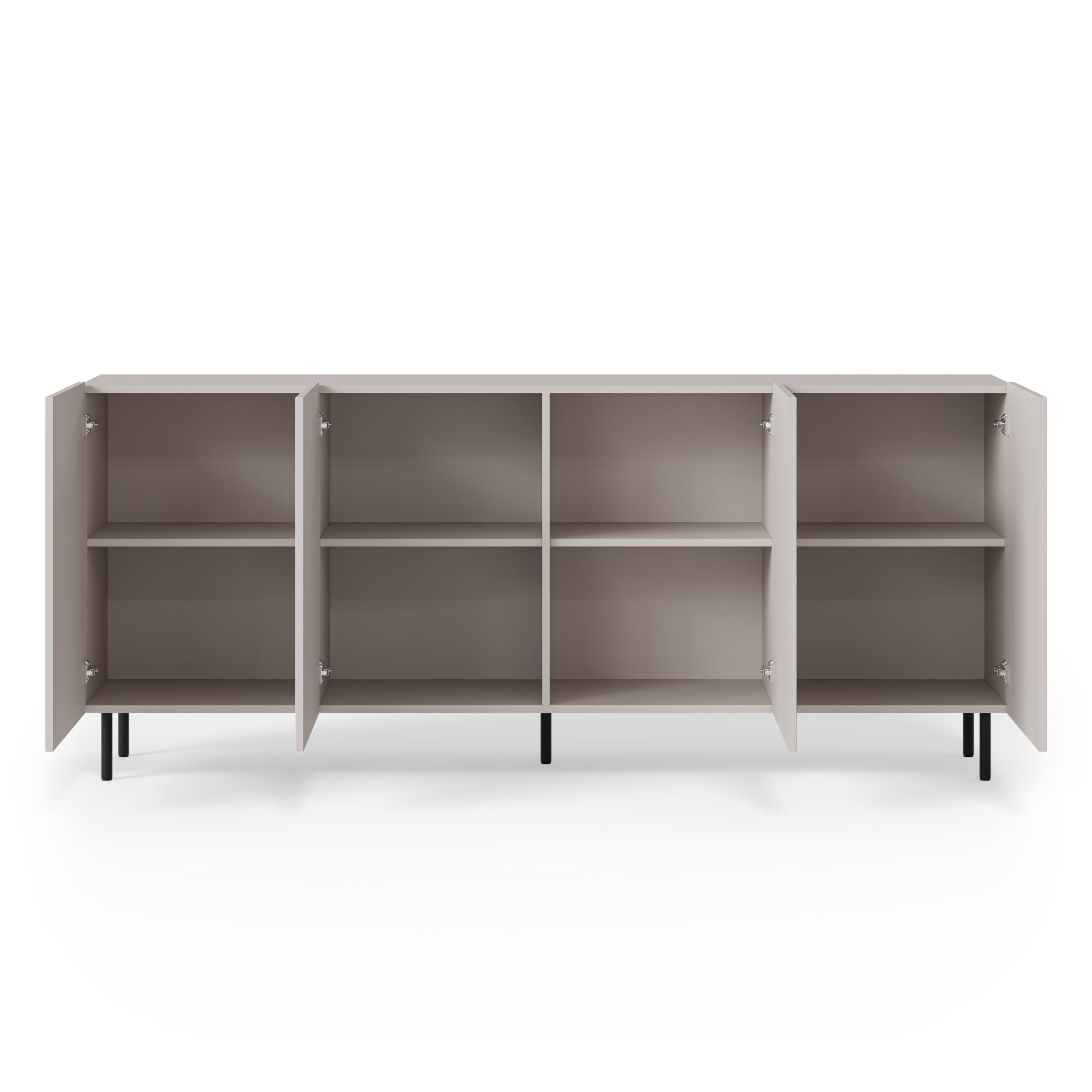 Komoda RAX II oferuje cztery pojemne szafki, każda wyposażona w dodatkową półkę. To funkcjonalna przestrzeń do przechowywania – od dokumentów, przez książki i tekstylia, aż po zastawę stołową czy dekoracje.