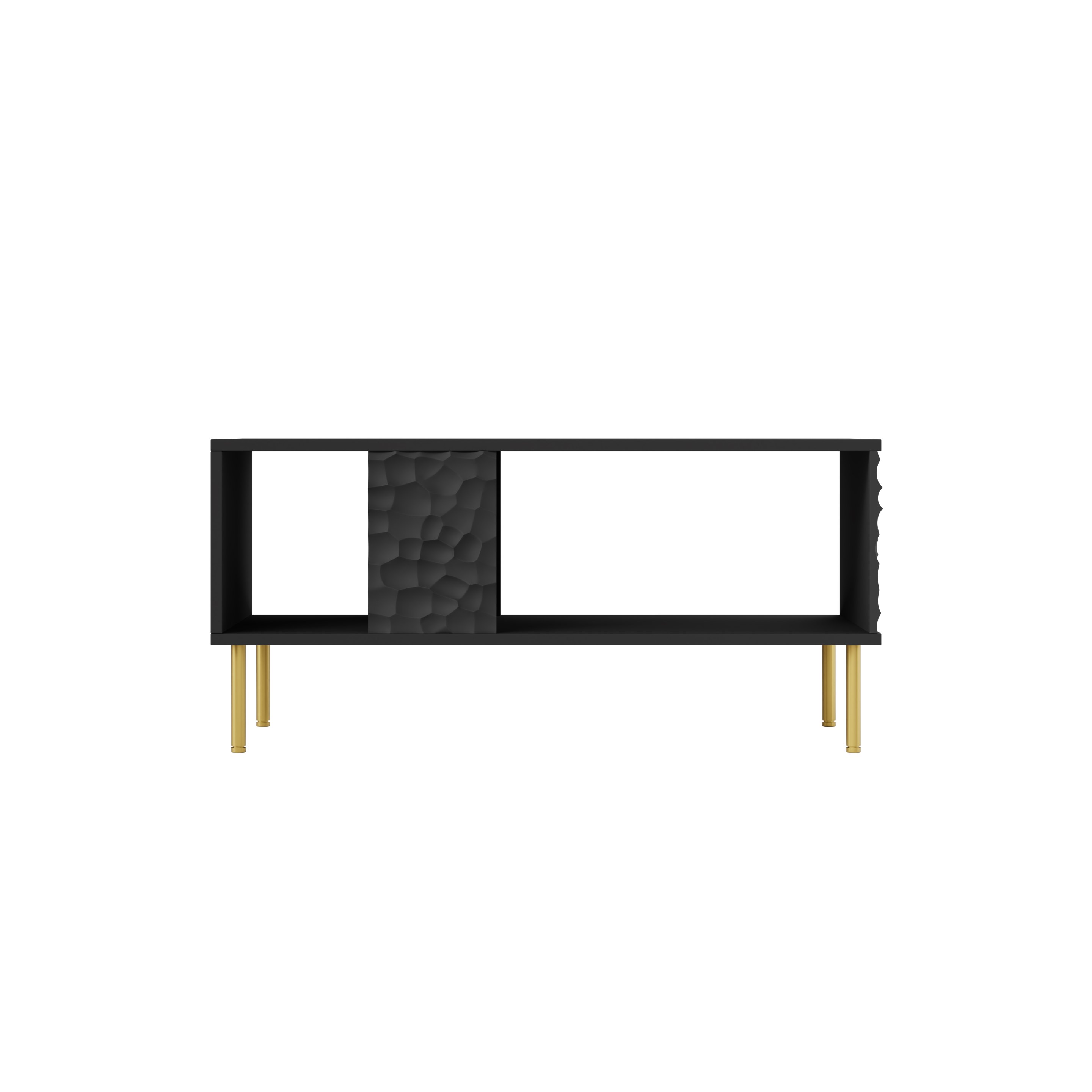 To, co wyróżnia ławę na tle innych modeli, to trójwymiarowa struktura zastosowana na bocznych i środkowych powierzchniach – inspirowana naturalnym kamieniem, dodaje głębi, wyrafinowania i artystycznego charakteru. Matowa czerń kontrastująca ze złotymi nogami to klasyka w nowoczesnym wydaniu – ponadczasowa, a zarazem świeża.