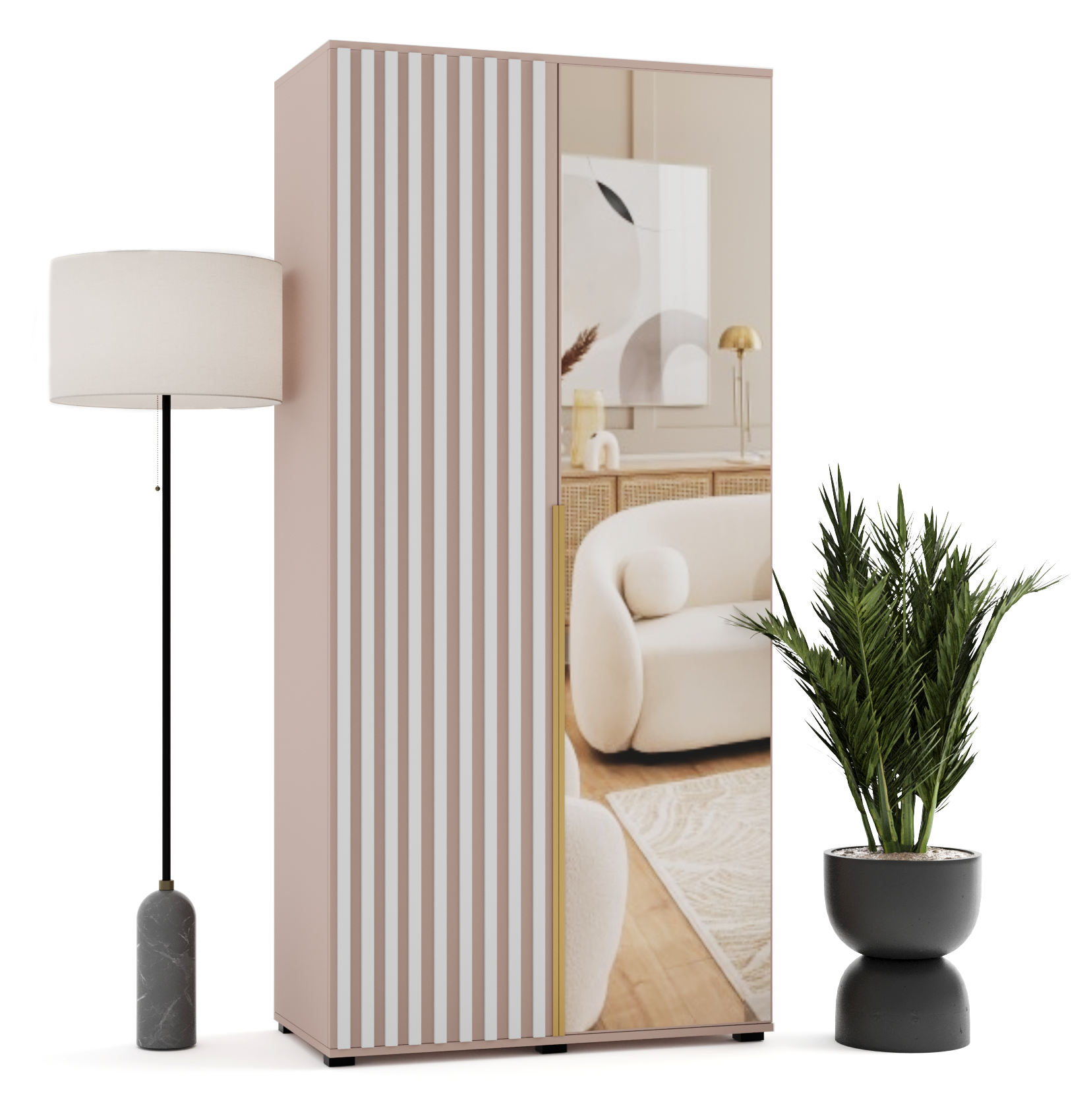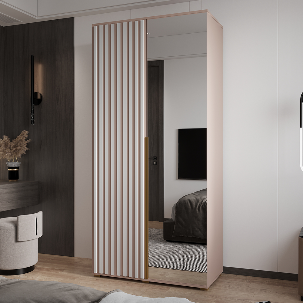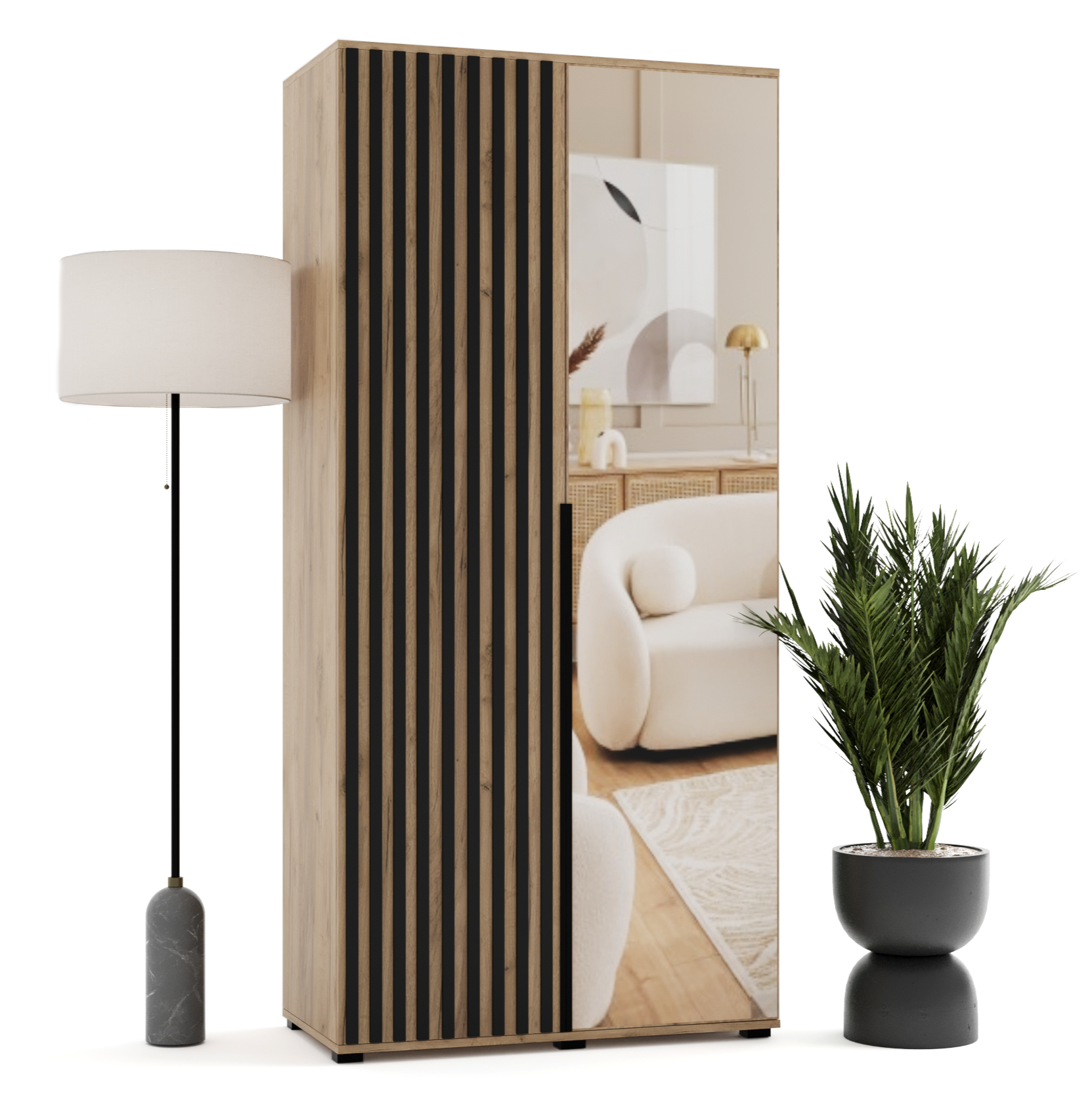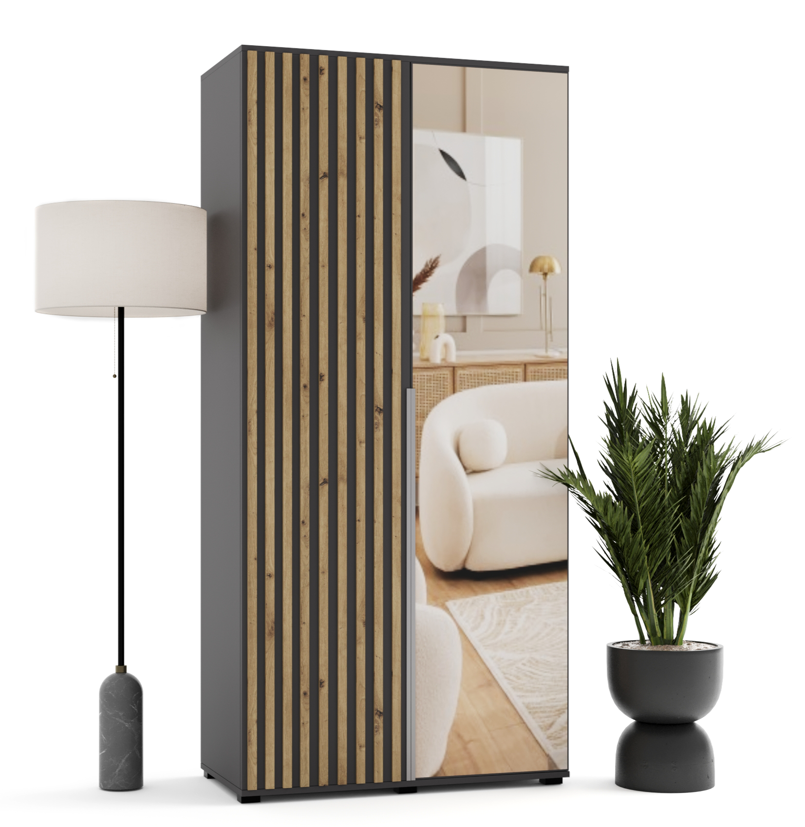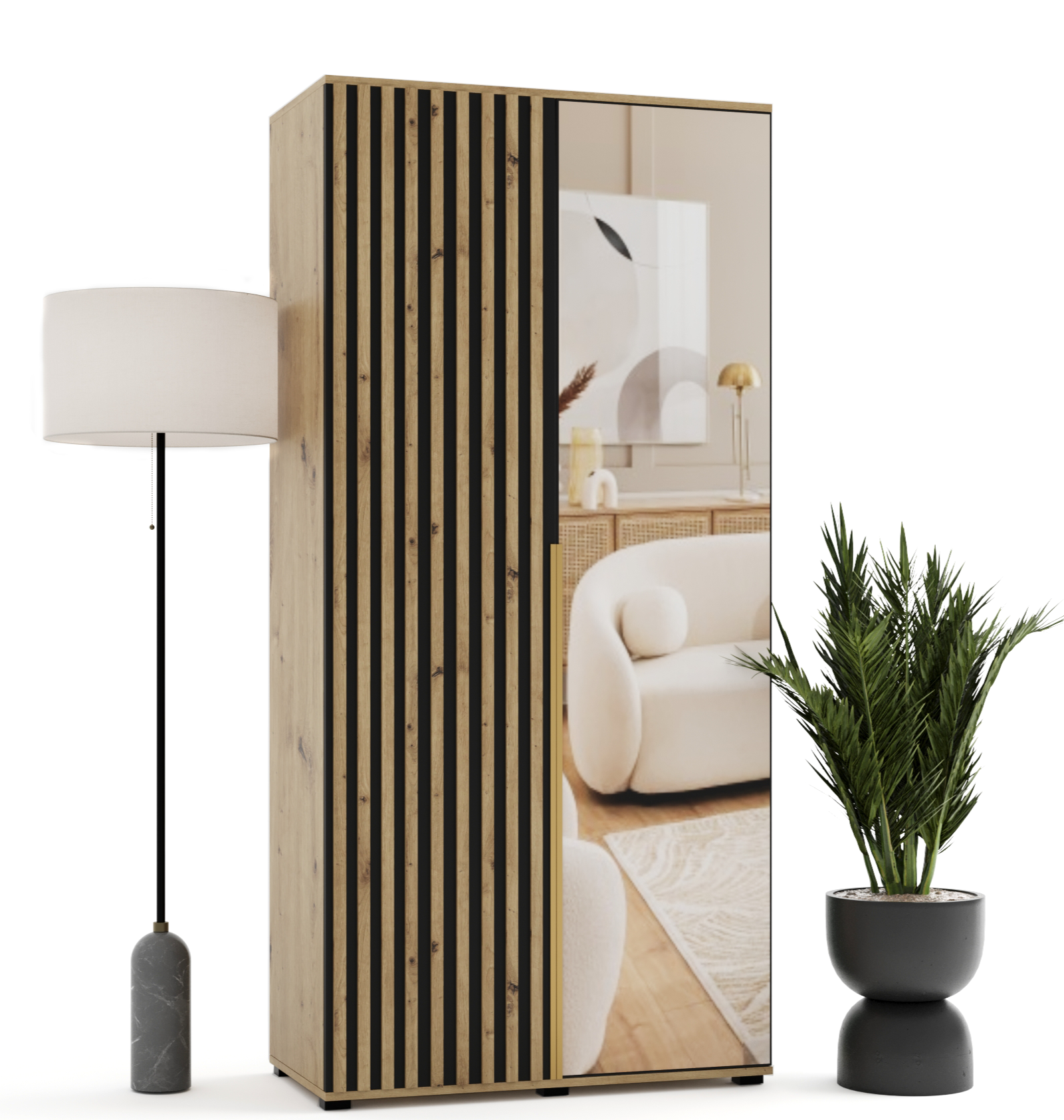Na froncie tej szafy znajdują się pionowe lamele o grubości 2,5 cm, rozmieszczone co 5 cm. Lamele dostępne są w trzech wariantach kolorystycznych: dąb artisan, czarne lub białe. Drugi front wykończony jest lustrem, które nadaje meblowi elegancji i optycznie powiększa przestrzeń.