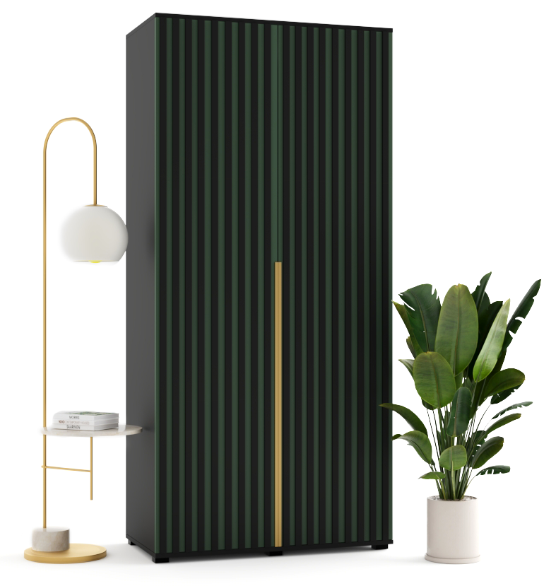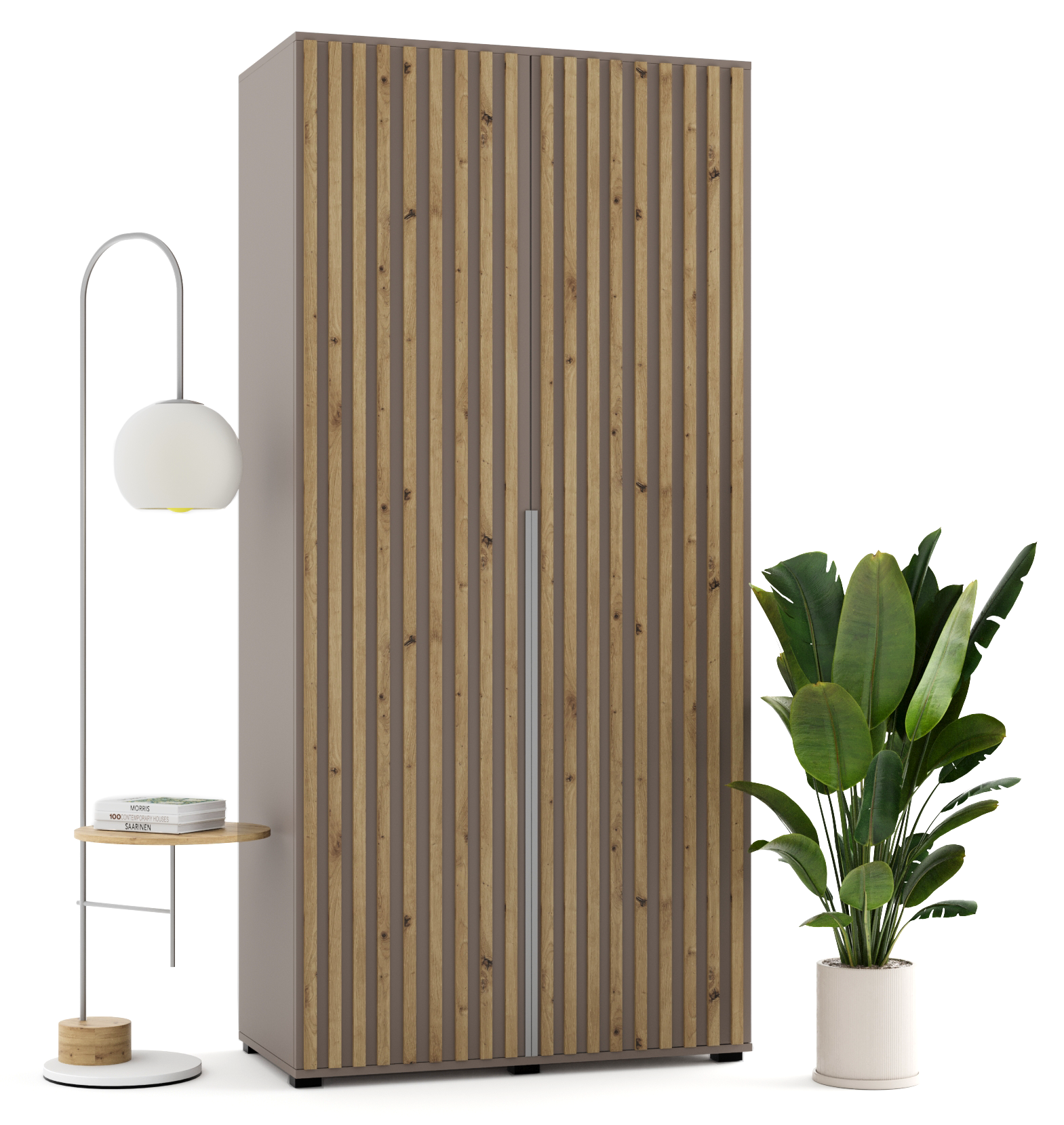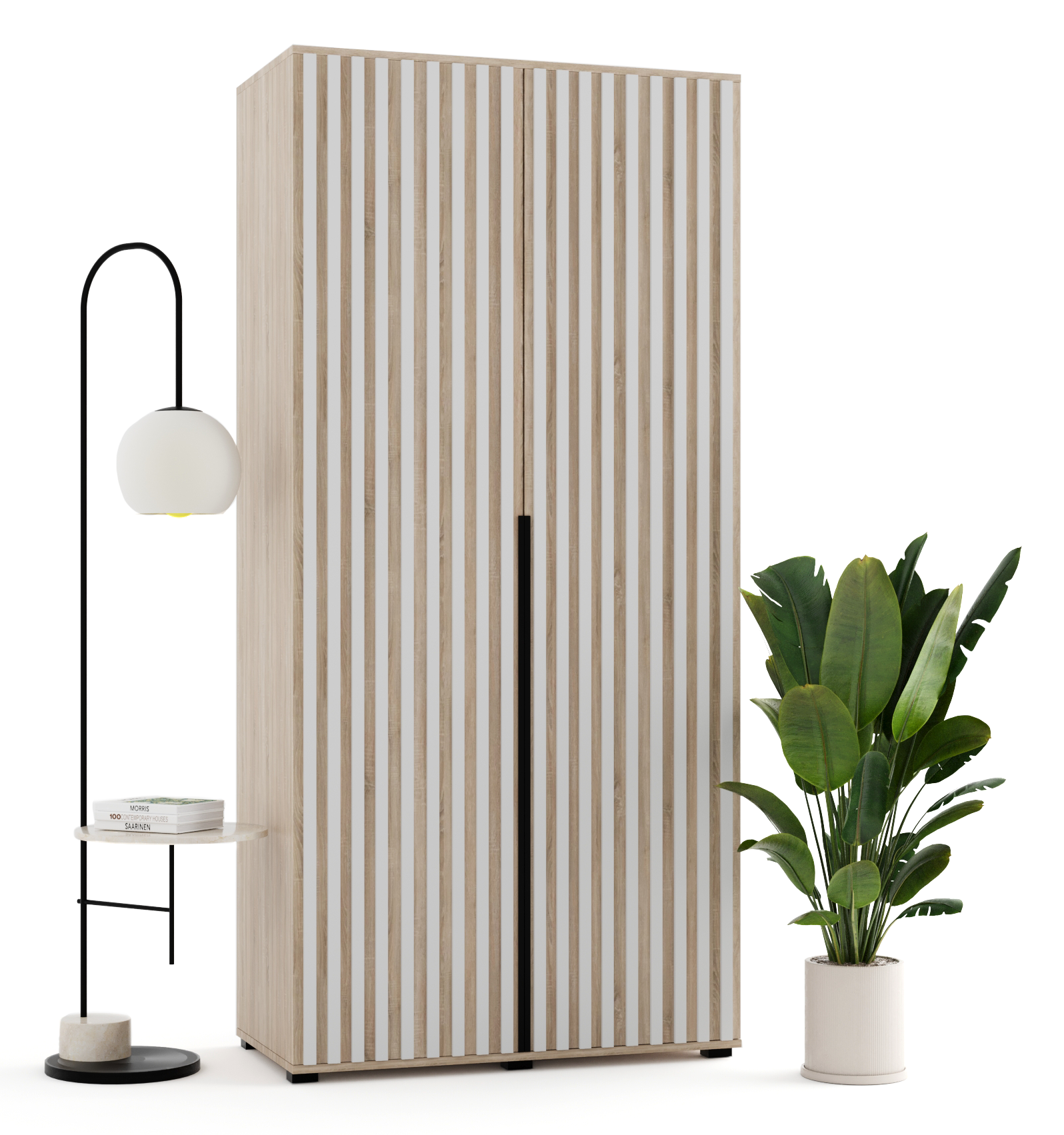 Na froncie szafy znajdują się pionowe lamele rozmieszczone w równych odstępach co 5 cm. Każda lamel ma 2,5 cm szerokości, a ich liczba zależy od całkowitej szerokości szafy. Lamele dostępne są w trzech wariantach kolorystycznych: białe, czarne oraz dąb artisan, co pozwala dopasować wygląd mebla do różnych aranżacji wnętrz.