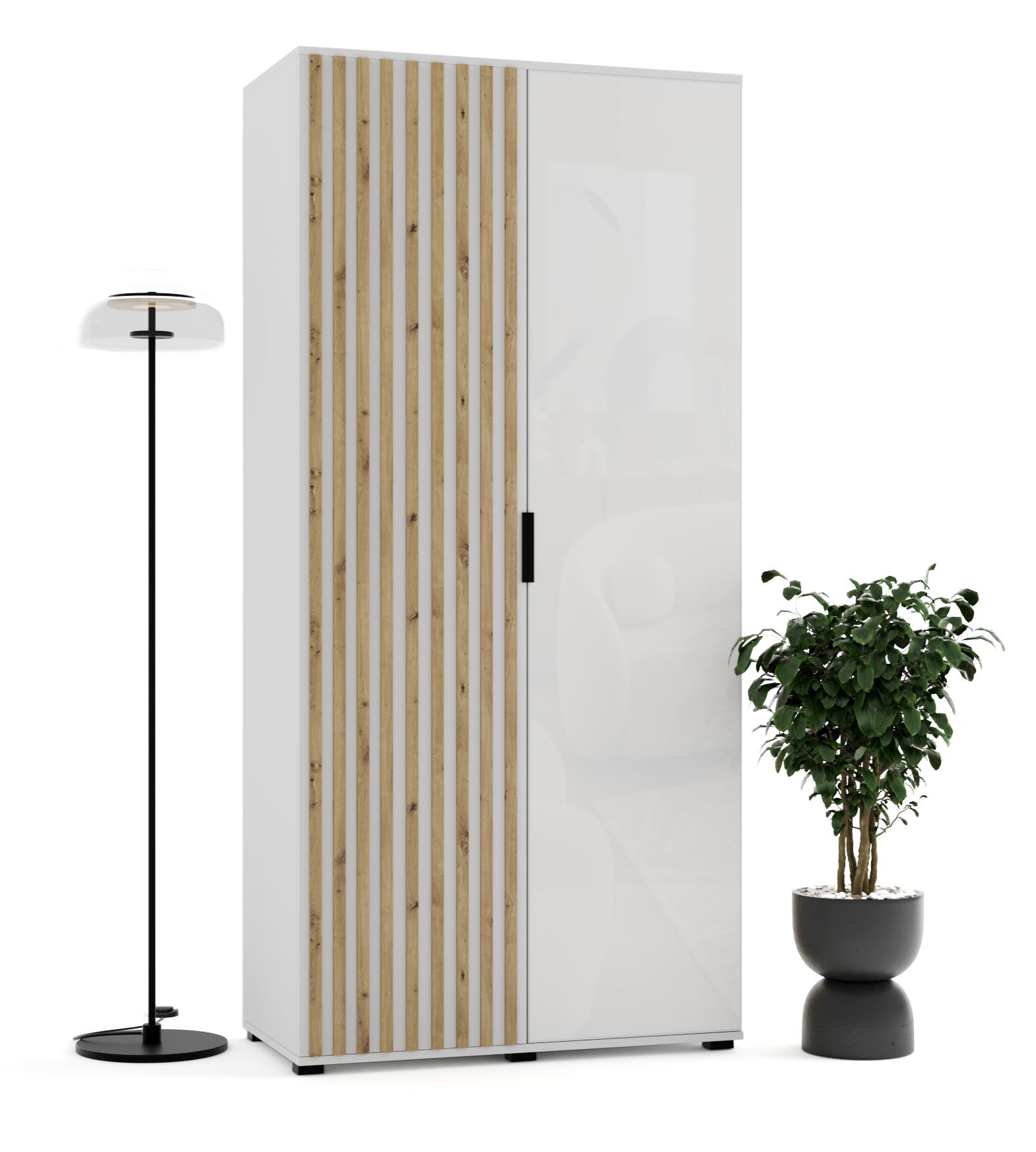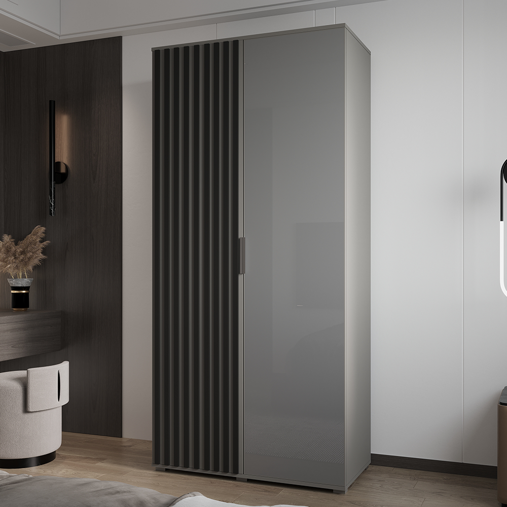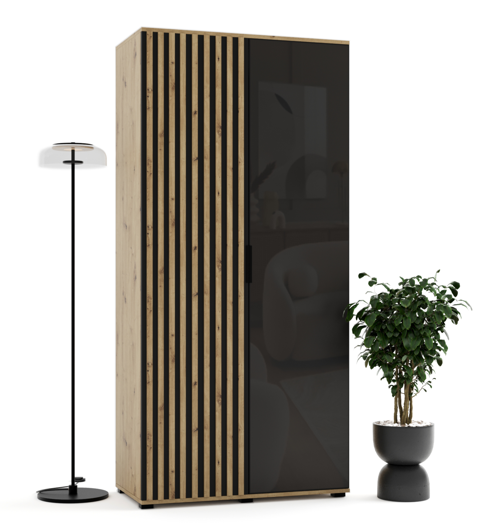 Na froncie tej szafy znajdują się pionowe lamele o grubości 2,5 cm, rozmieszczone co 5 cm. Lamele dostępne są w trzech wariantach kolorystycznych: dąb artisan, czarne lub białe. Drugi front wykończony jest szkłem lacobel, które można wybrać w jednym z czterech kolorów: szary, biały, czarny lub wanilia.