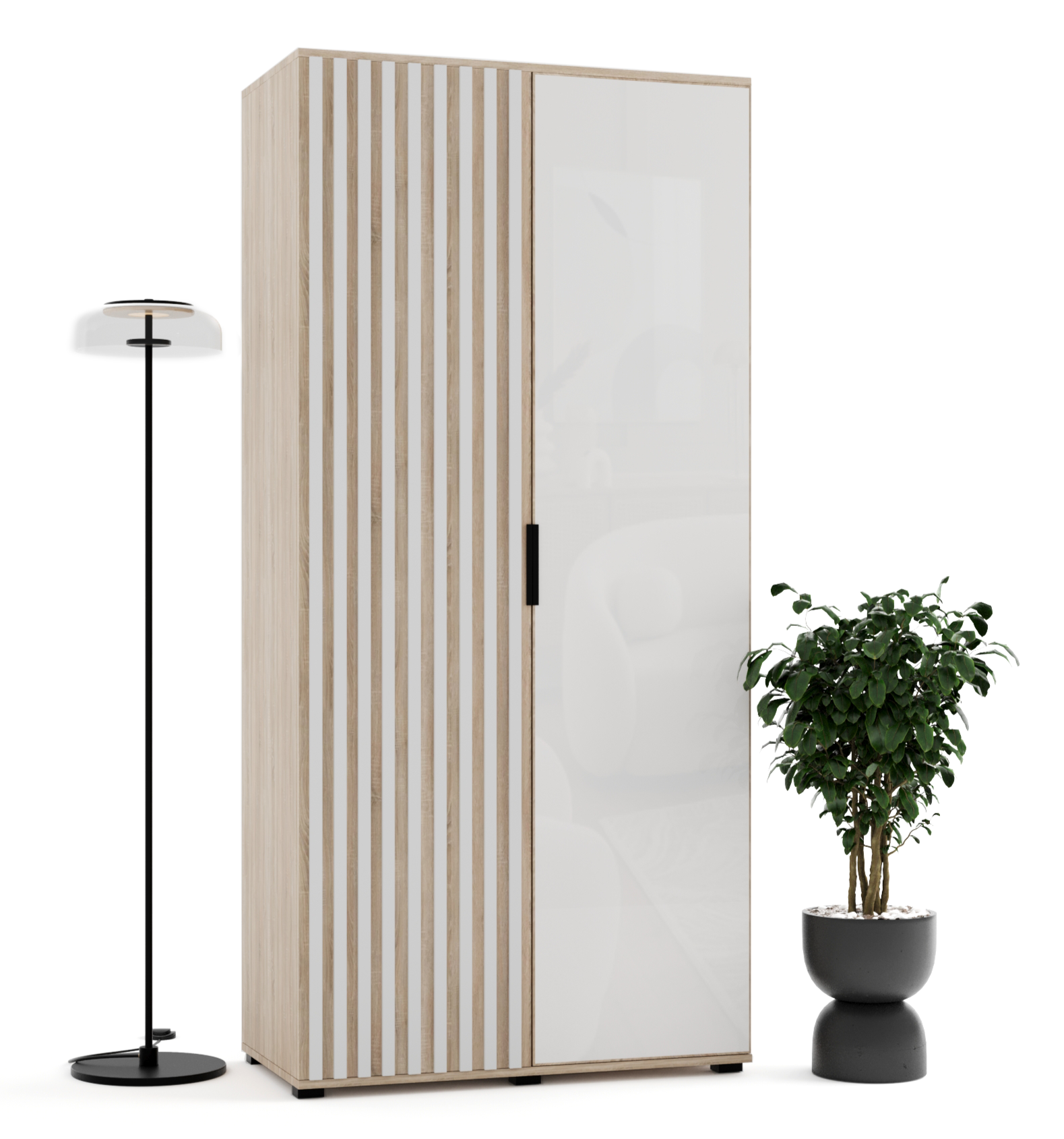 Korpus oraz fronty mebla wykonane są z wysokiej jakości płyty wiórowej o grubości 18 mm , dostępnej w 13 wariantach kolorystycznych. To solidny i trwały materiał, który zapewnia długą żywotność szafy, odporność na codzienne użytkowanie i łatwość w utrzymaniu czystości. Klasyczna, a zarazem nowoczesna forma szafy otwieranej idealnie odnajdzie się w różnych aranżacjach – od minimalistycznych, przez skandynawskie, aż po bardziej nowoczesne czy klasyczne wnętrza.