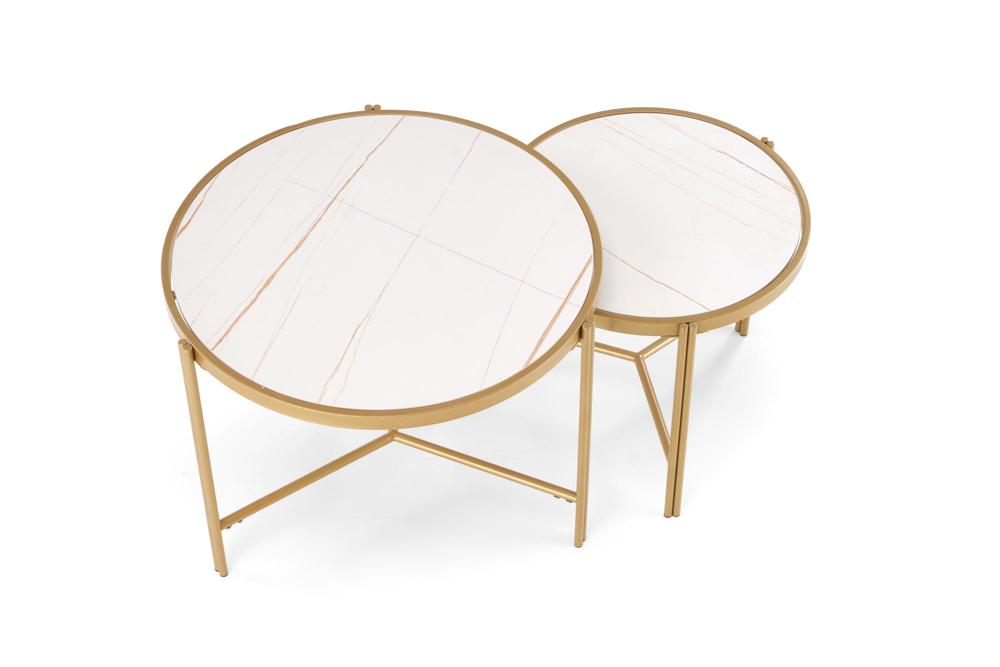 Zestaw stolików Fart to propozycja dla osób, które cenią elegancję, nowoczesny design i funkcjonalność w jednym. Dzięki zastosowaniu wysokiej jakości spieku imitującego biały marmur, blaty prezentują się niezwykle szlachetnie i luksusowo. Delikatne żyłkowania w ciepłych odcieniach beżu nadają im naturalny, kamienny charakter, który pięknie współgra z modną złotą ramą.
