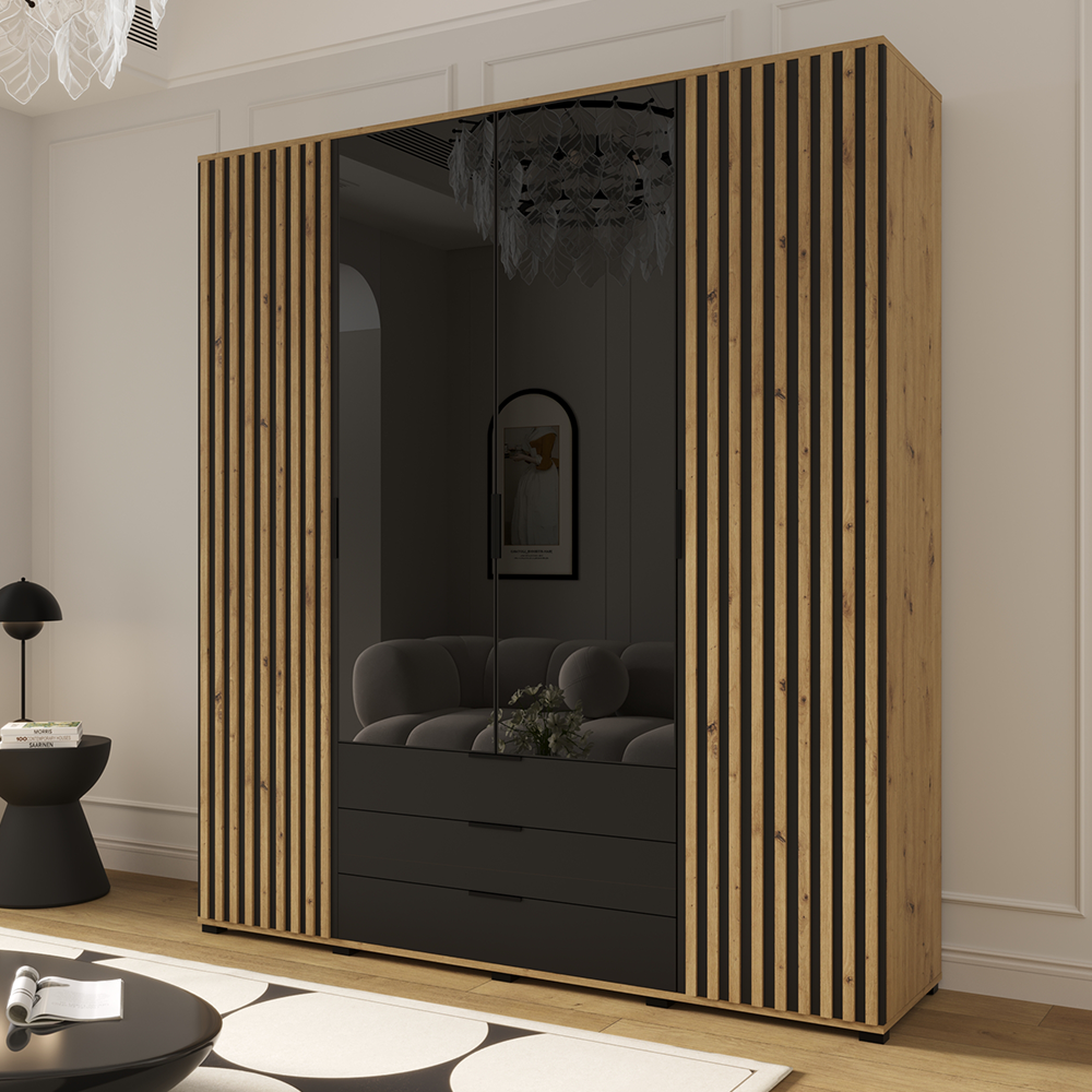 Na froncie tej szafy znajdują się pionowe lamele o grubości 2,5 cm, rozmieszczone co 5 cm. Lamele dostępne są w trzech wariantach kolorystycznych: dąb artisan, czarne lub białe. Środkowy front wykończony jest szkłem lacobel, które można wybrać w jednym z czterech kolorów: szary, biały, czarny lub wanilia.