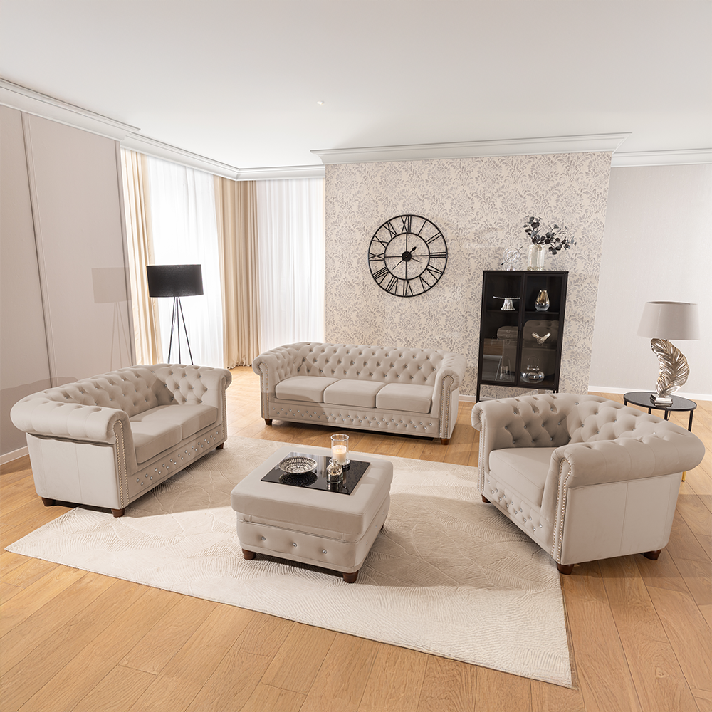 Zestaw FELIX BLINK składa się z dwóch elementów: trzyosobowej kanapy i fotela, oferując łącznie 4 wygodne miejsca siedzące. Każdy mebel zachwyca precyzyjnym pikowaniem w stylu Chesterfield oraz wyjątkowym wykończeniem z kryształkami – do wyboru w wersji złotej lub srebrnej. Te eleganckie detale nadają zestawowi niepowtarzalny blask i podkreślają jego ekskluzywny charakter.