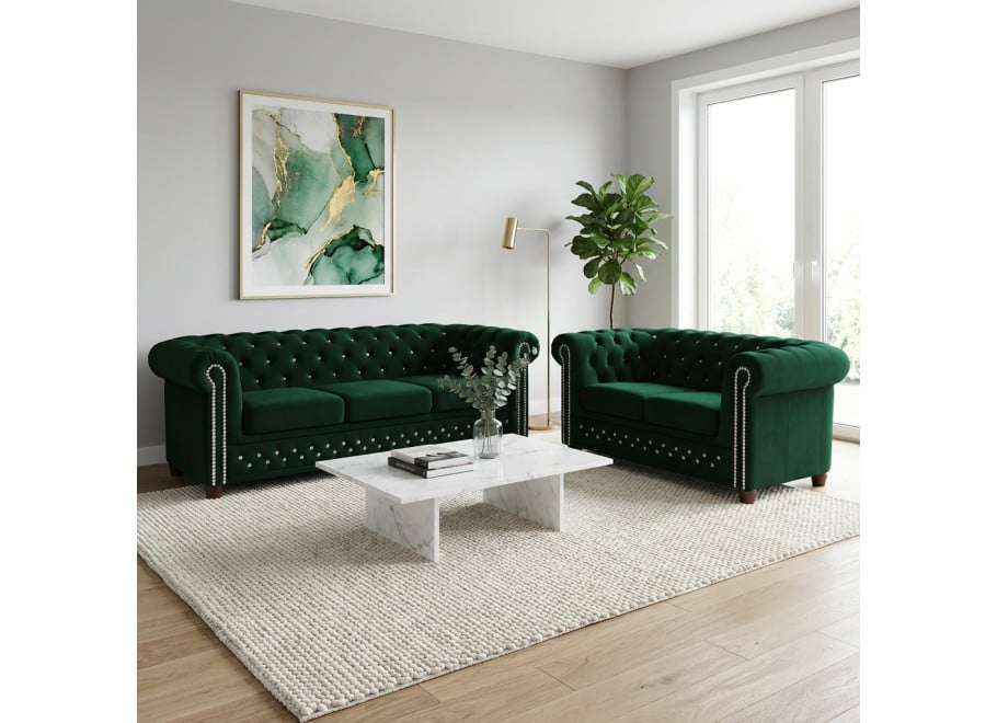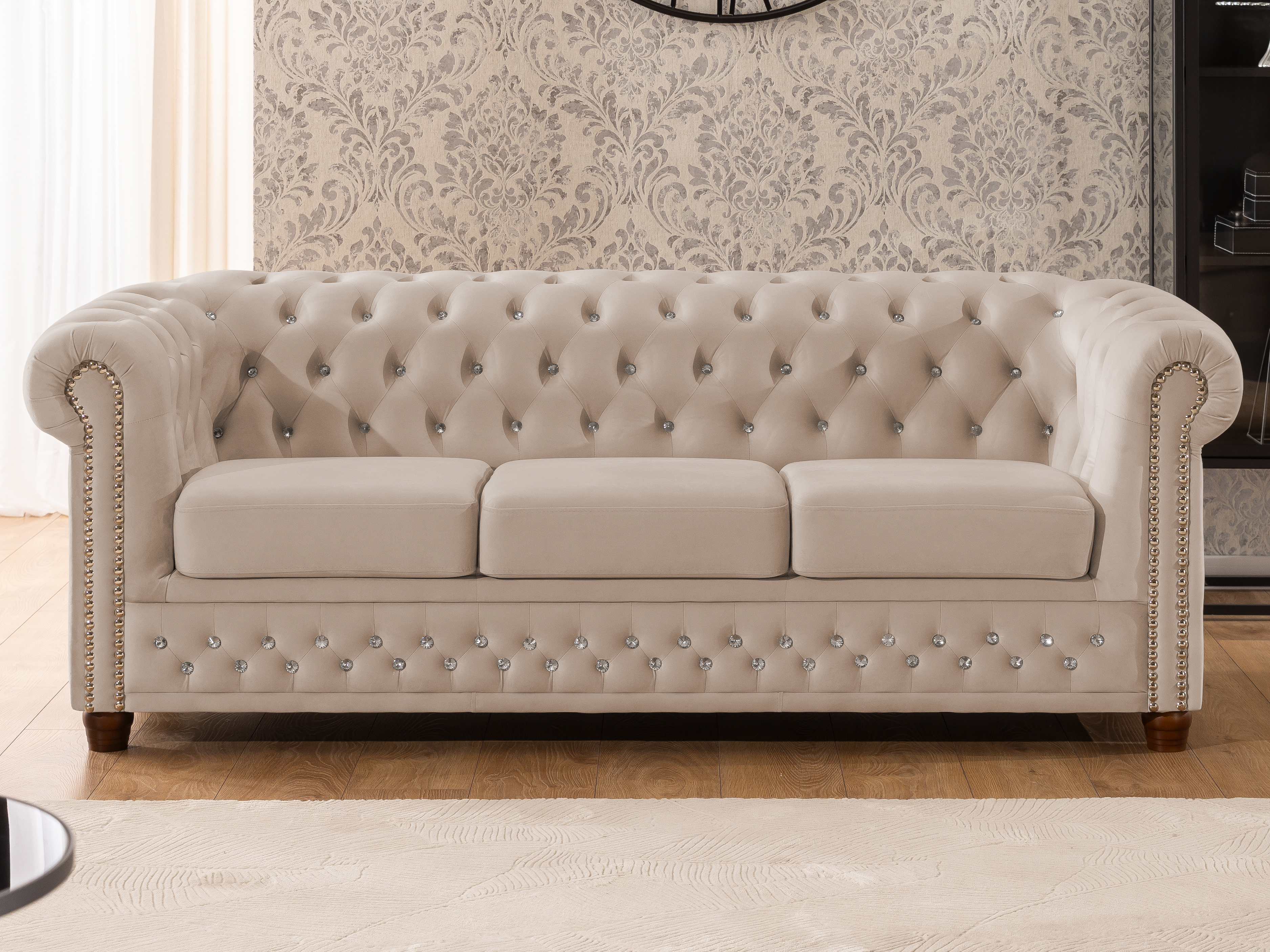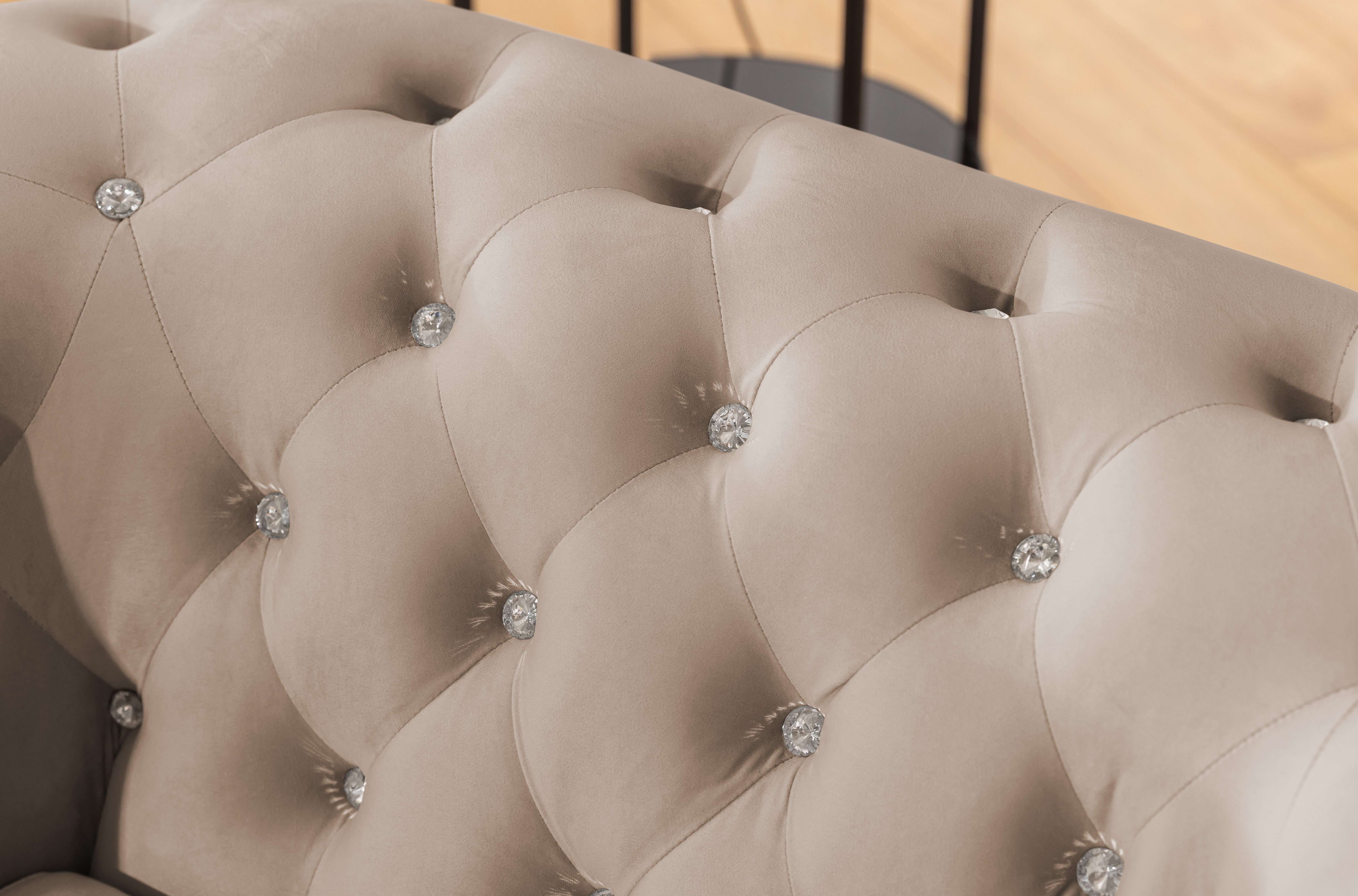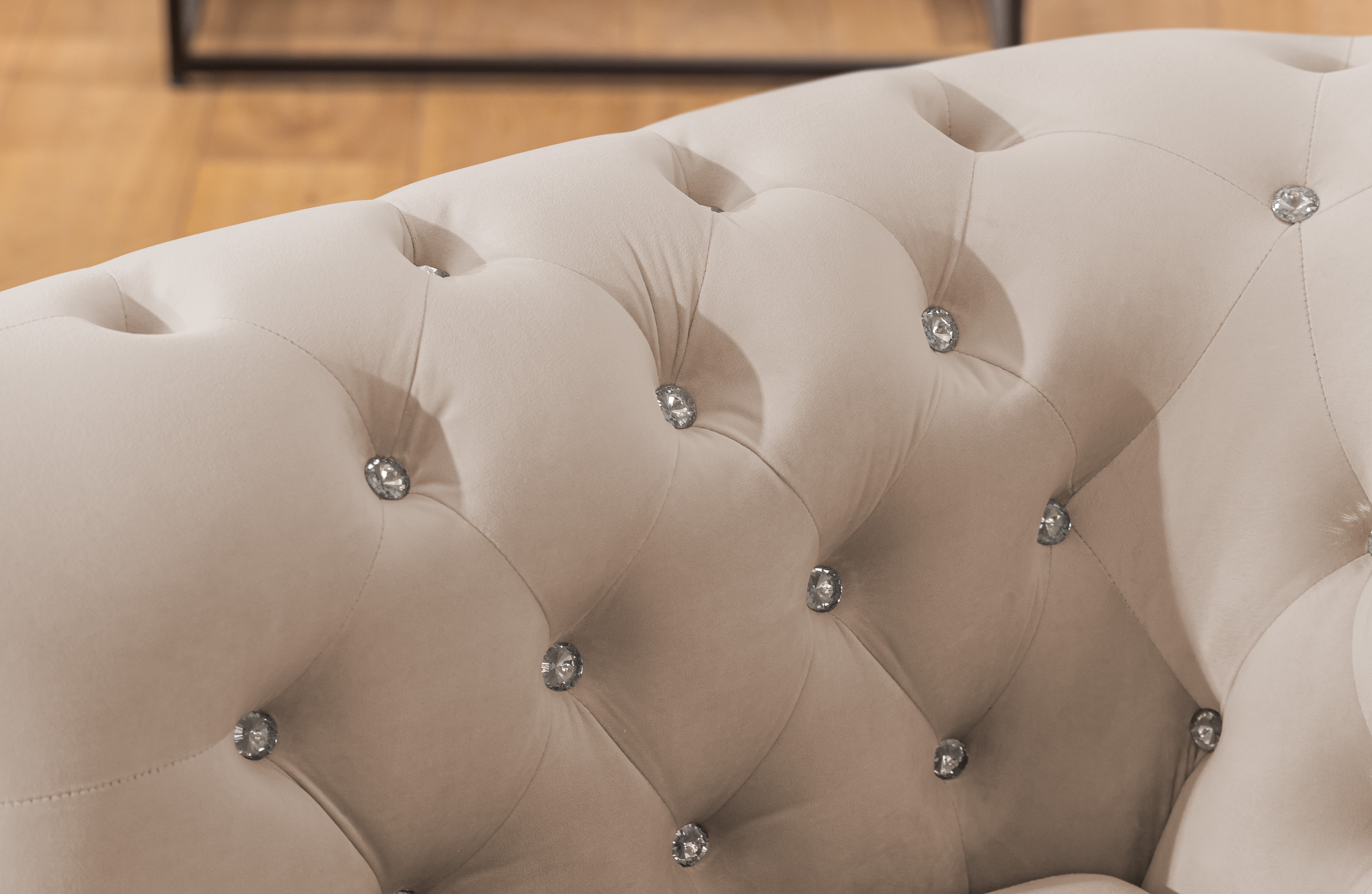 Zestaw FELIX BLINK składa się z dwóch elementów: trzyosobowej kanapy i fotela, oferując łącznie 4 wygodne miejsca siedzące. Każdy mebel zachwyca precyzyjnym pikowaniem w stylu Chesterfield oraz wyjątkowym wykończeniem z kryształkami – do wyboru w wersji złotej lub srebrnej. Te eleganckie detale nadają zestawowi niepowtarzalny blask i podkreślają jego ekskluzywny charakter.