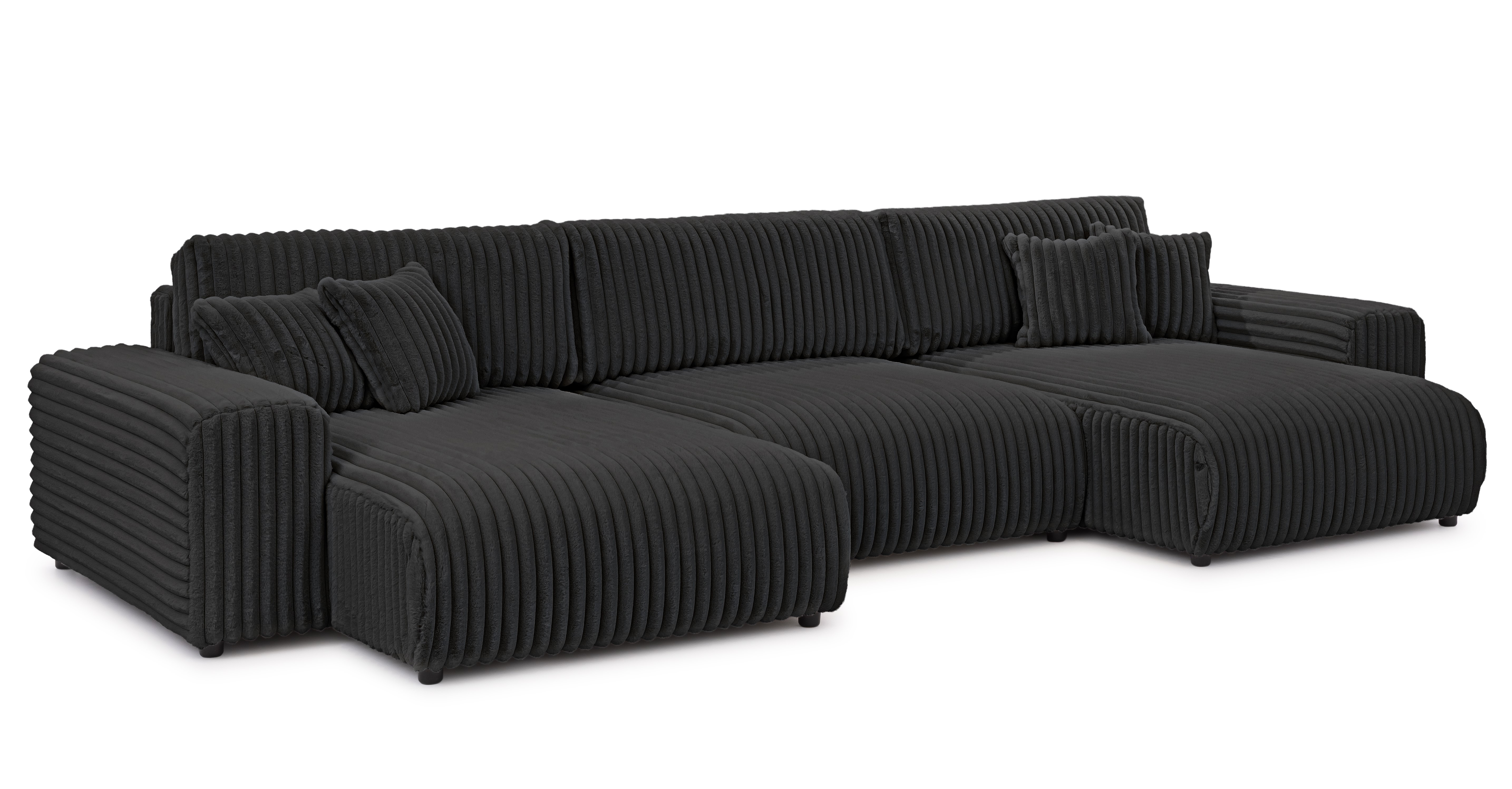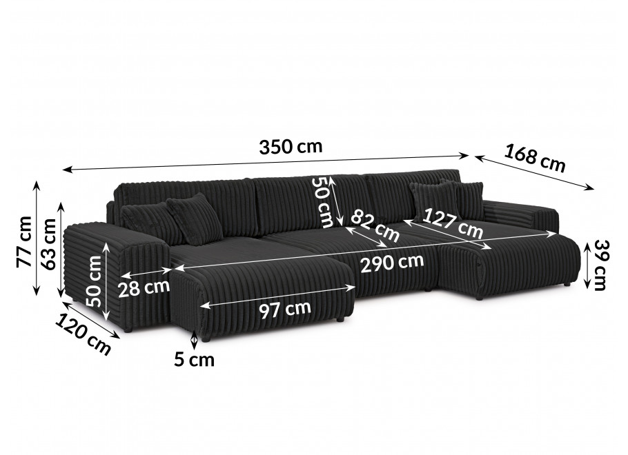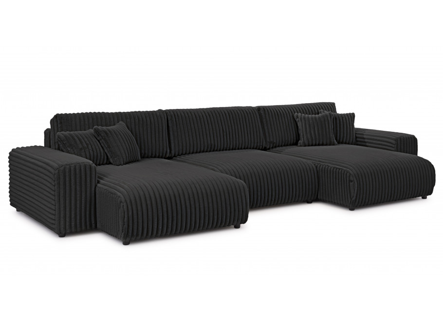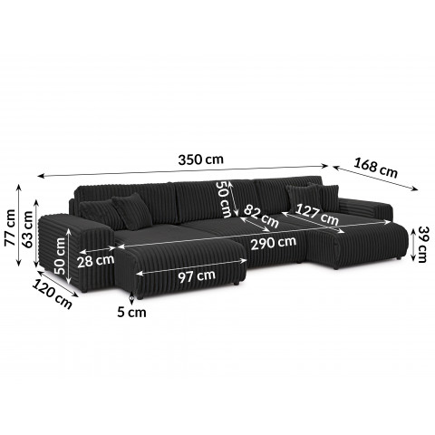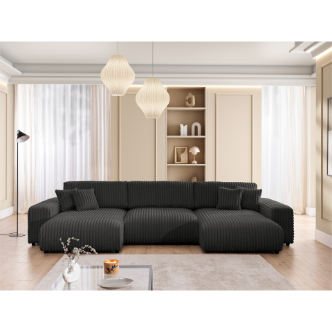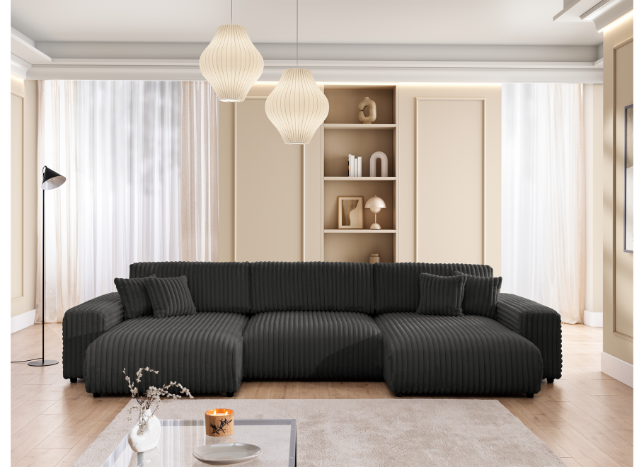 Bryła w kształcie litery U oferuje dużo miejsca do codziennego wypoczynku. Siedziska wypełnione wysokoelastyczną pianką poliuretanową są sprężyste i wygodne, a oparcia wraz z poduszkami dekoracyjnymi dbają o prawidłowe podparcie pleców. To narożnik, który zapewnia relaks zarówno podczas krótkiej chwili odpoczynku, jak i wielogodzinnego korzystania.