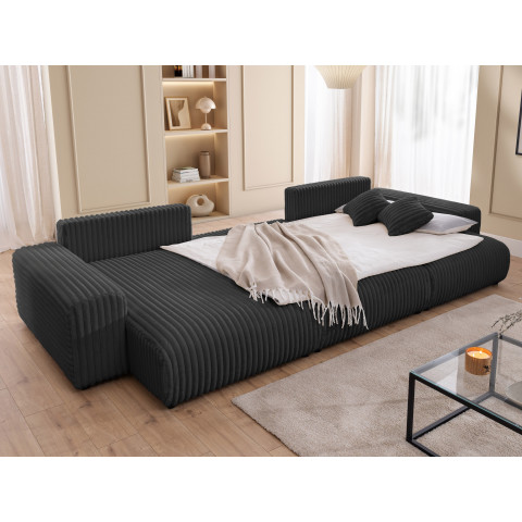 Grafitowy Nubo to również funkcjonalne rozwiązanie – rozkładany mechanizm pozwala w prosty sposób przekształcić narożnik w wygodne łóżko. Duży pojemnik na pościel pozwala uporządkować kołdry, poduszki i koce, dzięki czemu salon zawsze pozostaje schludny.