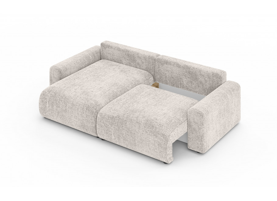 Praktycznym atutem modelu jest funkcja spania – w kilka chwil narożnik można zmienić w wygodne łóżko. To rozwiązanie sprawdzi się zarówno podczas wizyty gości, jak i w codziennym użytkowaniu. Dodatkowo pojemny schowek na pościel pozwala uporządkować koce, kołdry czy poduszki, oszczędzając miejsce w szafach i dbając o porządek w salonie.