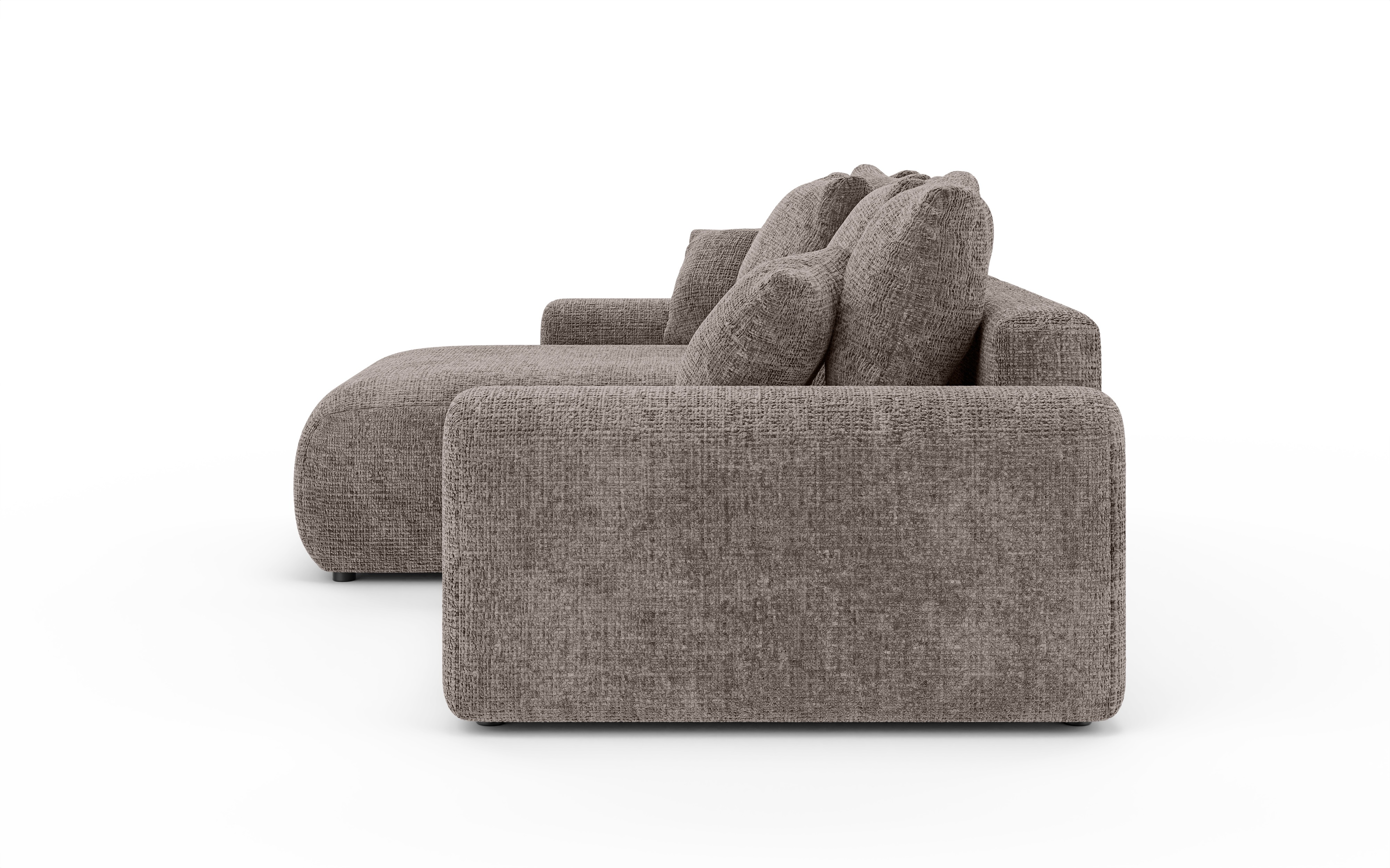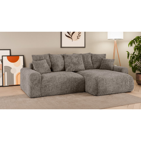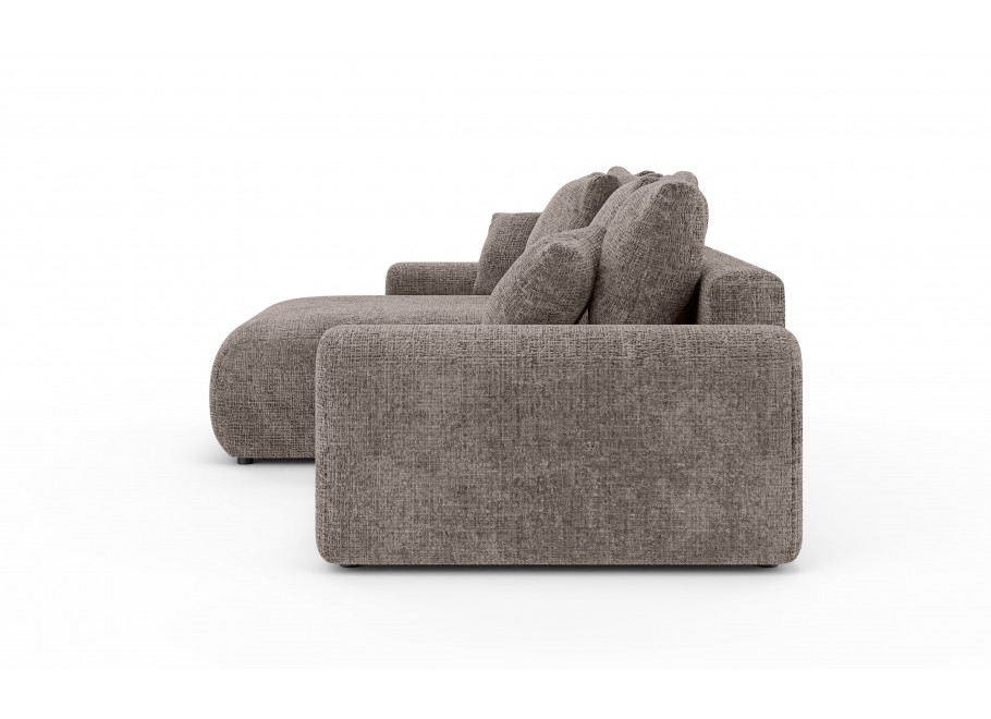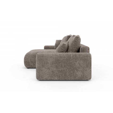 Dużym atutem brązowej wersji jest funkcja spania – w kilka chwil narożnik można rozłożyć, tworząc przestronne łóżko. Wbudowany pojemnik na pościel ułatwia przechowywanie poduszek, kołder i koców, dzięki czemu salon pozostaje uporządkowany.