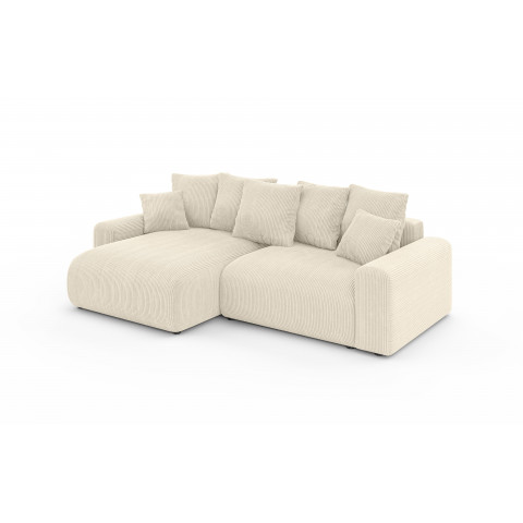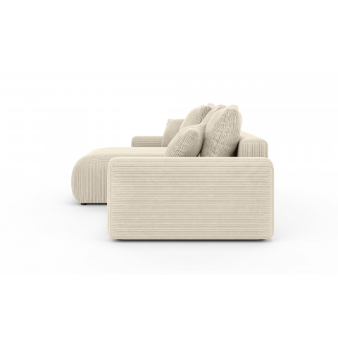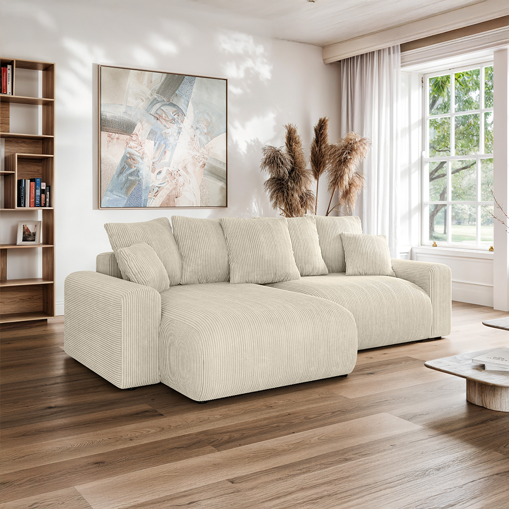 Niewątpliwą zaletą kremowego narożnika Cleo small jest jego funkcja spania. Mechanizm rozkładania umożliwia szybkie i wygodne przekształcenie go w pełnowymiarowe łóżko, idealne na co dzień lub podczas wizyt gości. Dodatkowym udogodnieniem jest pojemny schowek na pościel, który pozwala bez trudu przechować kołdry, poduszki czy koce, dbając o porządek w salonie i oszczędzając miejsce w szafach.