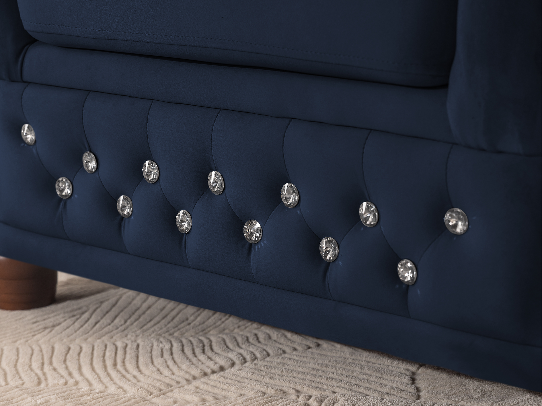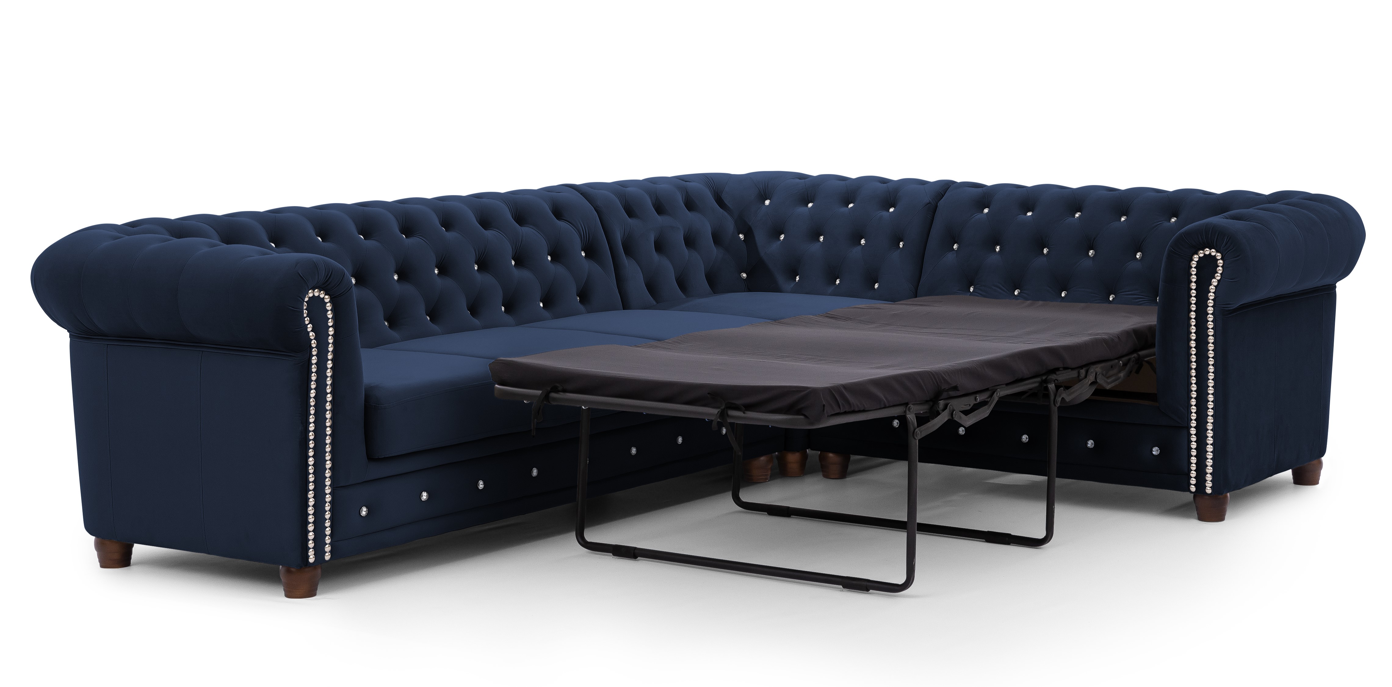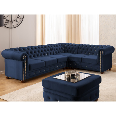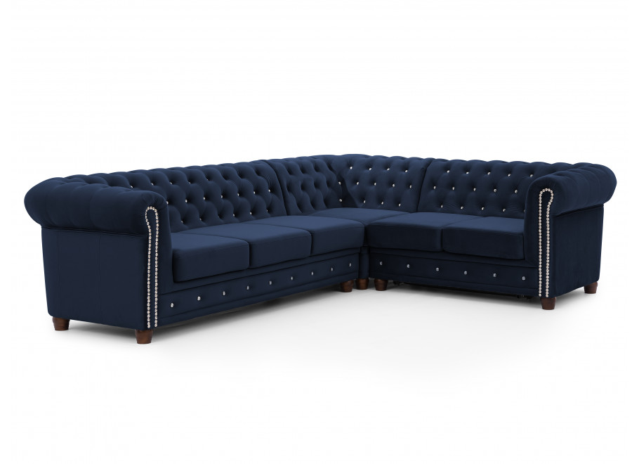 Granatowy narożnik Chesterfield FELIX BLINK to propozycja dla osób, które pragną wprowadzić do salonu nutę elegancji połączoną z nowoczesnym akcentem. Charakterystyczne, głębokie pikowanie zdobione kryształkami w złotym lub srebrnym kolorze przyciąga uwagę i sprawia, że mebel staje się ozdobą każdego wnętrza. Jego litera „L” nadaje przestrzeni funkcjonalności i podkreśla wyjątkowy charakter aranżacji.