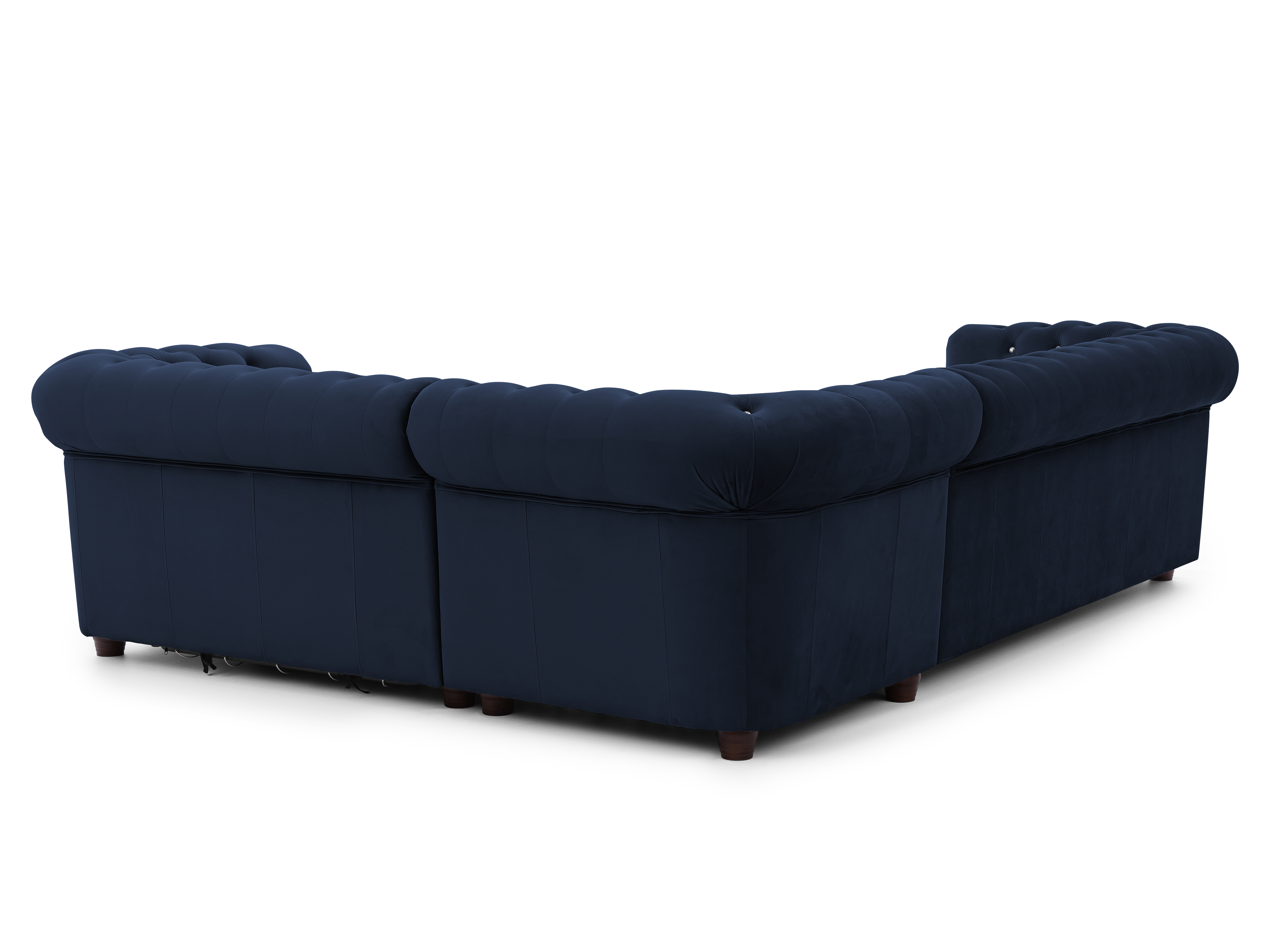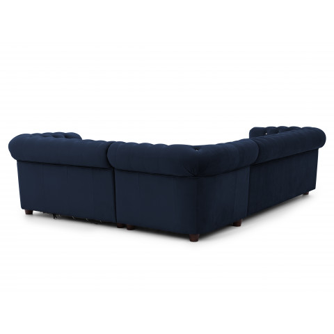 Granatowy welur dodaje narożnikowi szlachetności i elegancji. Ten kolor doskonale komponuje się z jasnymi dodatkami, wprowadzając do wnętrza kontrast i głębię. Dzięki pełnemu tapicerowaniu również od strony tylnej, mebel prezentuje się atrakcyjnie w każdym ustawieniu – w centrum salonu lub przy ścianie.